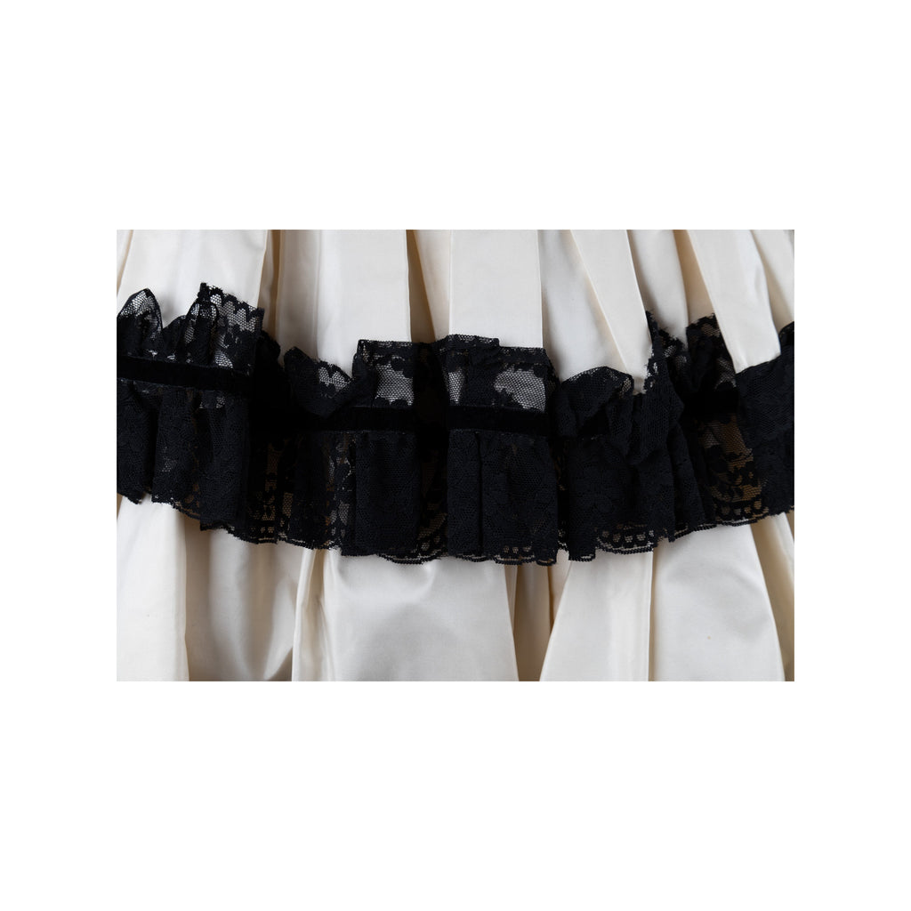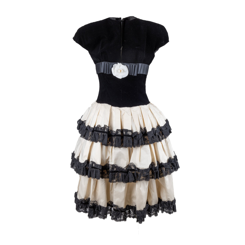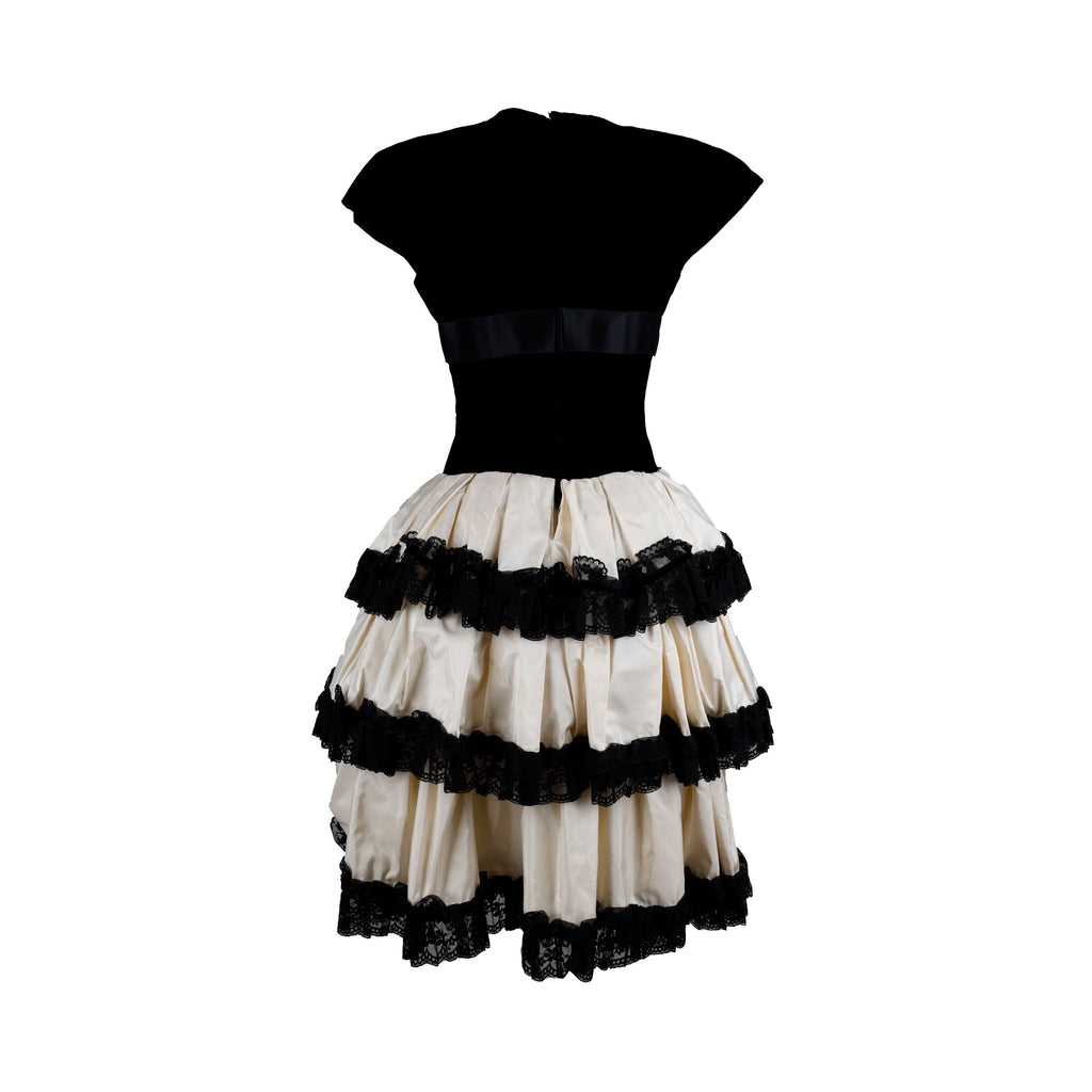 Indulge in timeless elegance with this sartorial pieces from the 90s. Handmade by Oriana Neri Sartoria, an Italian atelier, with exquisite attention to detail, this dress features a luxurious black velvet upper with delicate white flower satin ribbon for a touch of femininity. The lower waist is adorned with layers of lace trimmings, while a tulle underskirt adds volume for a glamorous silhouette.