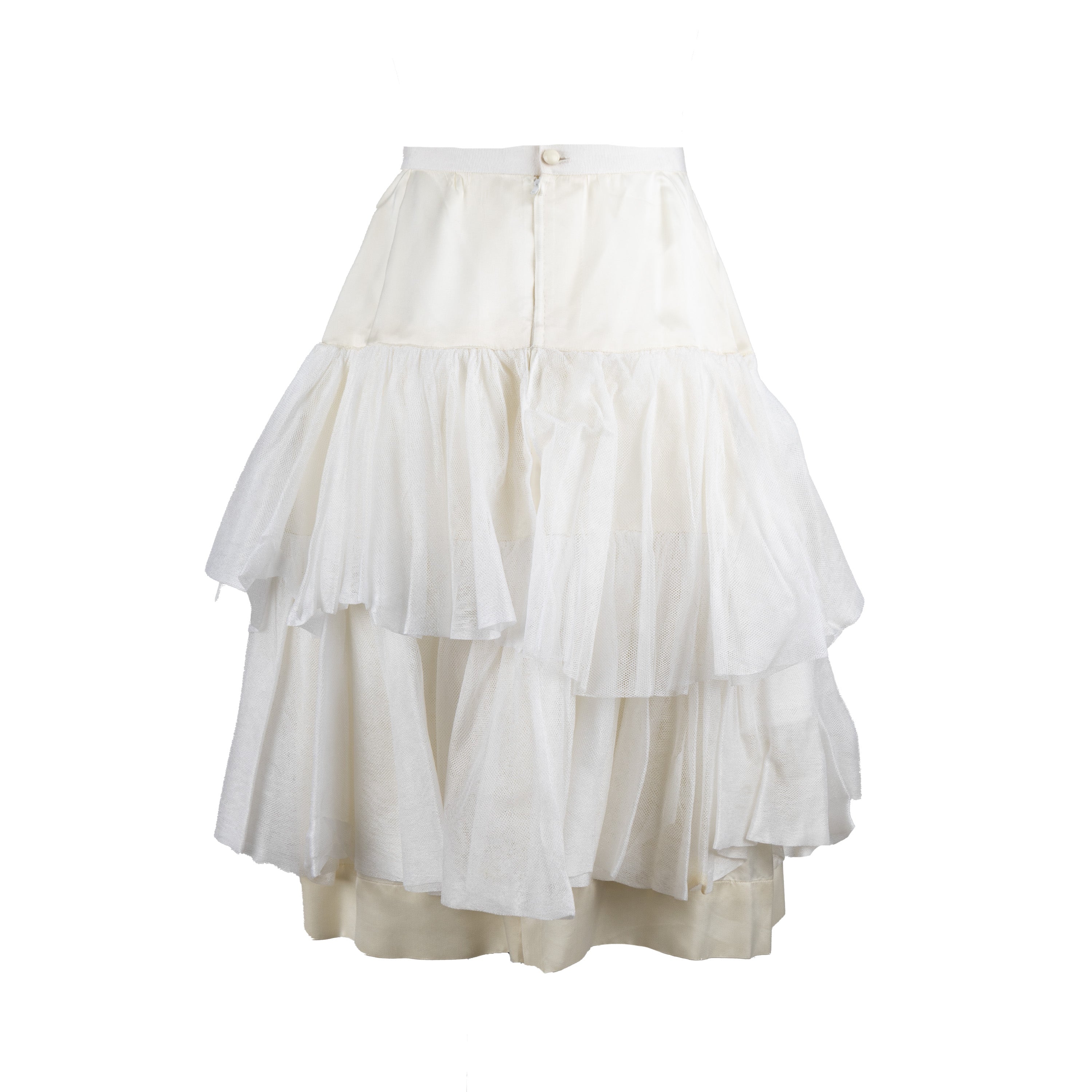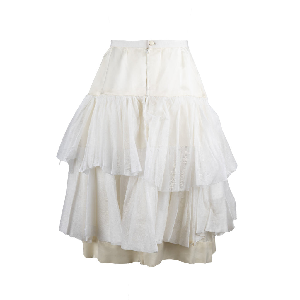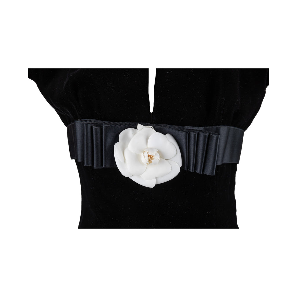 Indulge in timeless elegance with this sartorial pieces from the 90s. Handmade by Oriana Neri Sartoria, an Italian atelier, with exquisite attention to detail, this dress features a luxurious black velvet upper with delicate white flower satin ribbon for a touch of femininity. The lower waist is adorned with layers of lace trimmings, while a tulle underskirt adds volume for a glamorous silhouette.