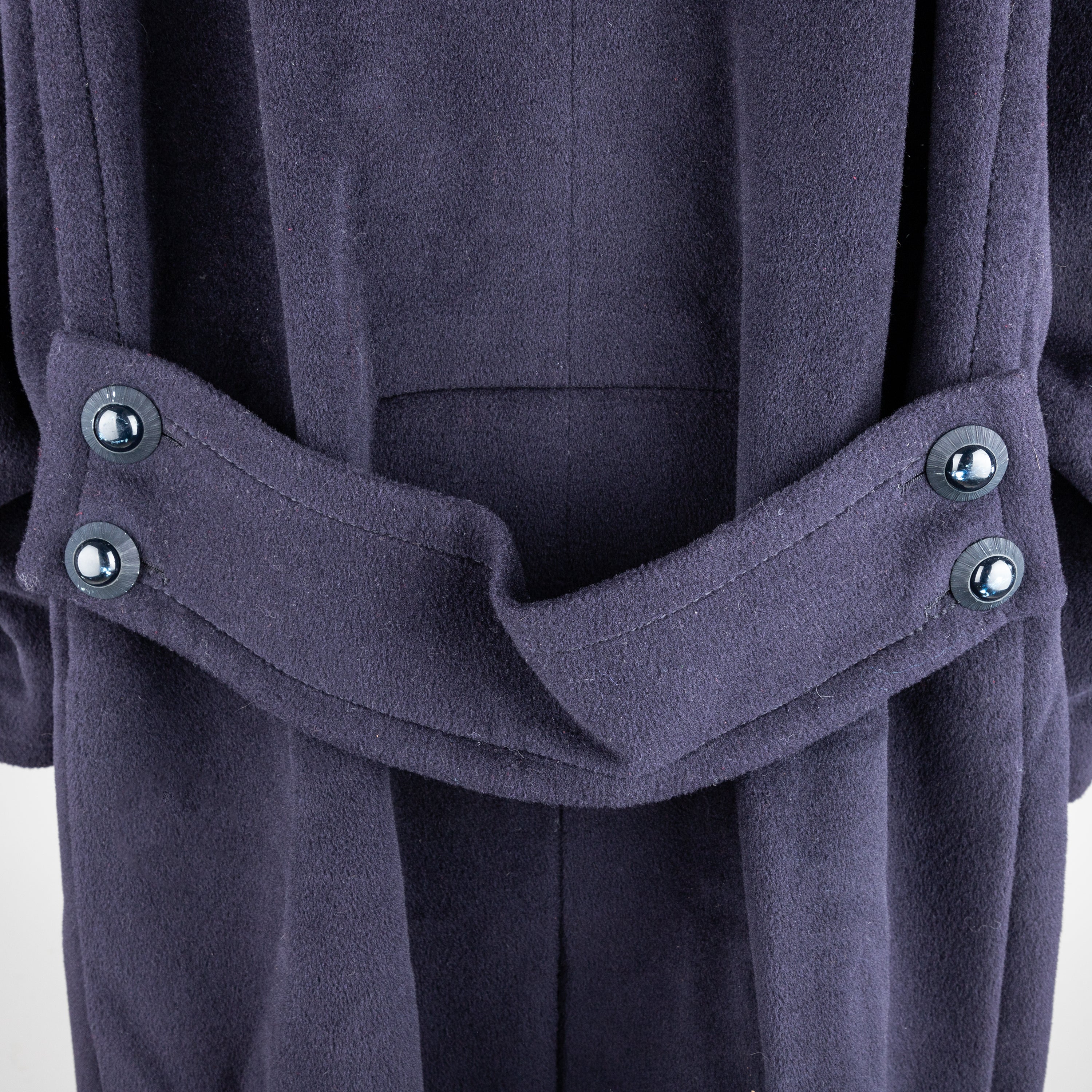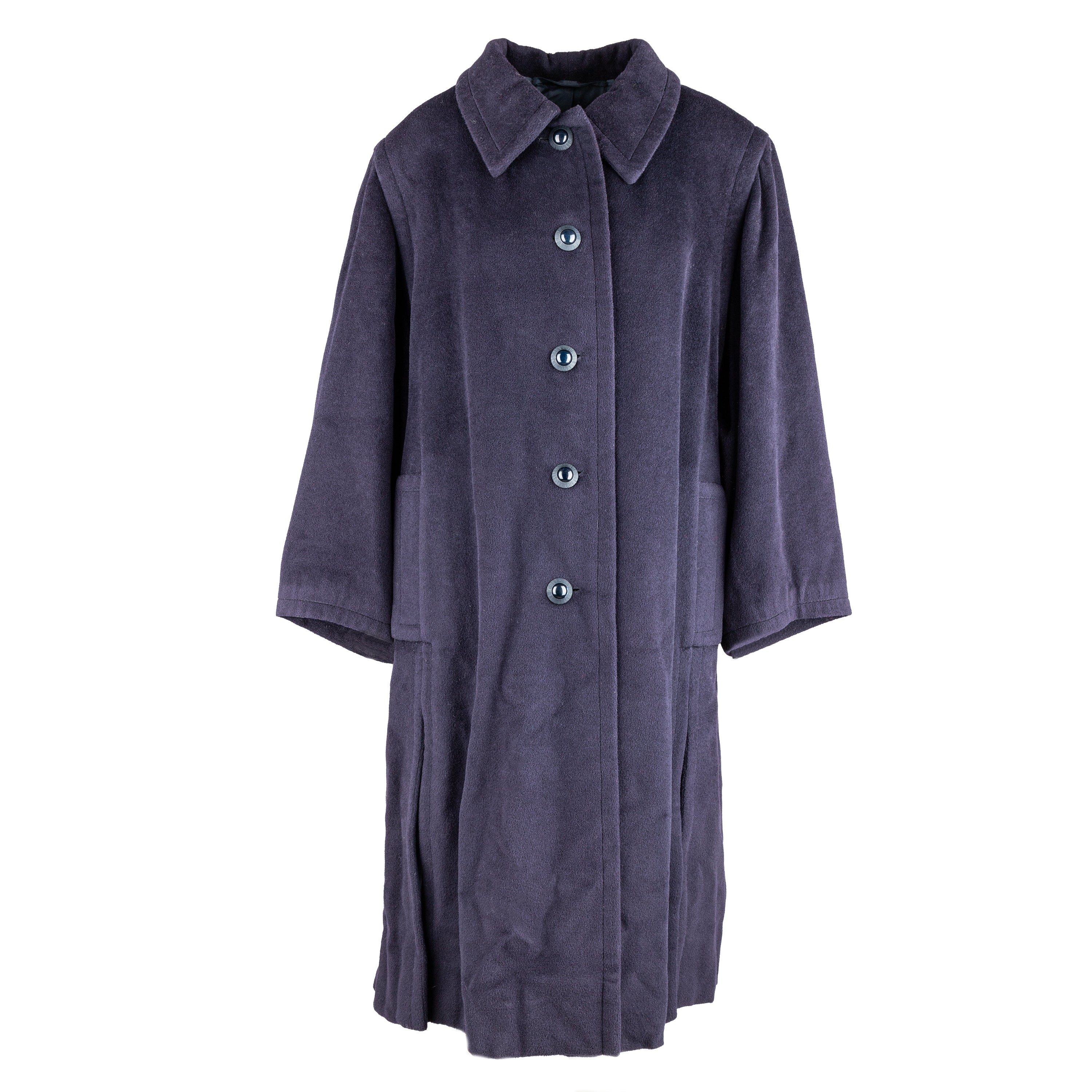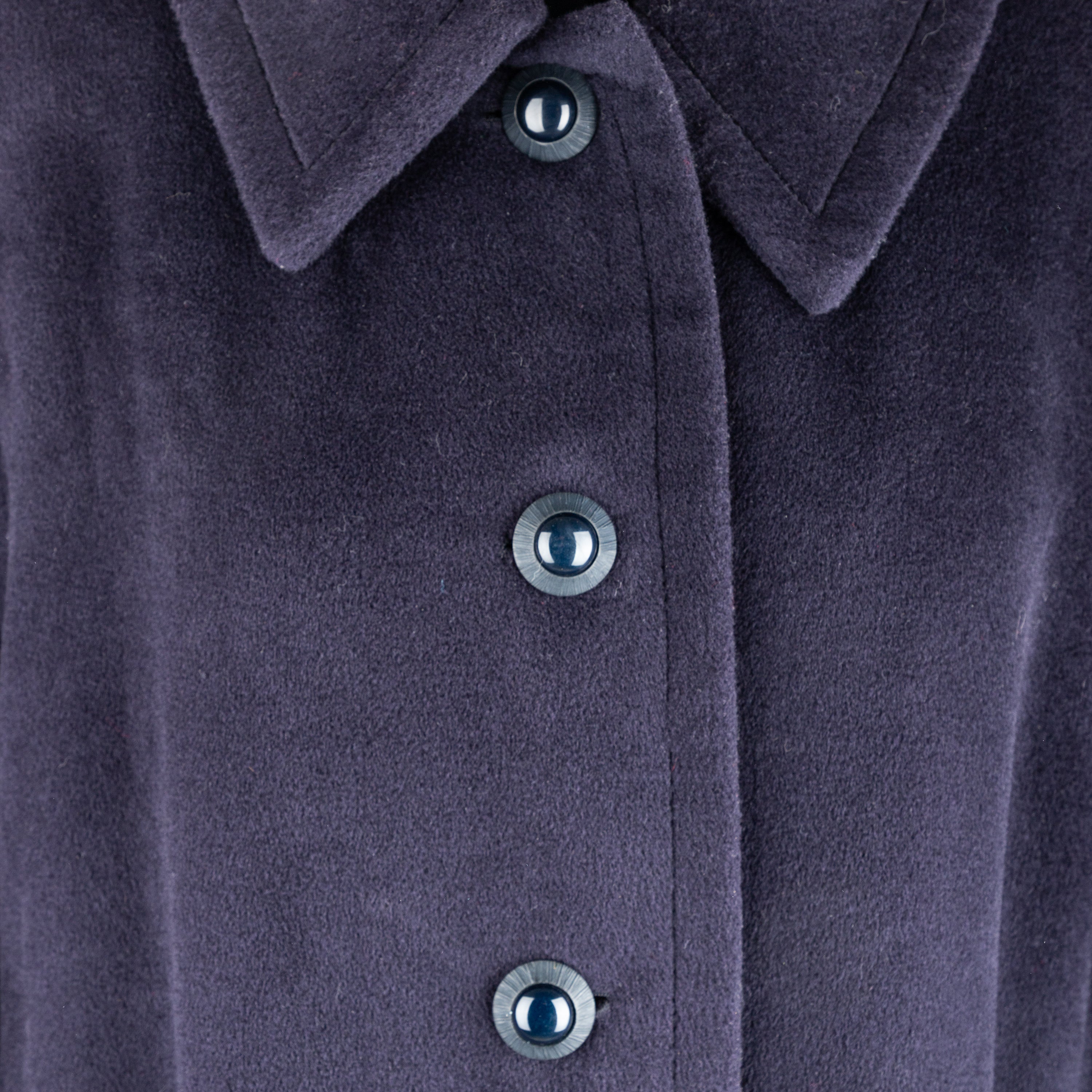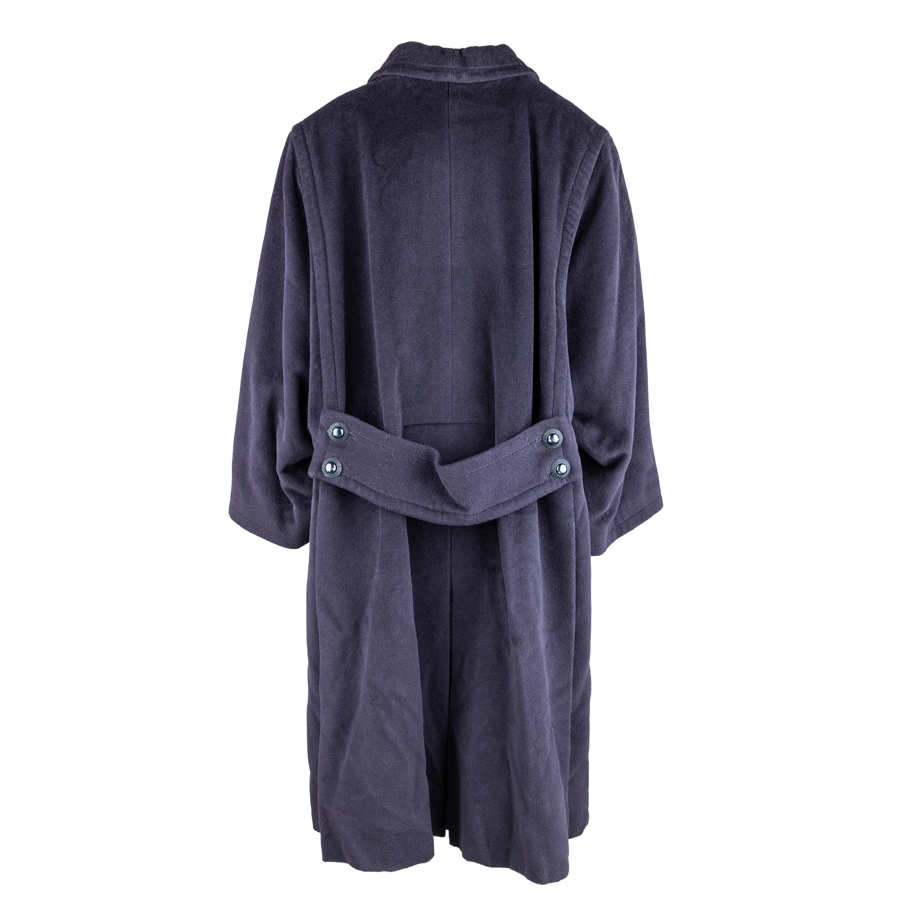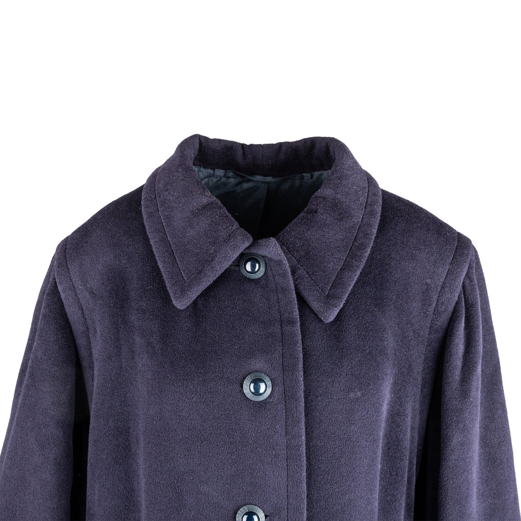 Crafted from a luxurious wool blend, this vintage overcoat brings a touch of elegance to any outfit. Its dark navy blue color and front button opening exude sophistication, while the soft fabric provides comfort. The wide belt accent at the back adds a stylish touch to this long coat.