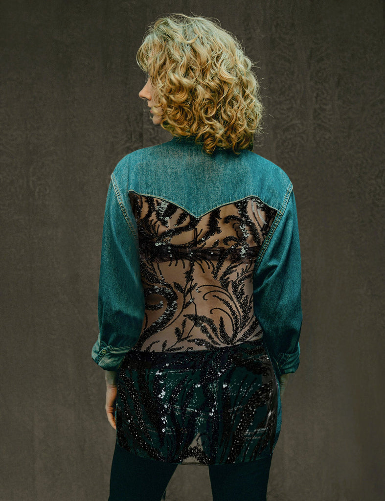 Party Back Shirt - Black Sequin - Blue Denim