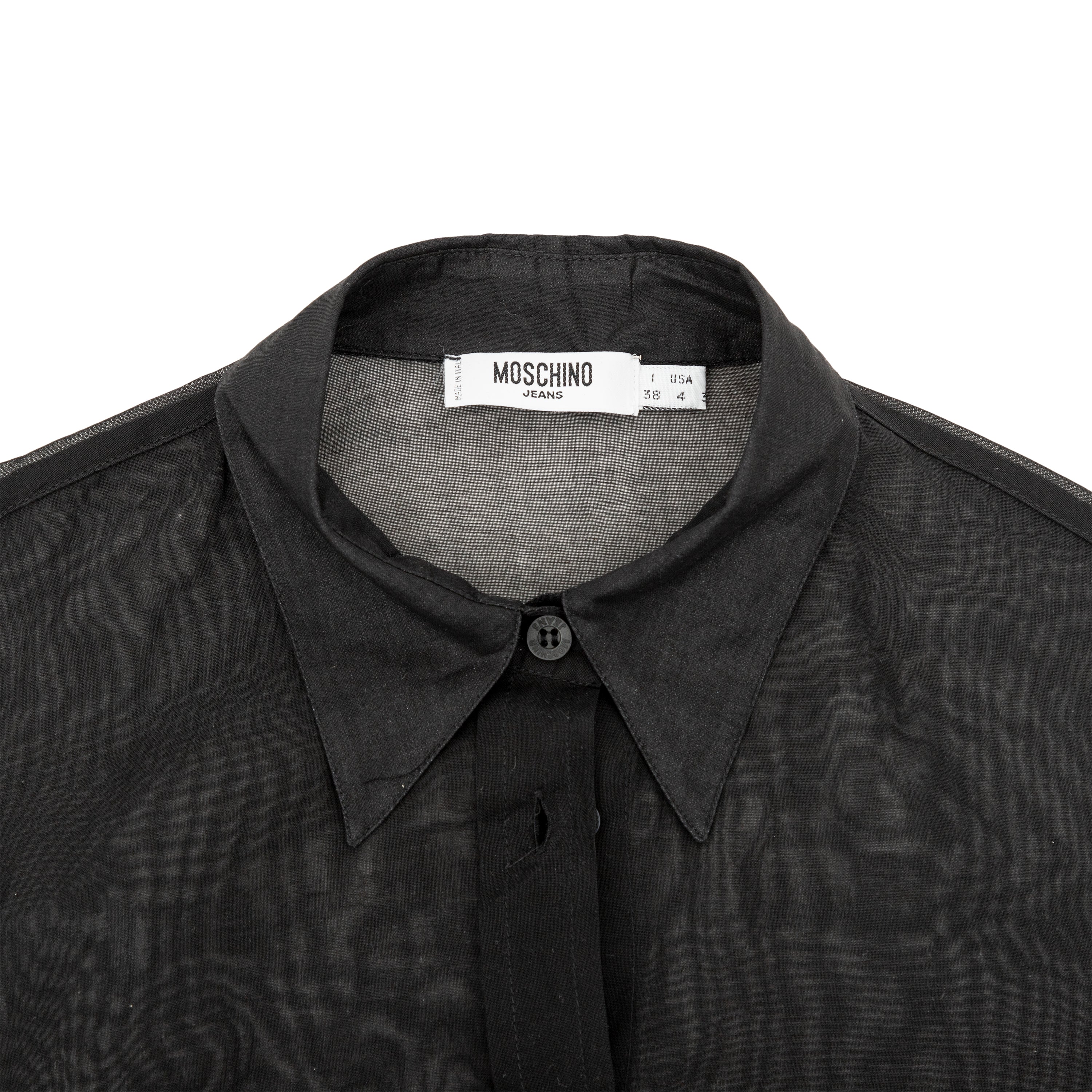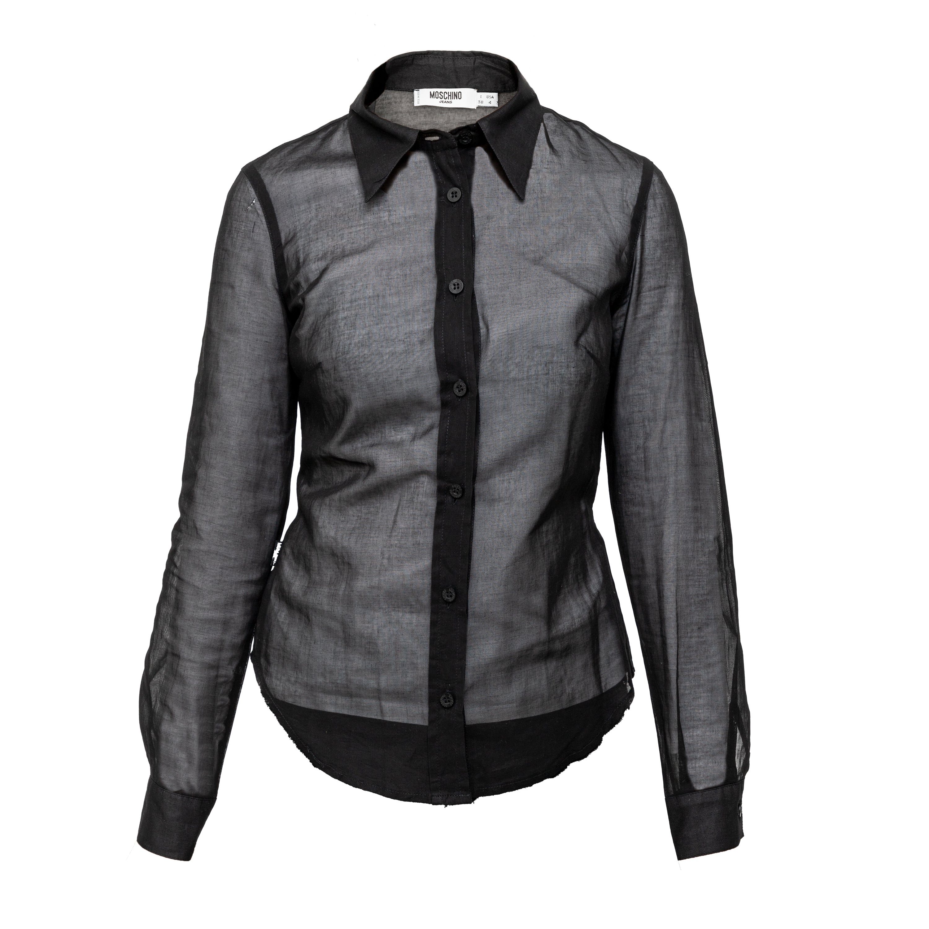 This black Moschino Jeans sheer shirt is a perfect blend of style and comfort. Made with sheer cotton, it features a fitted design with flattering pleats on the side. The shirt also has a classic collar and long sleeves, making it a versatile addition to any wardrobe.