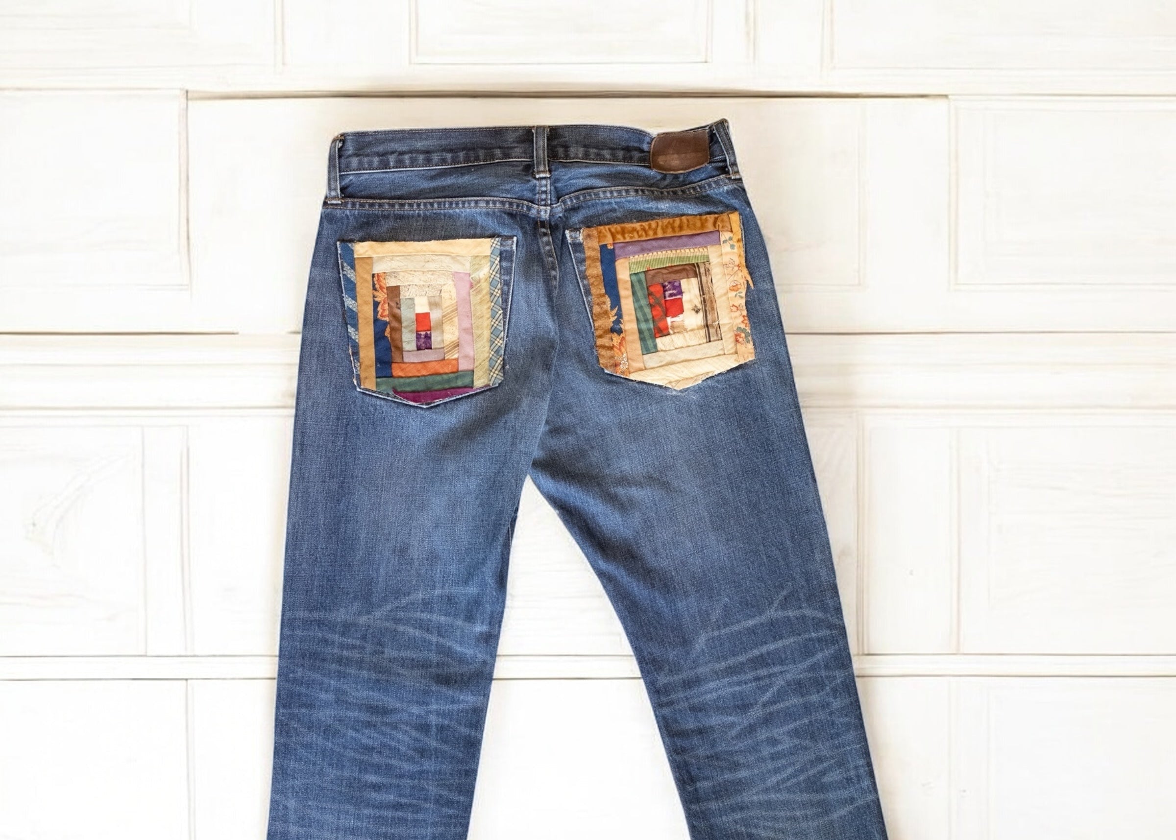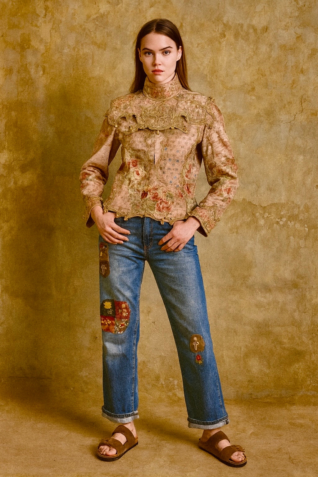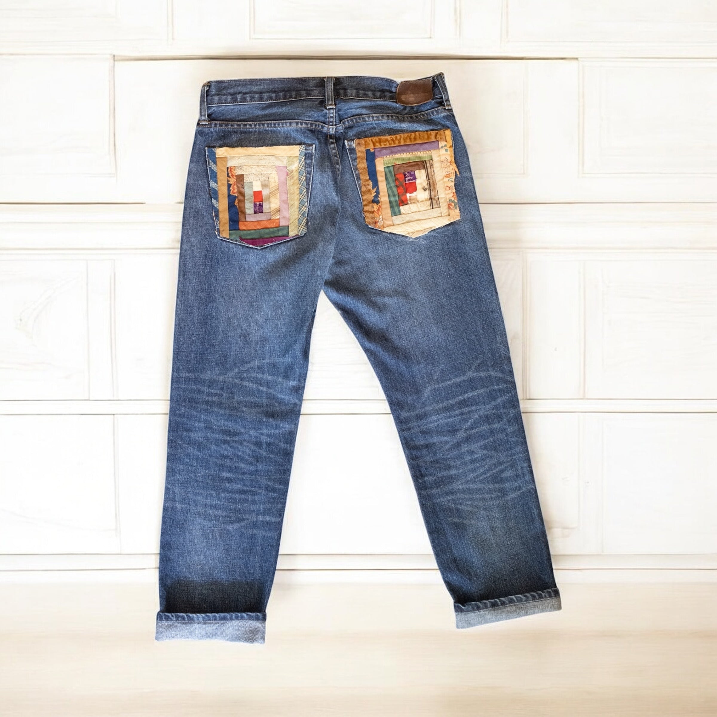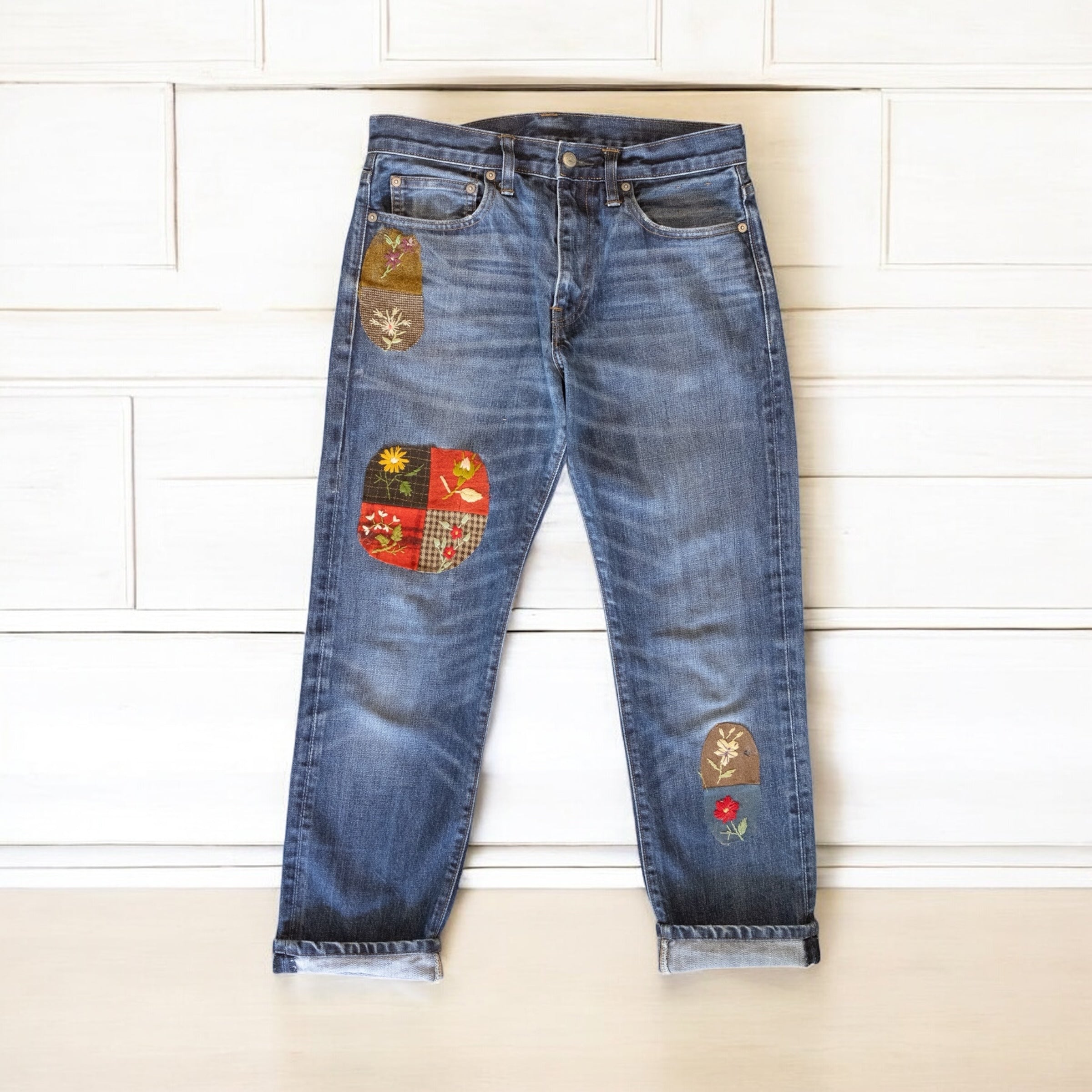 OV Denim, 70s jeans with Victorian hand embroidered patches