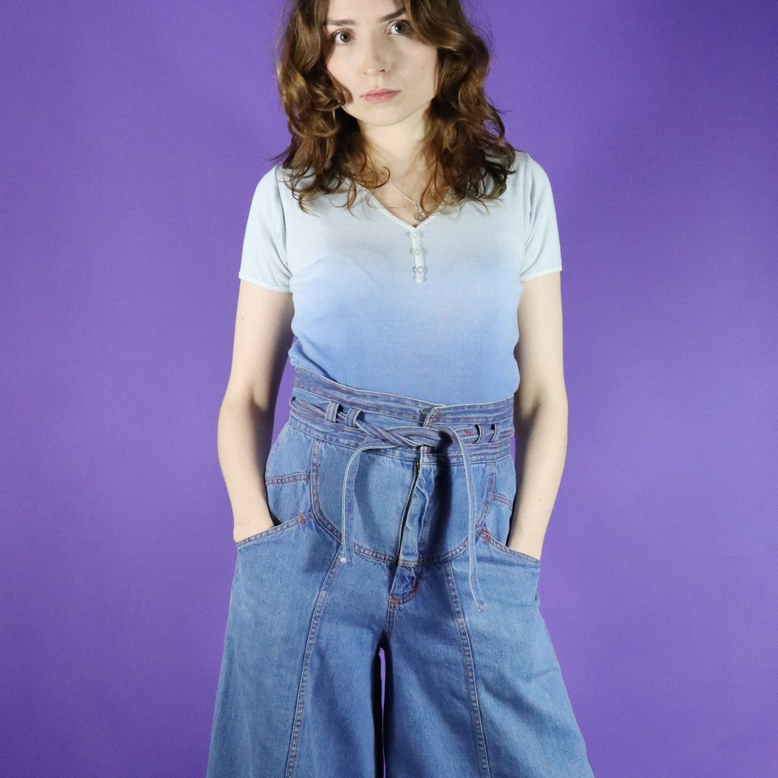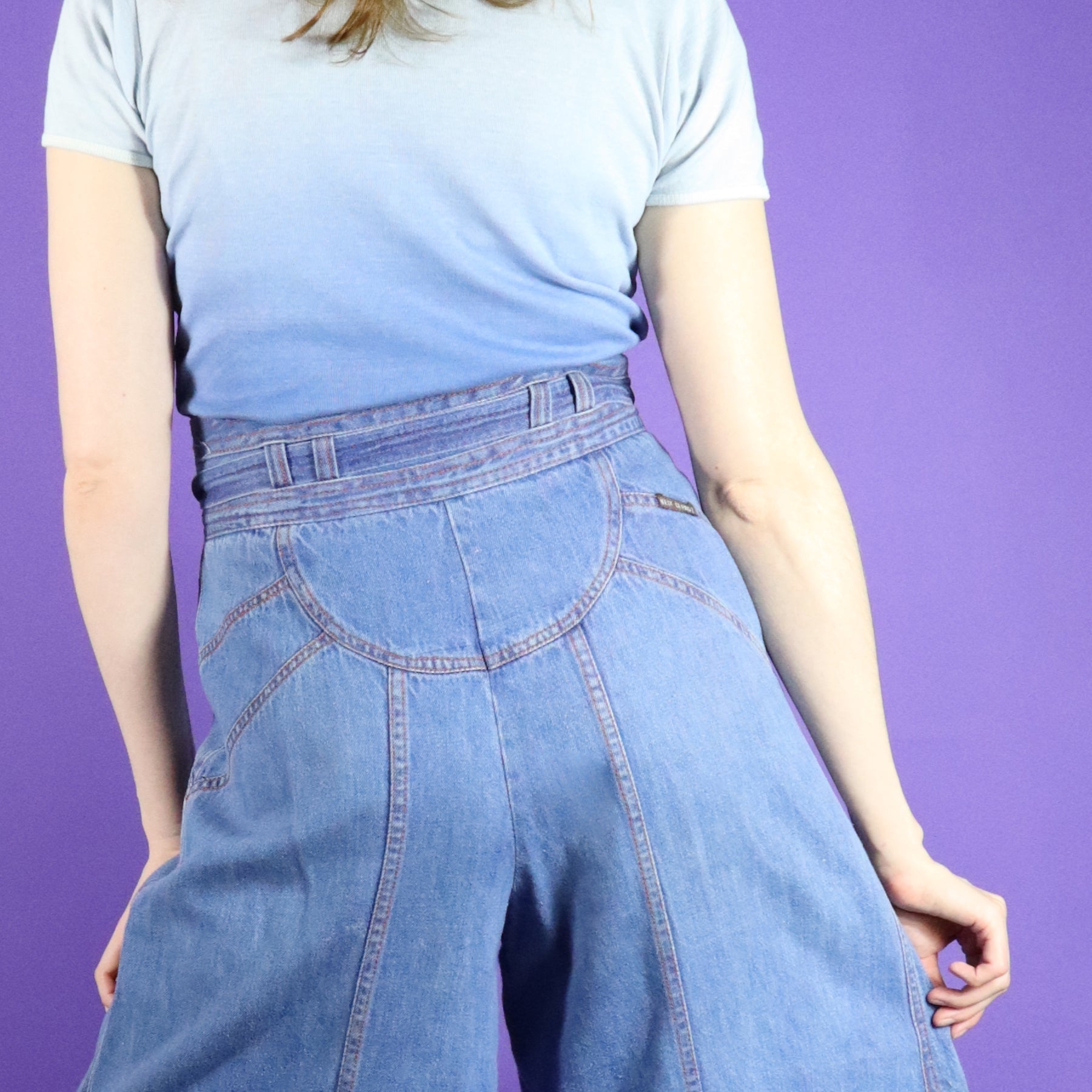 Beautiful vintage 1970s Culottes by iconic denim label 'N'est-ce Pas?'. Super soft, comfortable mid wash denim cut with a wide leg flare and iconic sunray panelling. The detailing on these cutlottes is incredible- I love the articulated pockets, tie waistband & A-line shape. N'est-ce Pas? jeans are super hard to come by and expertly made- I love these worn with knee high boots or clogs!