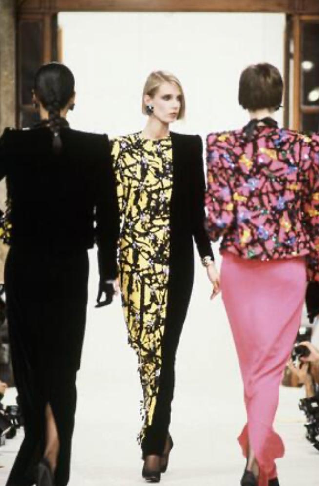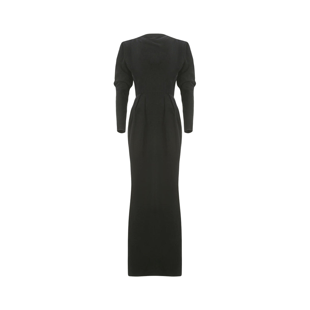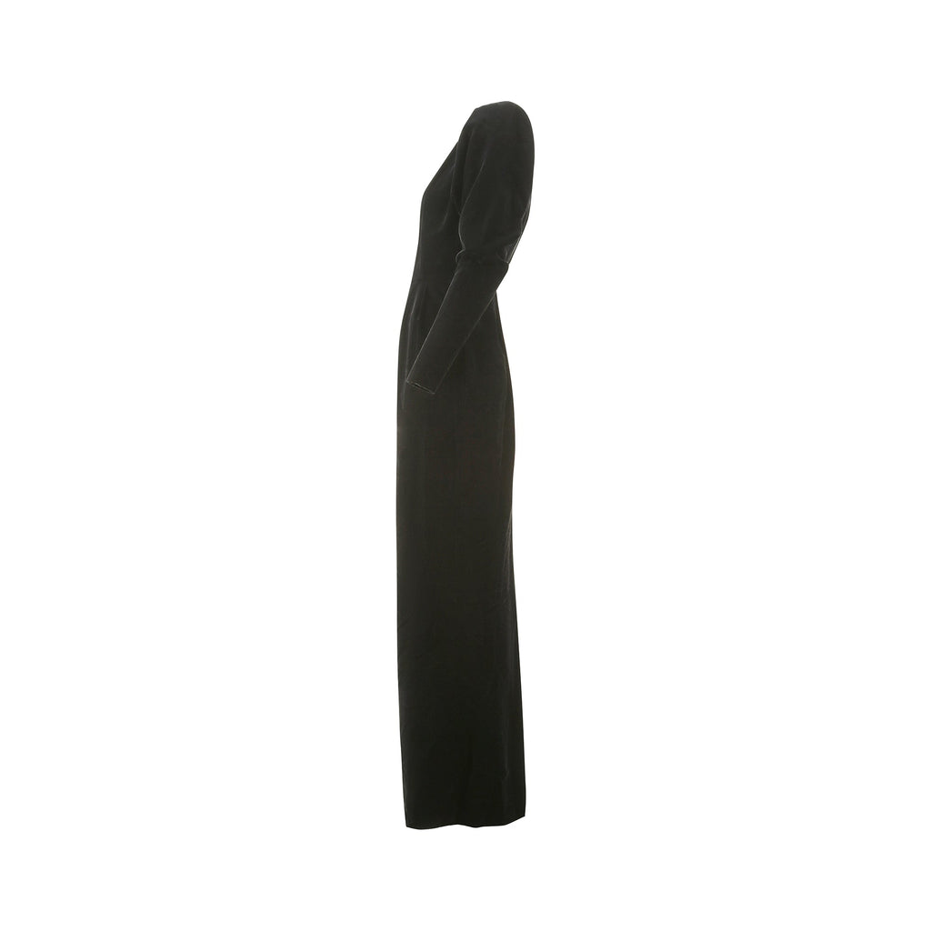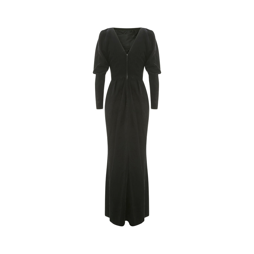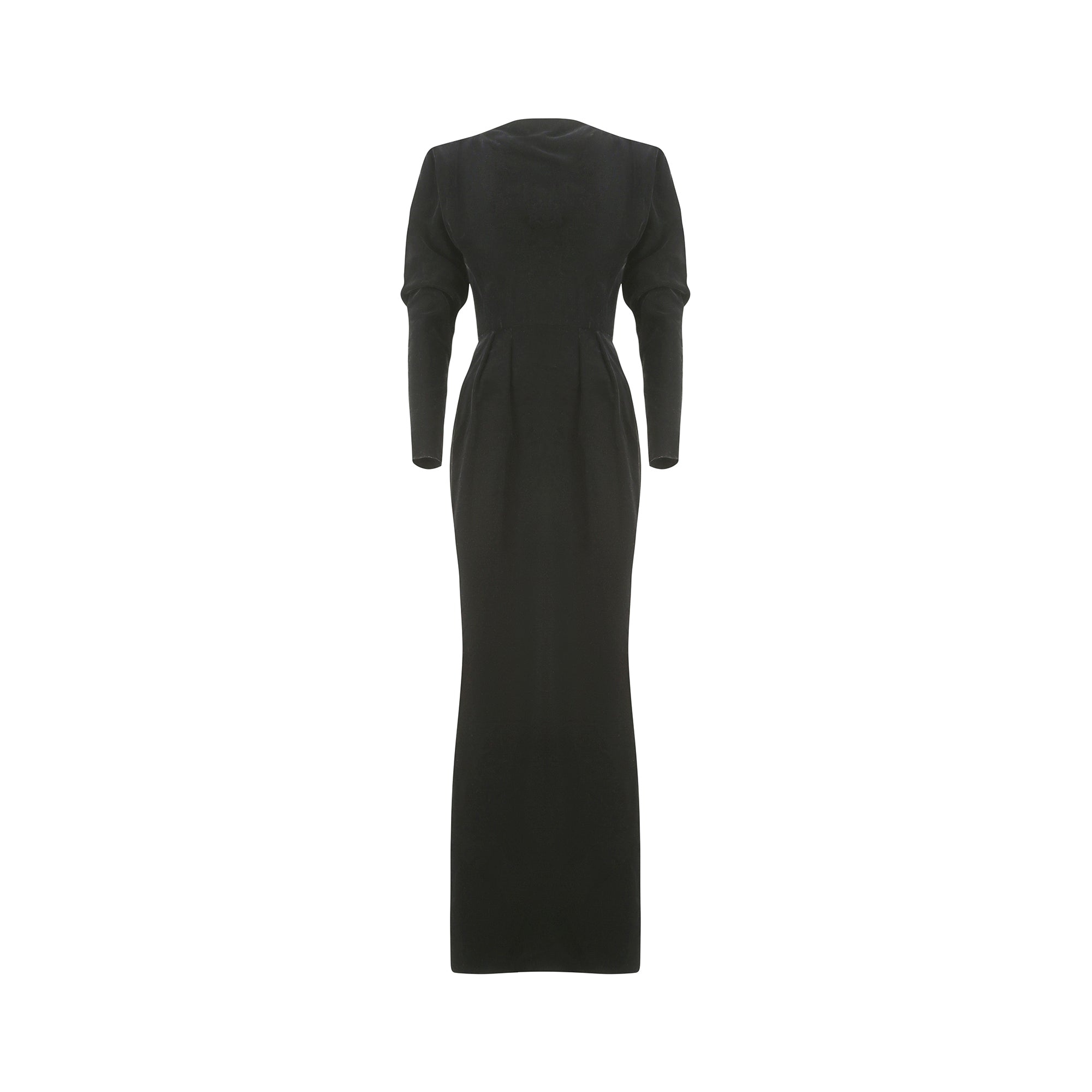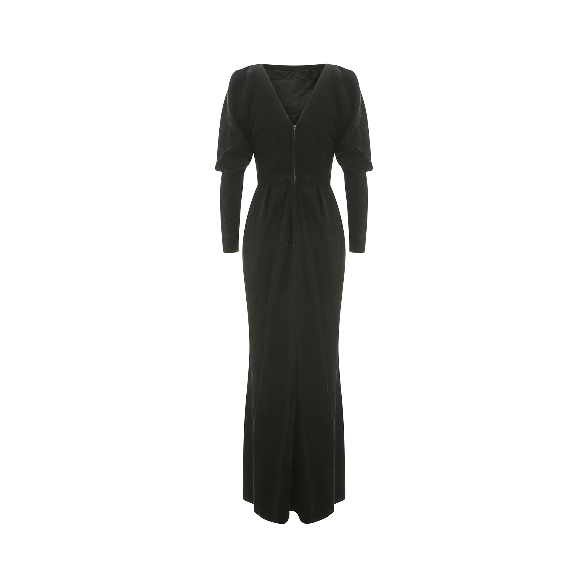 Bought alongside other labelled Dior haute couture pieces, we believe this elegant black velvet gown to also be a Christian Dior haute couture dress from the 1984 / 1985 fall winter collection. We have attached a runway shot from this presentation showing a very similar designed gown and what appears to be the back of a suit in the same fabric. The dress is wonderfully crafted with many hand-finished details and it showcases the fashion house’s tailoring know-how. A deceptively simple piece that you will wear time and time again, it has a flattering nipped-in waist and fishtail skirt with soft pleats at the rear. Zips at each cuff mean this piece is easy to put on and allow the tight cuffs and contrasting, billowing shoulders to form a dramatic shape. A playful addition which, along with the V-back, set this piece apart.