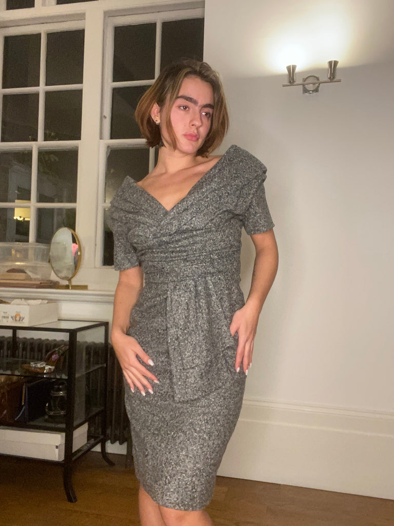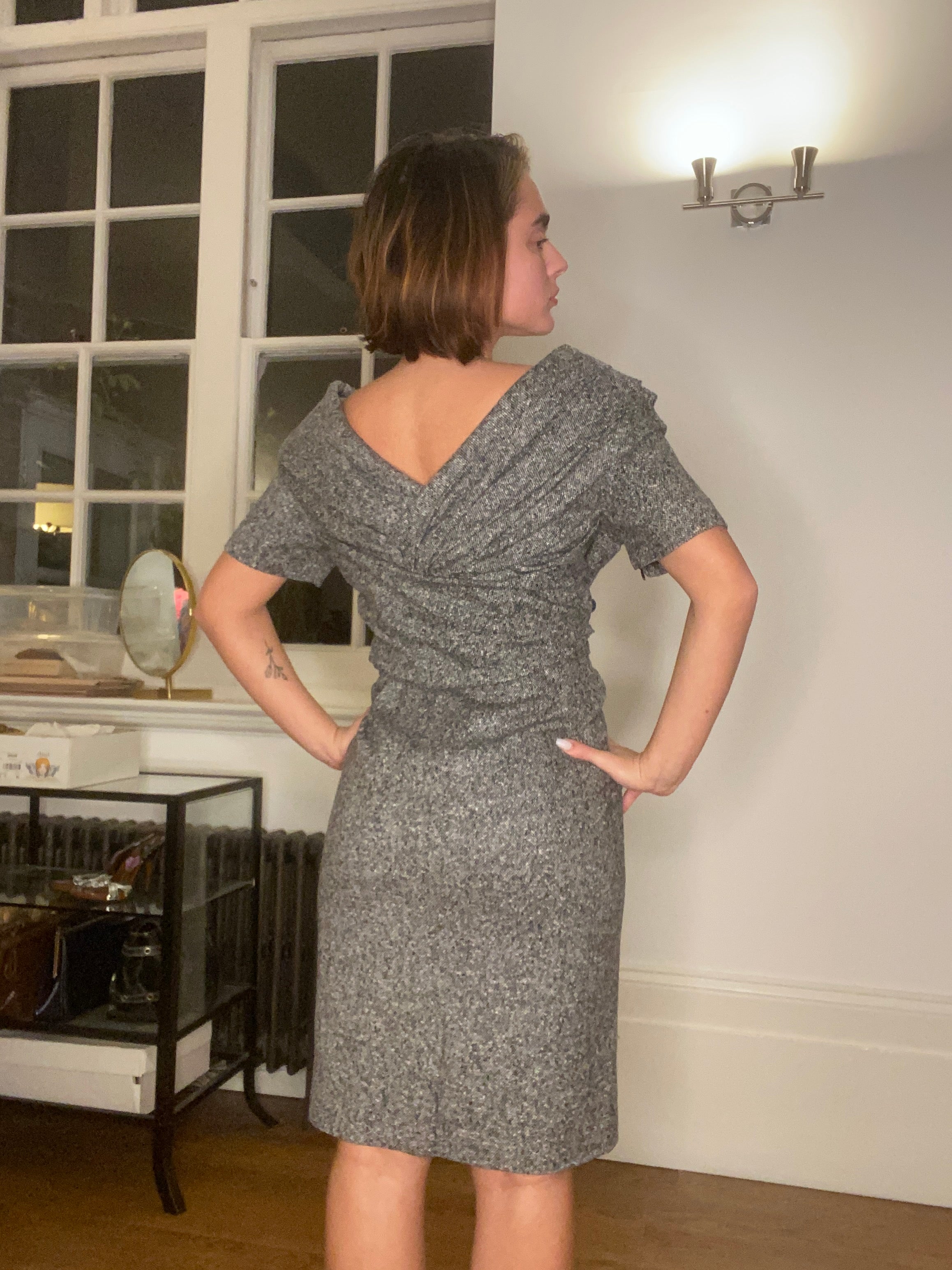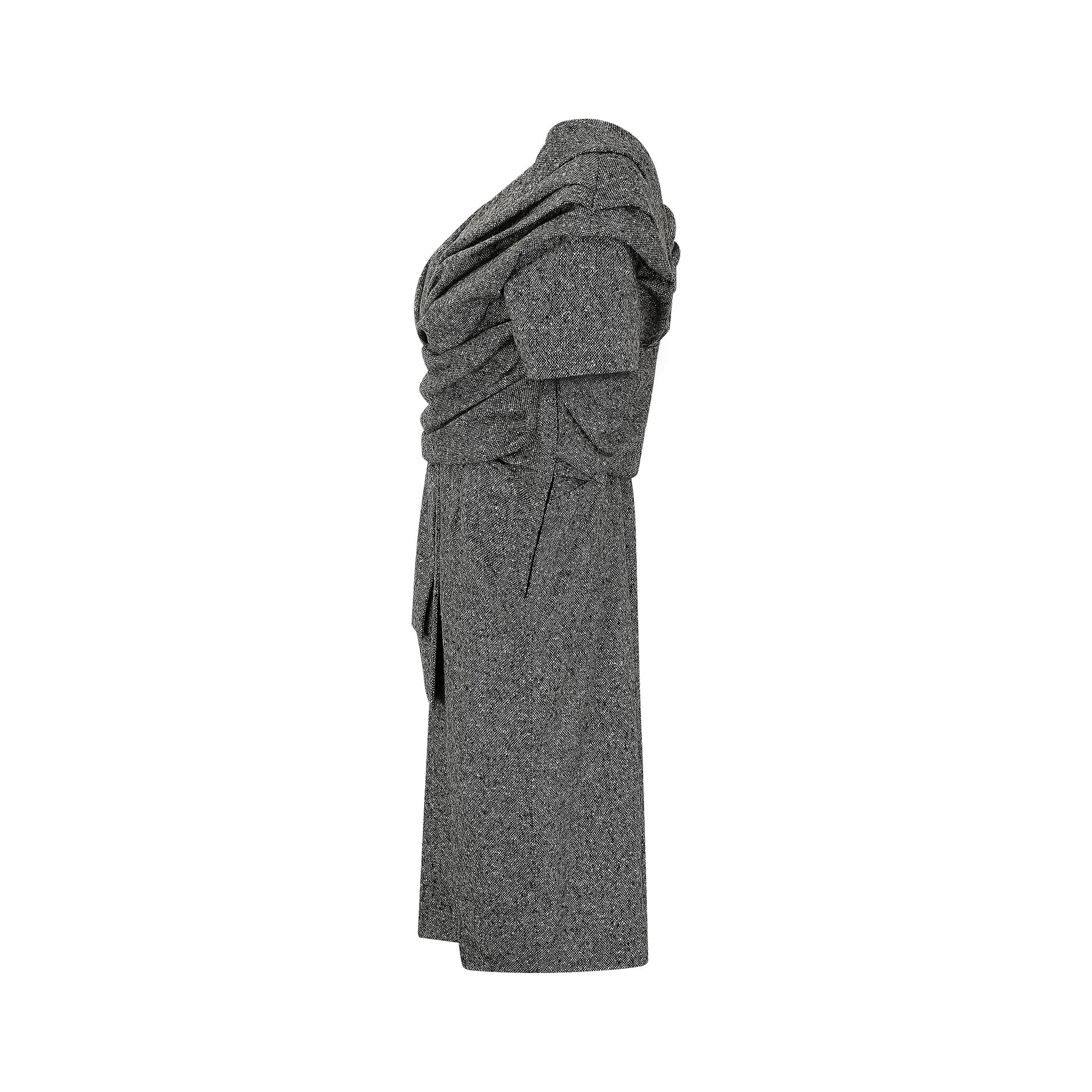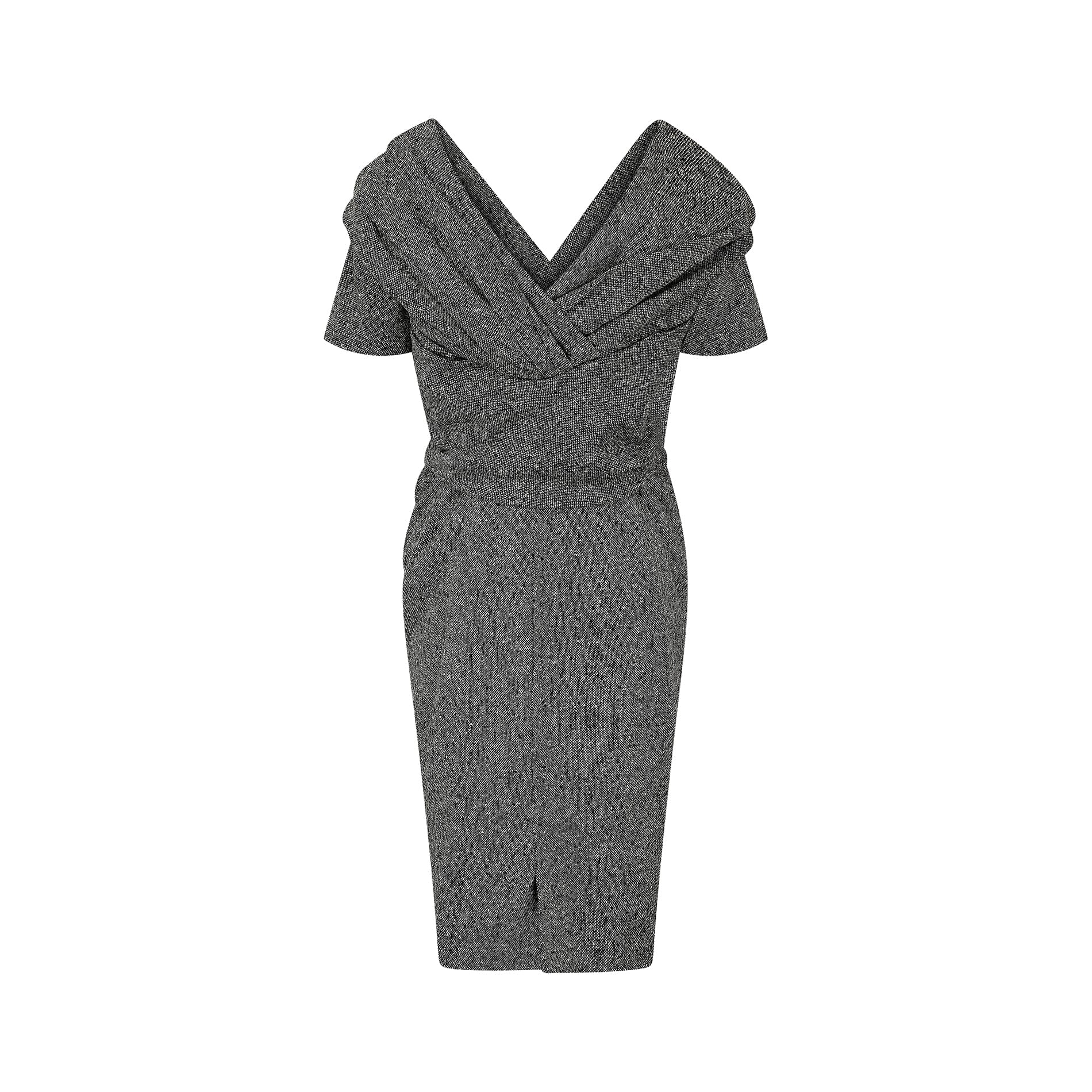 Crafted from a soft grey wool tweed, this dress is a timeless piece which will never go out of style, whatever the season. It features a beautiful deep V neckline to both front and back, with short, gathered sleeves to really enhance that classic Dior hourglass shape. The dress is lined with luxurious black silk and fastens on the left hand side seam with a discreet zip closure. It narrows at the waist with draped fabric details, mirroring the effect created by the sleeves. The skirt is cut in a traditional pencil shape, complete with double sash detail to the front, with the first section backed in the same black silk as the interior. The dress is in truly fabulous vintage condition, and looks barely worn. Although it is labelled a UK 16, it would best fit a UK 12-14, or US 8-10.