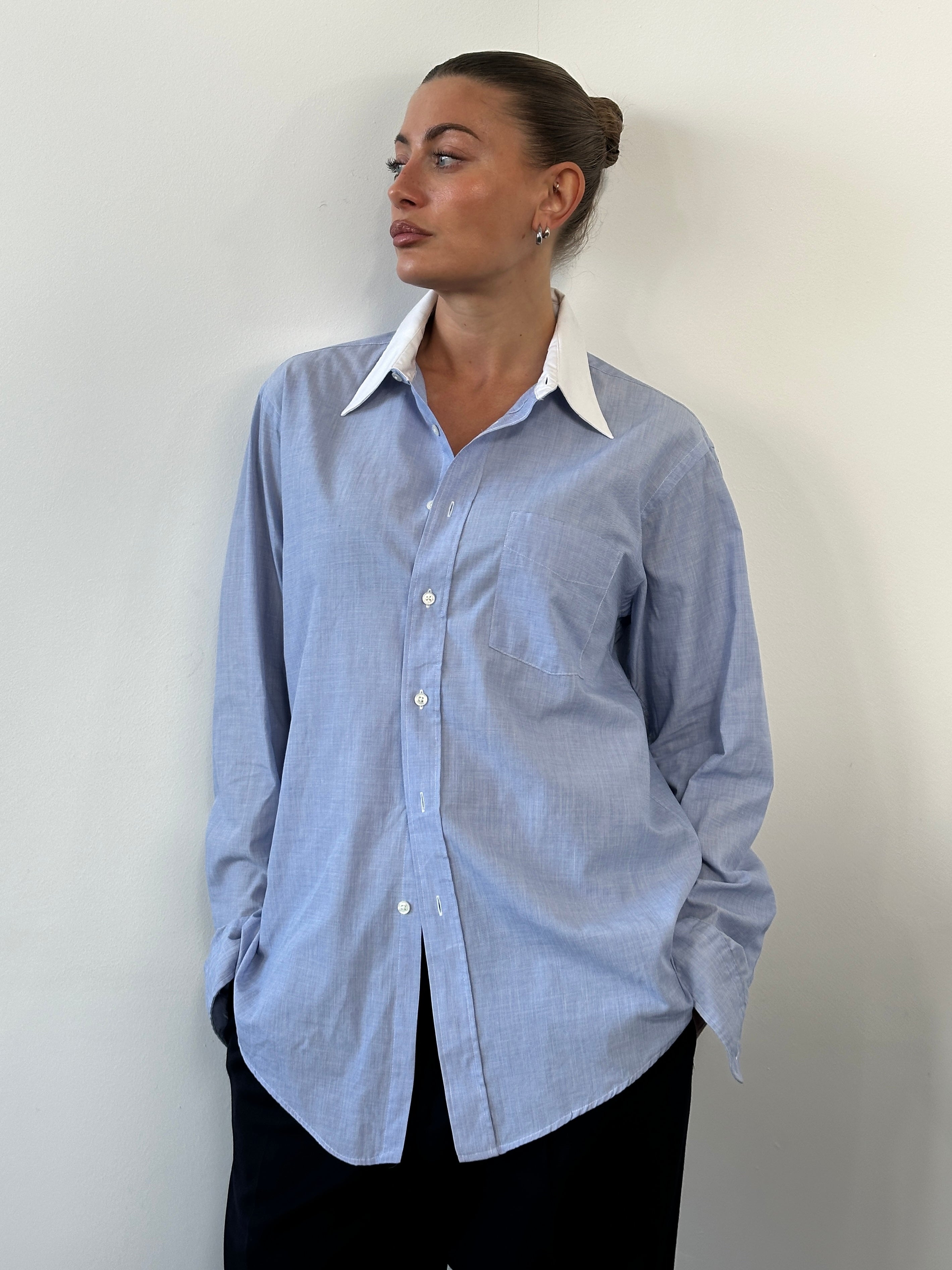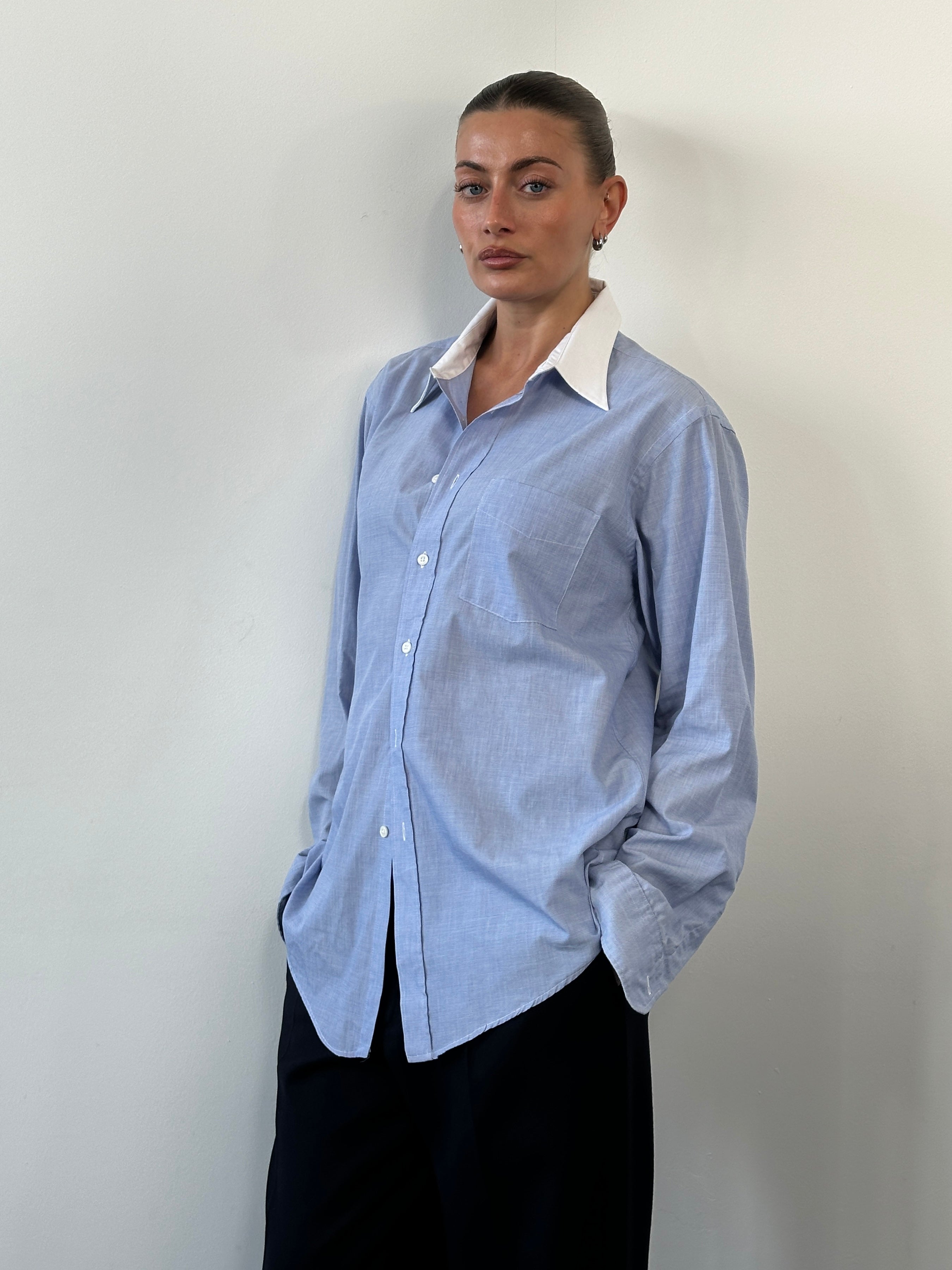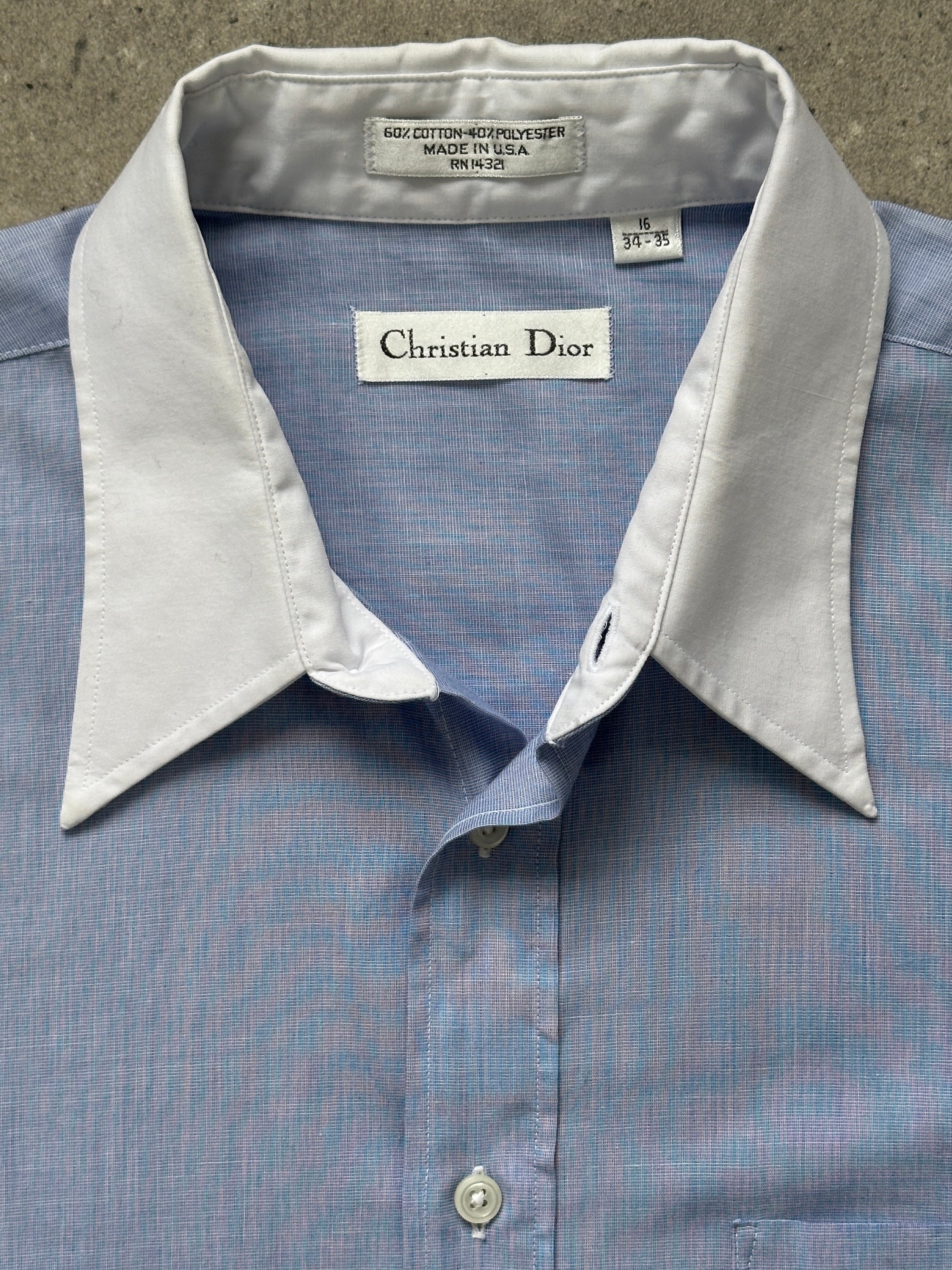 A light blue vintage Christian Dior shirt with a crisp white contrast collar and a clean, structured silhouette. Cut with a relaxed straight fit through the body and finished with a single chest pocket, this piece reflects classic late 1980s to early 1990s menswear styling with an understated, timeless feel.