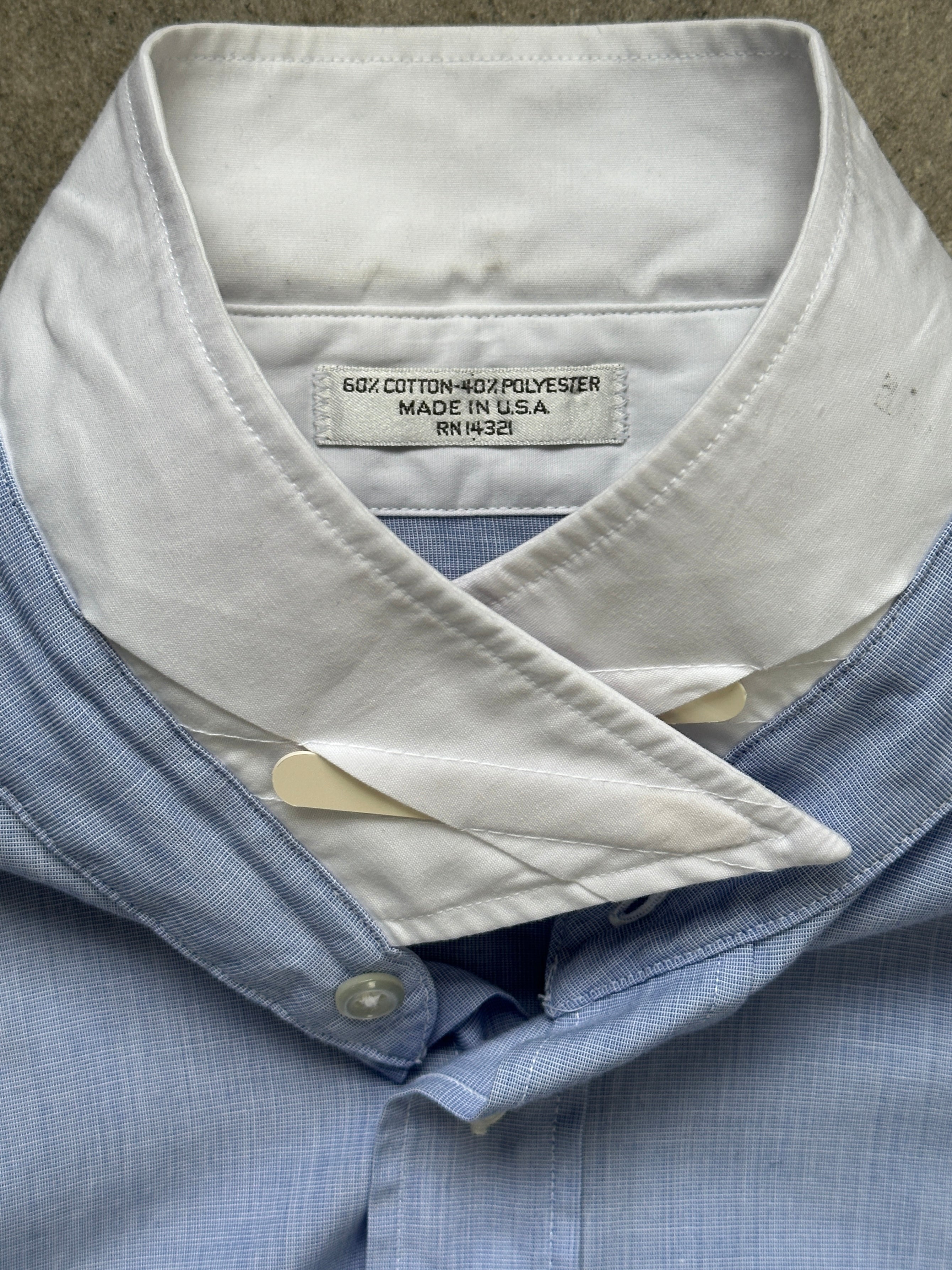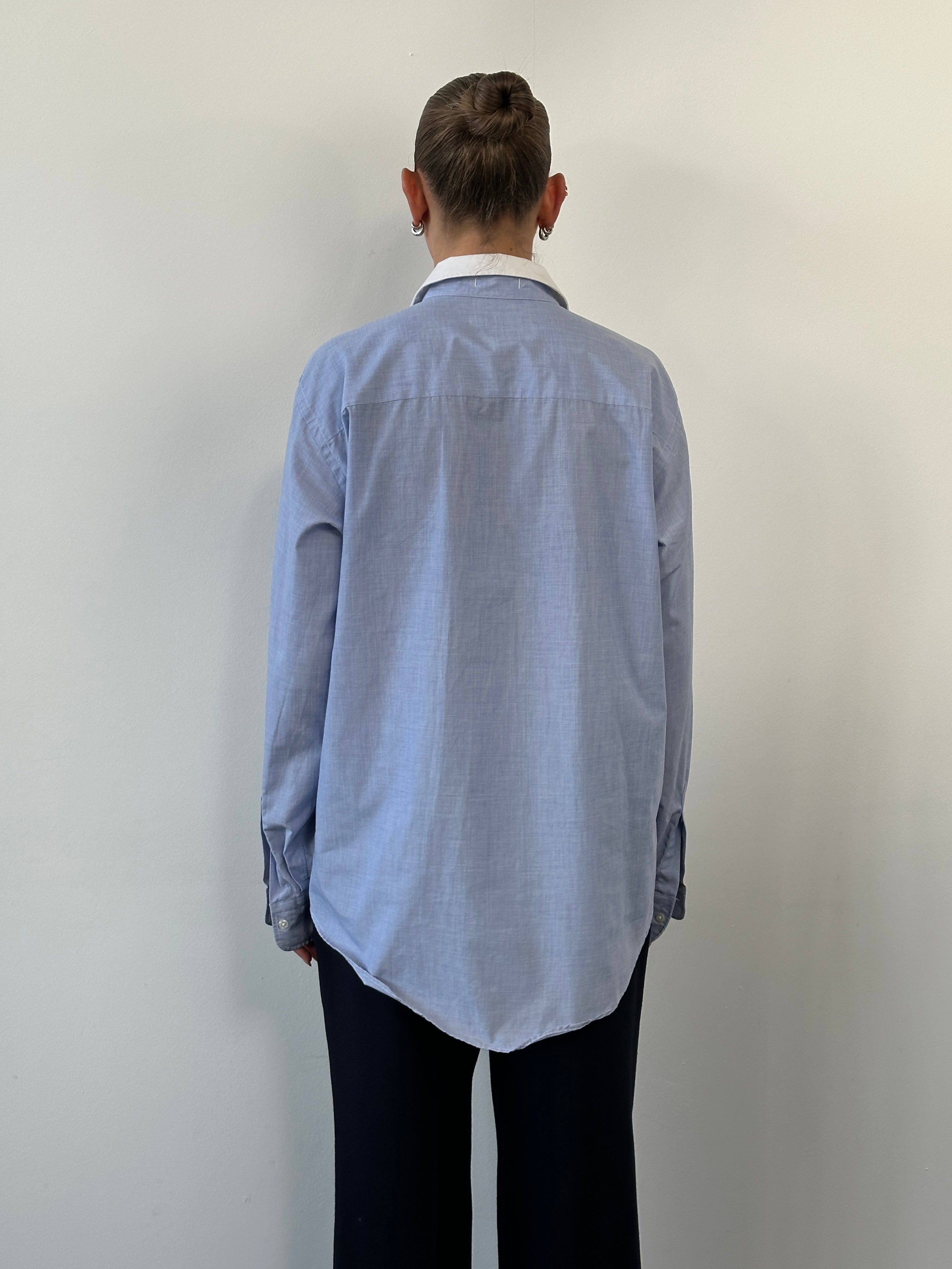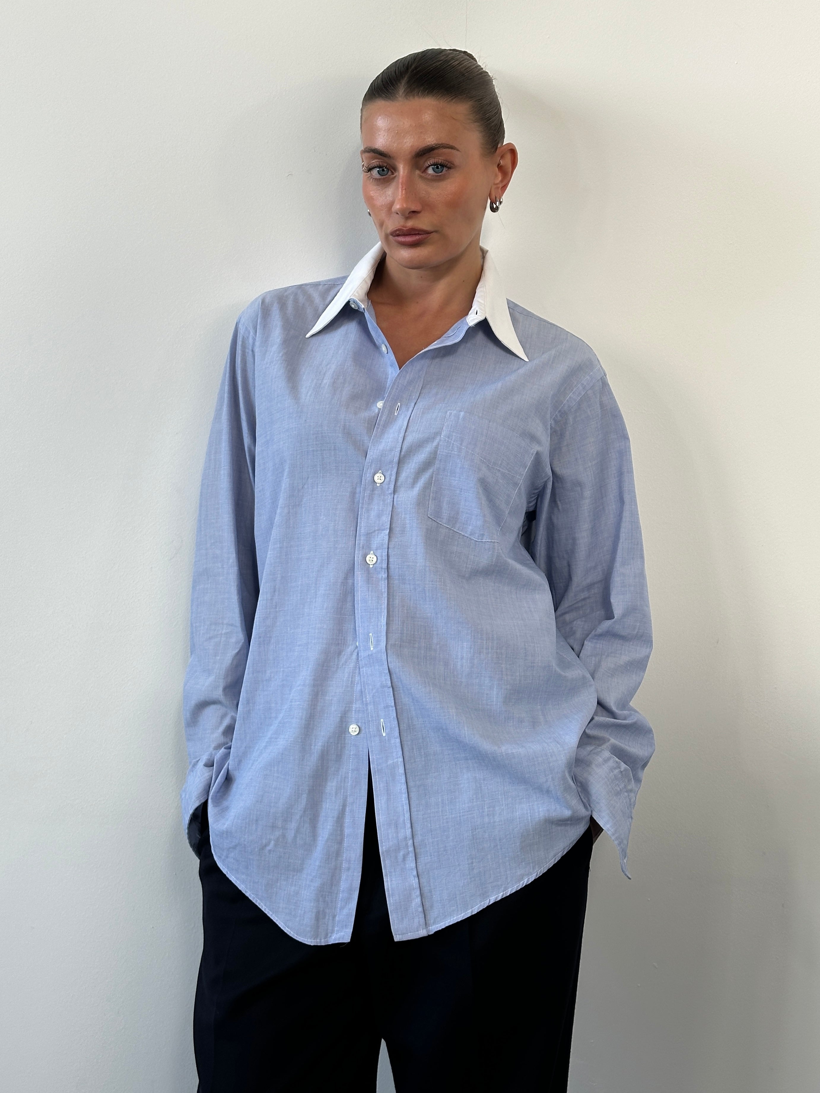 A light blue vintage Christian Dior shirt with a crisp white contrast collar and a clean, structured silhouette. Cut with a relaxed straight fit through the body and finished with a single chest pocket, this piece reflects classic late 1980s to early 1990s menswear styling with an understated, timeless feel.
