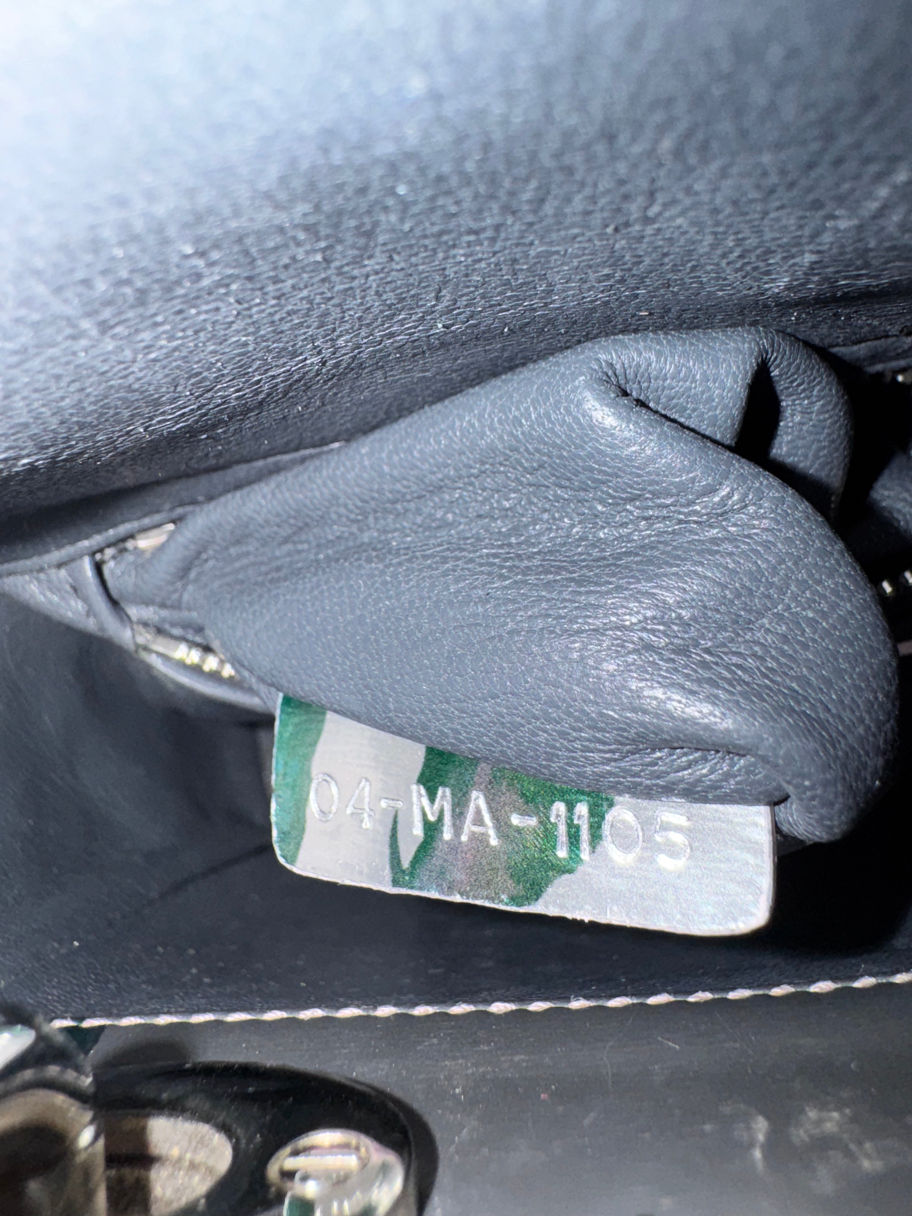 Rare mini Lady Dior from Raf Simons’ tenure at Dior, crafted in metallic silver calfskin with a painted green botanical floral overlay. Features the signature silver-tone D.I.O.R. charms, structured top handles, and includes the original long Raf Simons shoulder strap, making this a complete collector-level set.