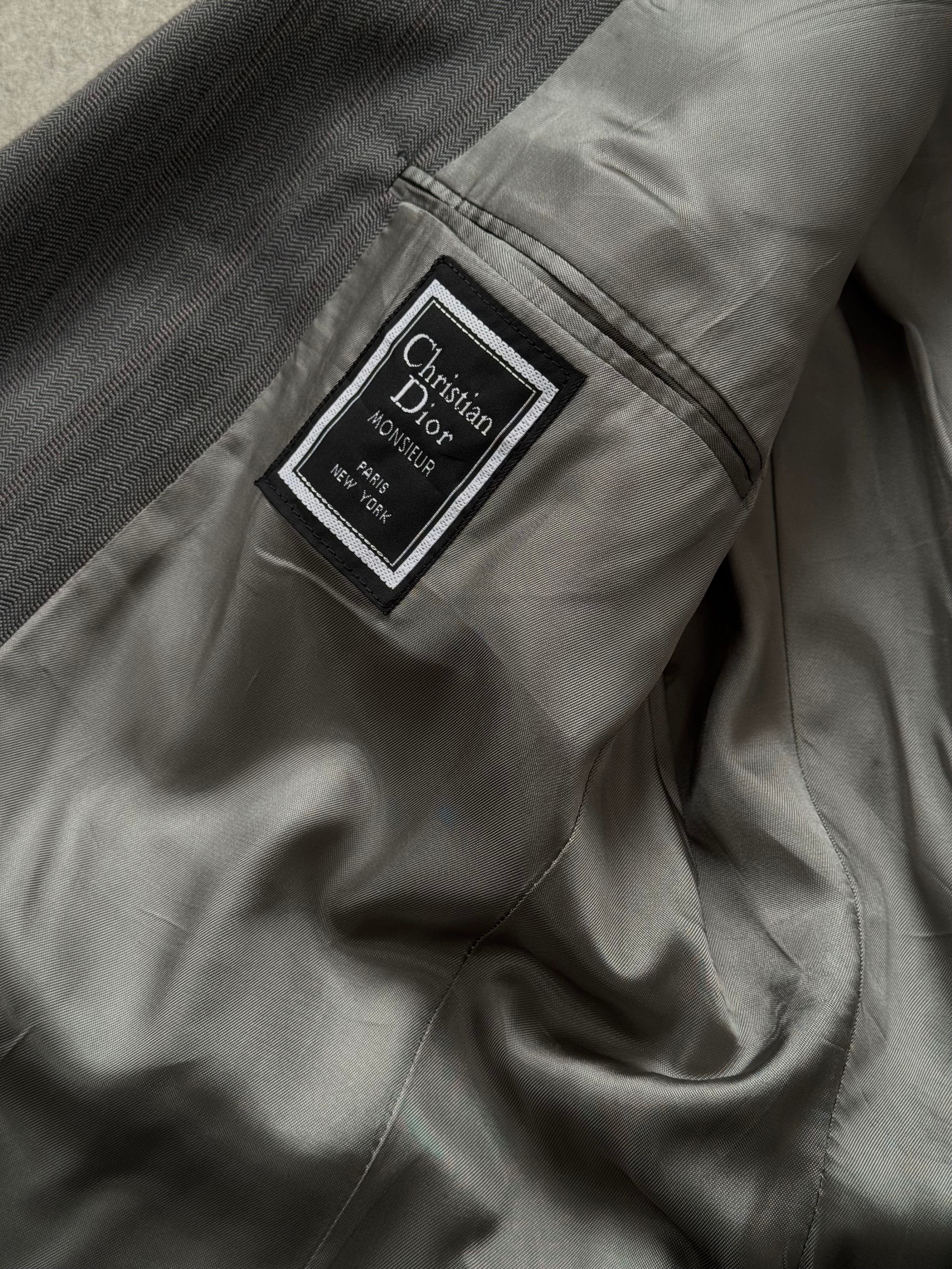 A light grey vintage Christian Dior Monsieur blazer with a subtle faint red vertical stripe and classic tailored structure. Cut with structured shoulders, notch lapels and a straight relaxed fit, it reflects late 1980s menswear proportions with clean, understated detailing.