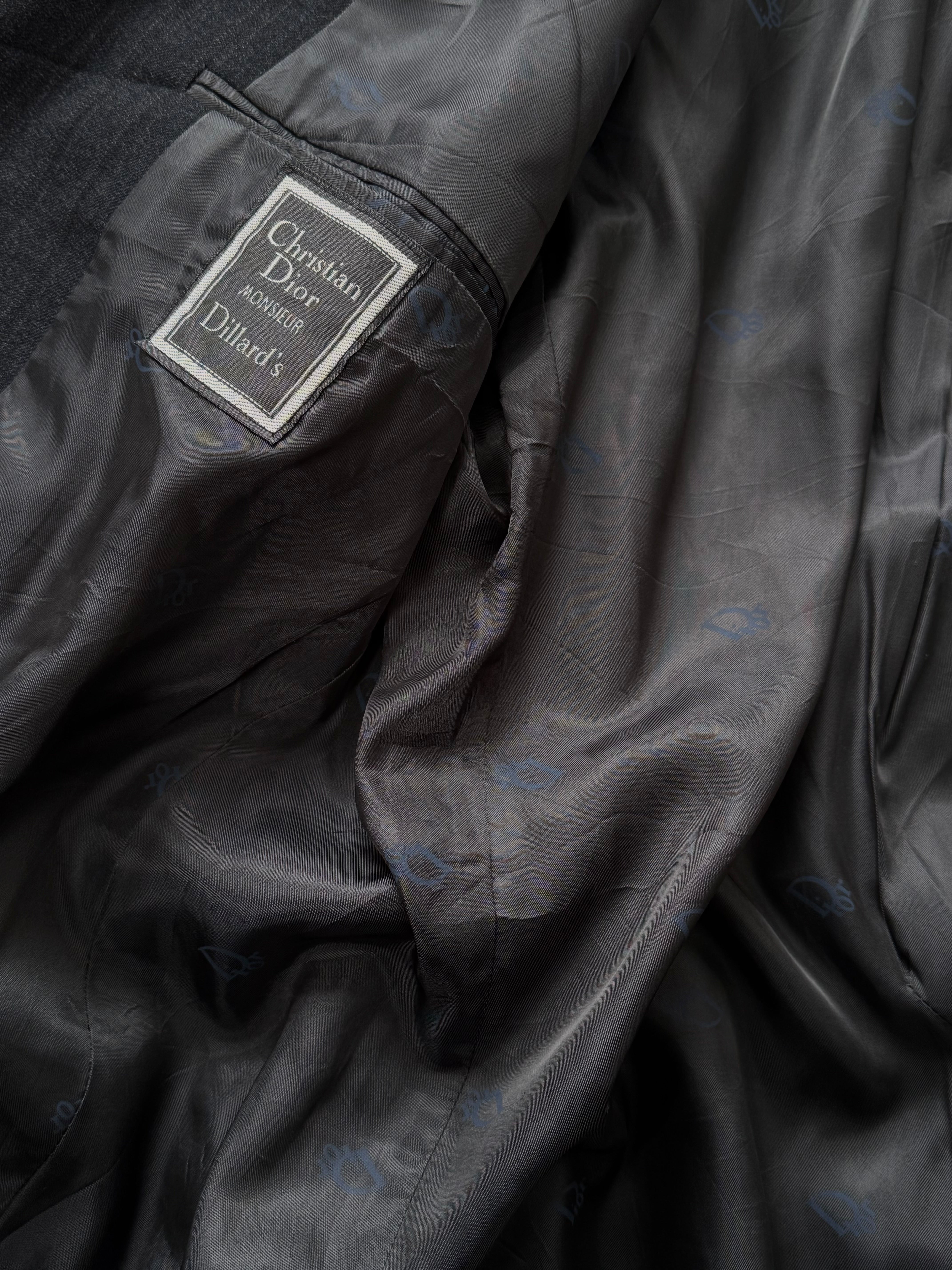 A charcoal grey vintage Christian Dior Monsieur blazer in a heavier wool with subtle vertical stripe and structured tailoring. Designed with broad shoulders, classic notch lapels and a relaxed straight cut, it reflects strong 1980s menswear proportions with refined finish and Dior monogram lining.