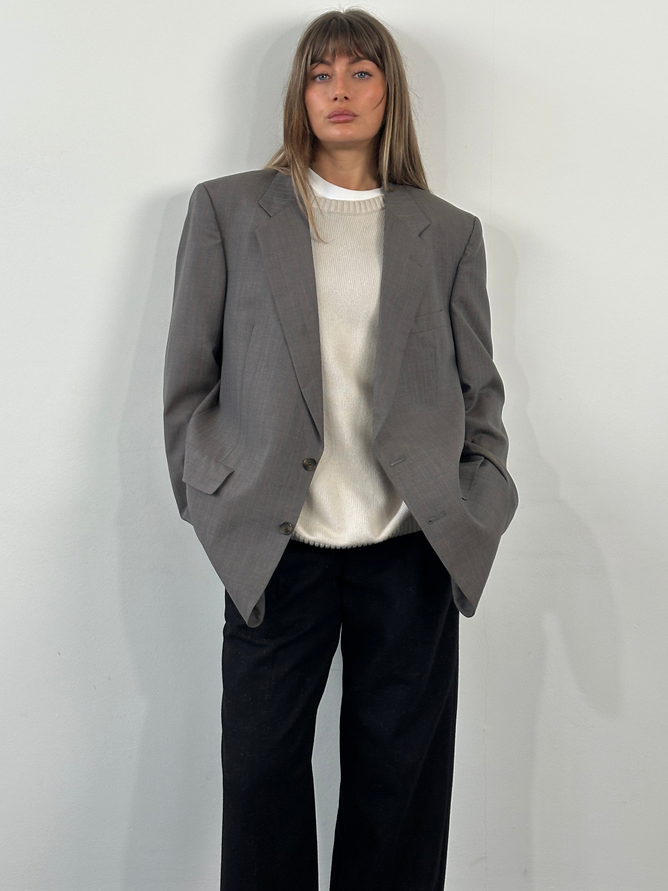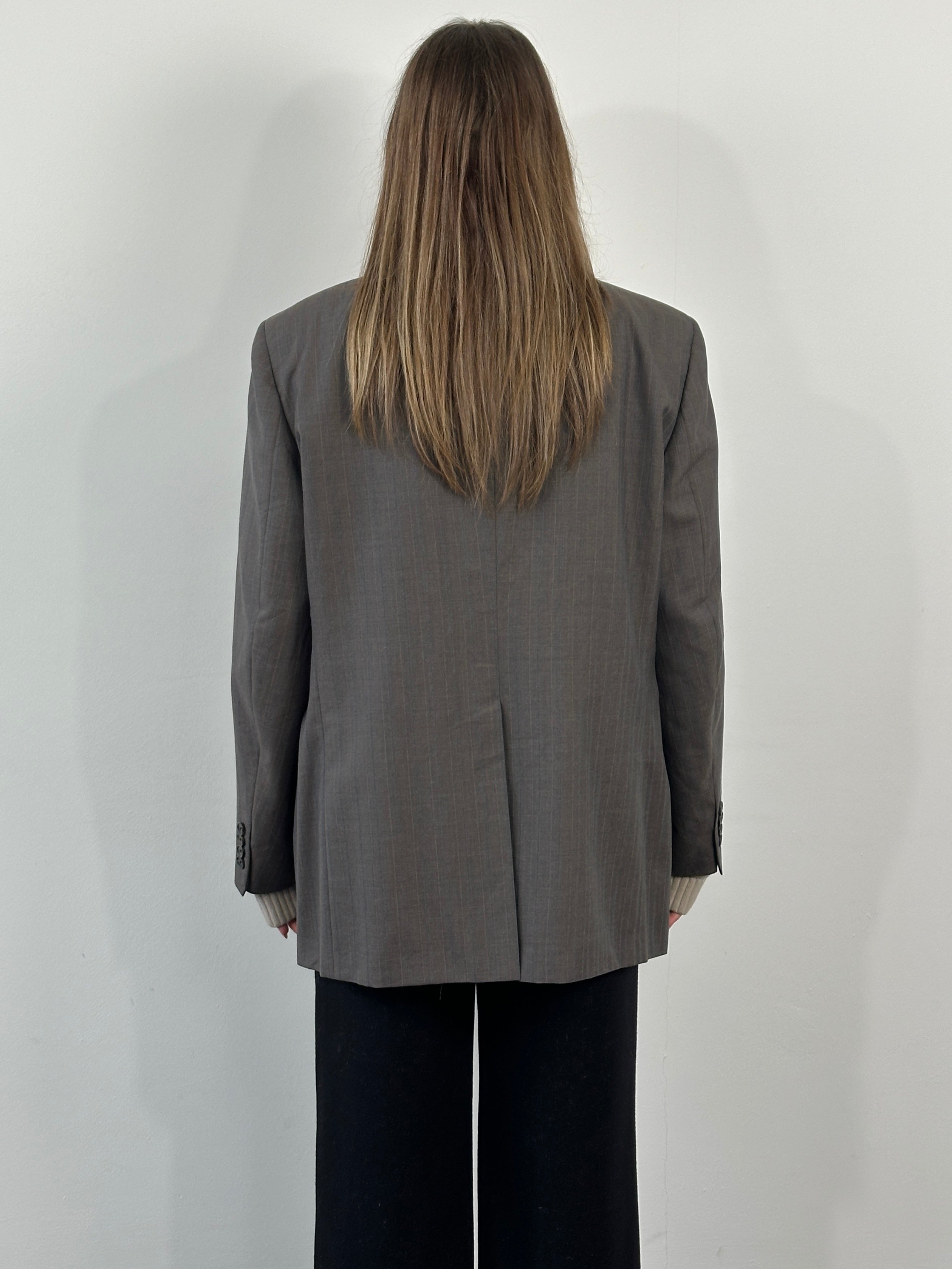 A brown single breasted blazer by Christian Dior Monsieur, made expressly for Hecht’s, featuring a subtle tonal stripe and classic structured tailoring. The warm brown tone and traditional notch lapels are complemented by a CD monogram lining, reflecting refined 1990s department store tailoring.