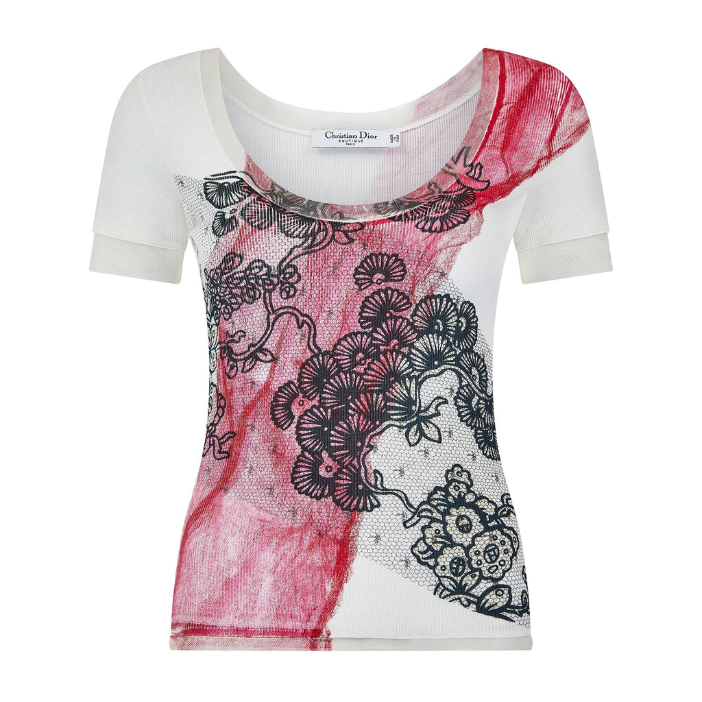 This Christian Dior t-shirt dates back to the brand's highly sought-after noughties era when John Galliano was at the creative helm of the house. This short-sleeve top is cut with a scoop neckline and trimmed with sheer mesh at the sleeves, neckline and bottom hem. Printed across the front and rear with an intricate design of honeycomb like mesh and vines and flowers that almost look like fans, the pattern is set against a splashy red paint backdrop.