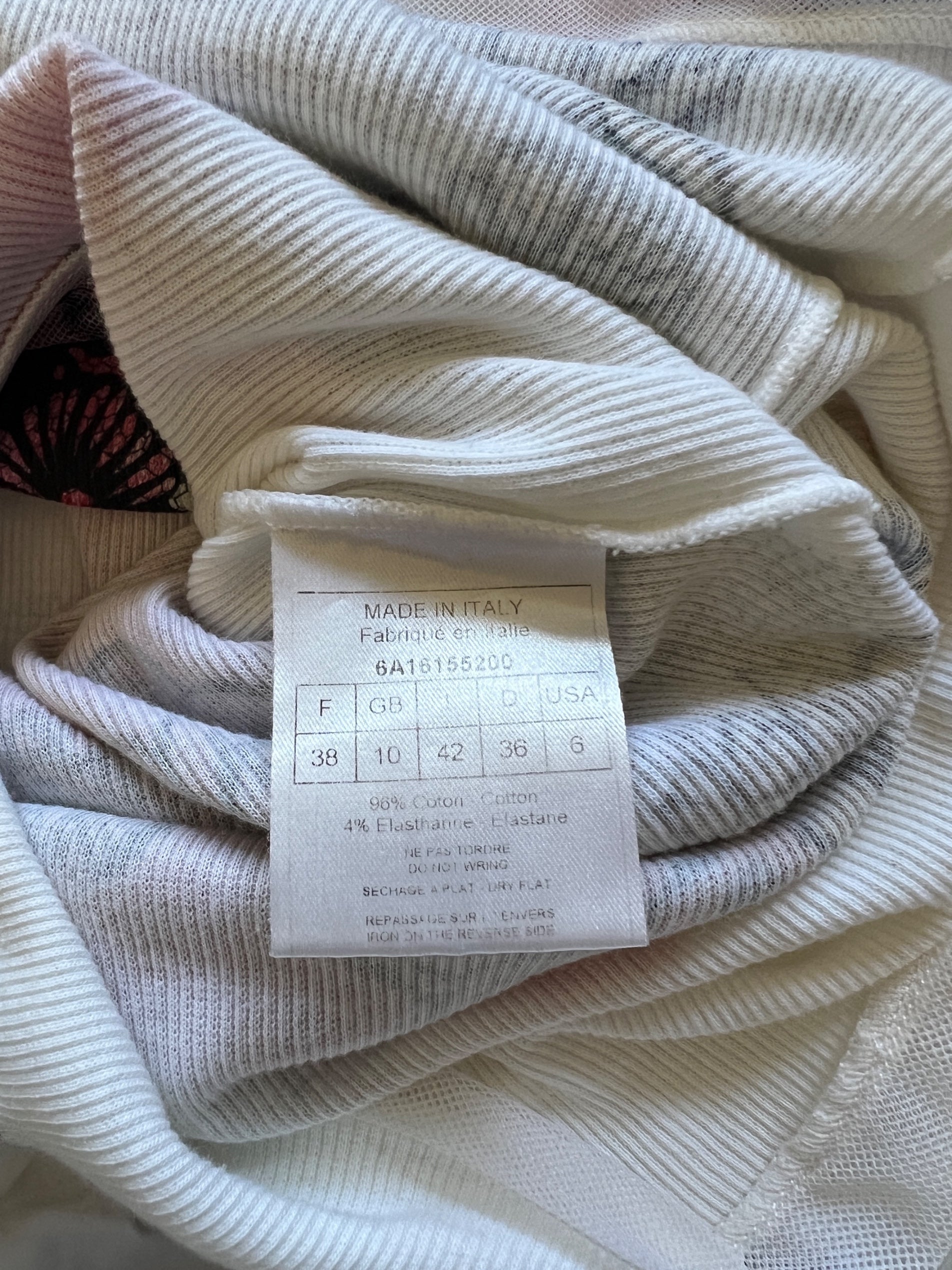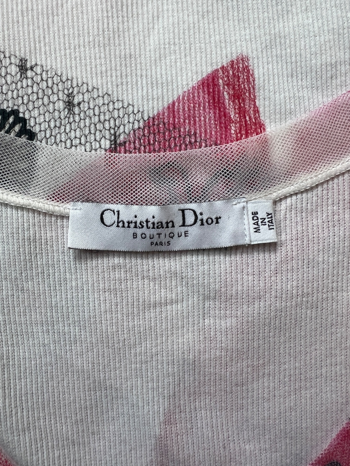 The label reveals it was 'Made in Italy' and the t-shirt is in excellent vintage condition with no flaws of any note. This print featured on a dress which was shown in Dior's 'The Greatest Show in Asia' fashion show held in June 2006 in Shanghai, China. Labelled a UK 10 or U6, there is a good deal of stretch to the soft-to-the- touch 96% cotton, 4% elastane ribbed cotton fabric.