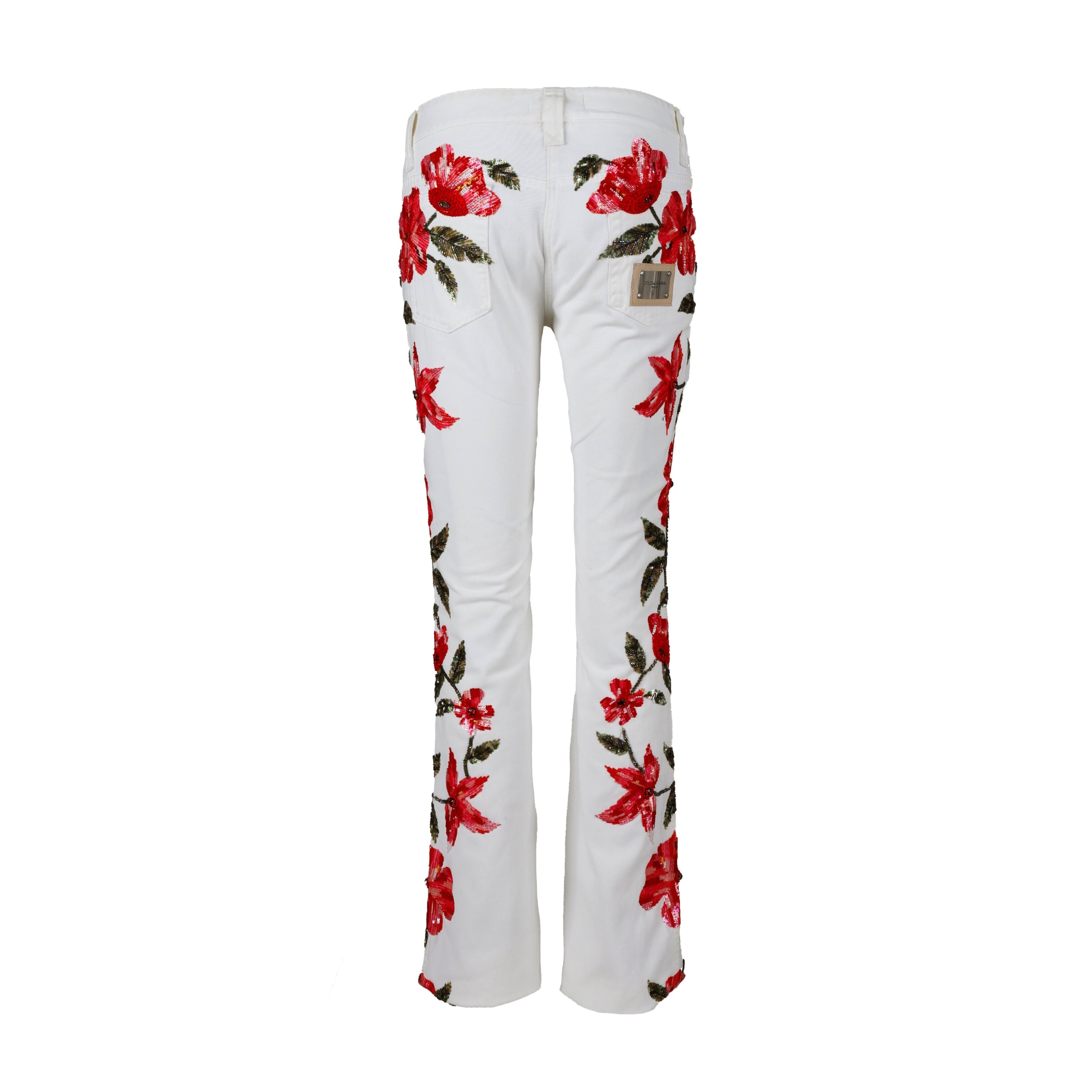 These Dolce & Gabbana Embellished Floral Pants make a chic statement with all-over flower designs with sequin, beads and rhinestones in red and green. Features include mid rise fit, embossed logo buttons and patch behind the back pocket that adds a branded flair.