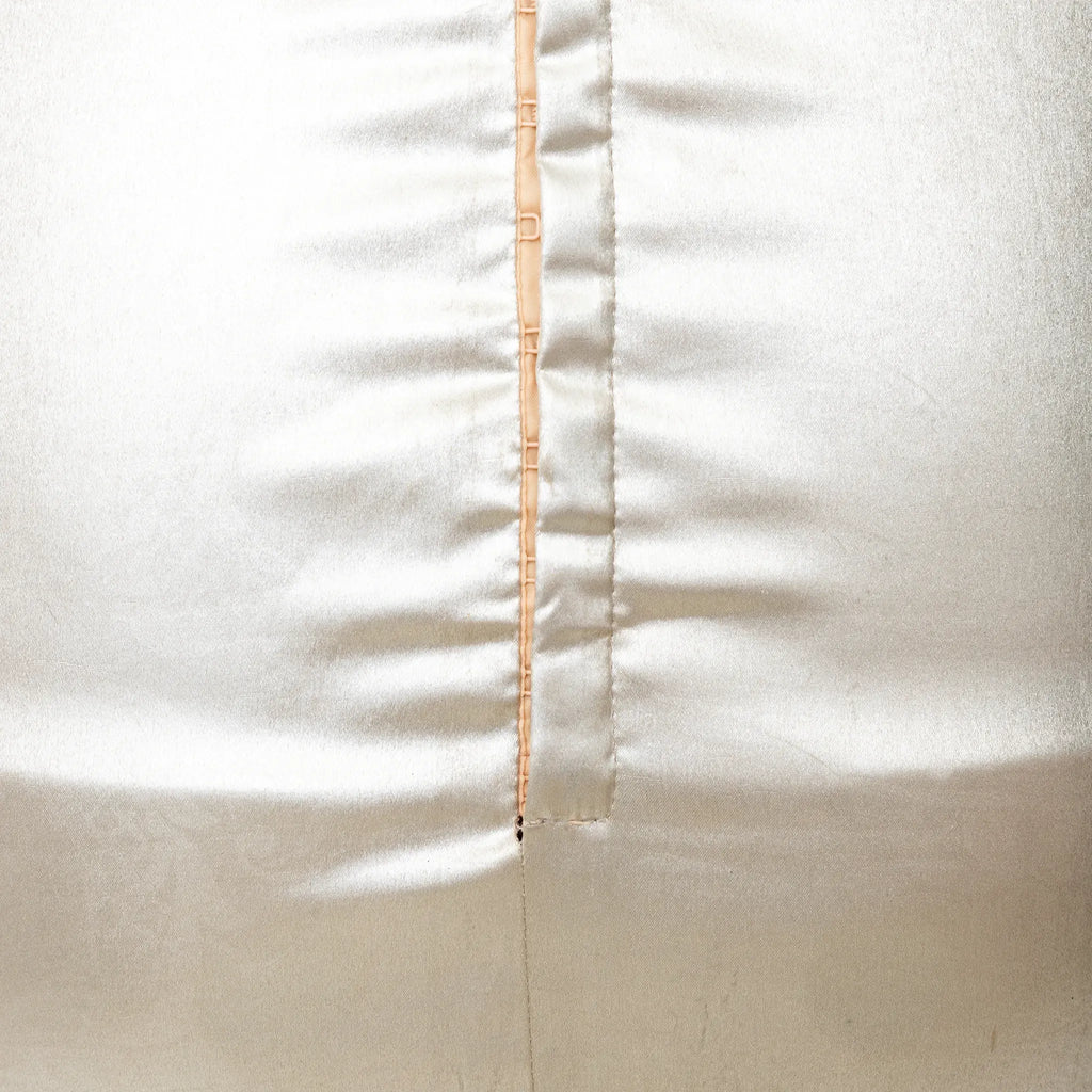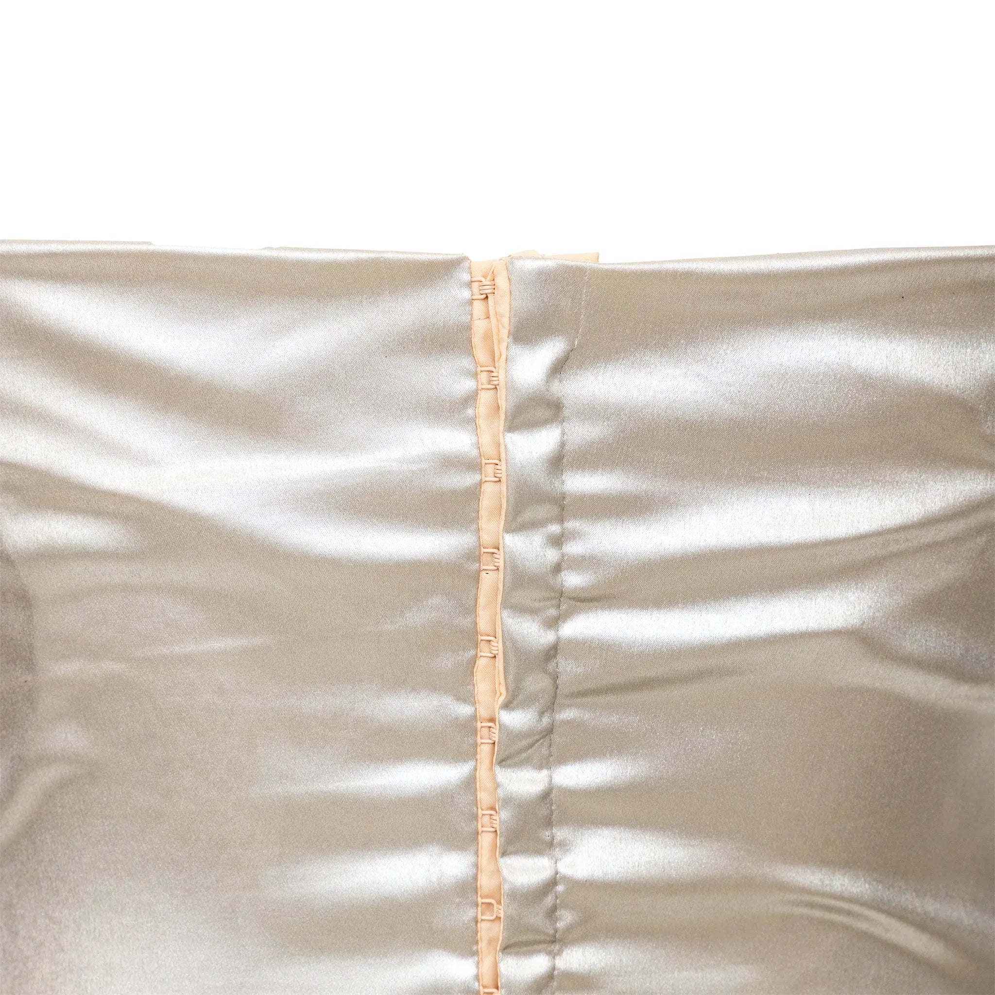 Dolce & Gabbana metallic silver dress with subtle self-baroque print, stretchy fabric, and built-in corset-style bodice. From the Fall/Winter 1998 collection.