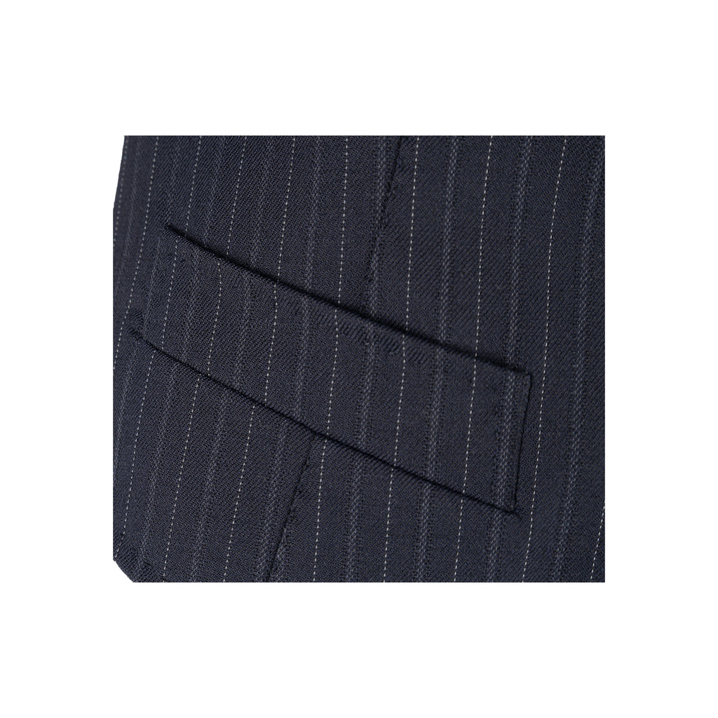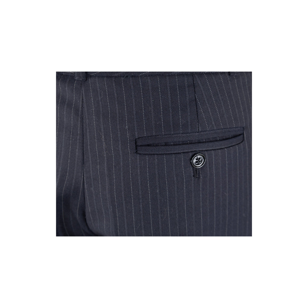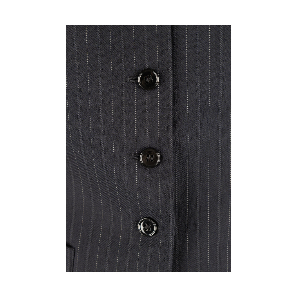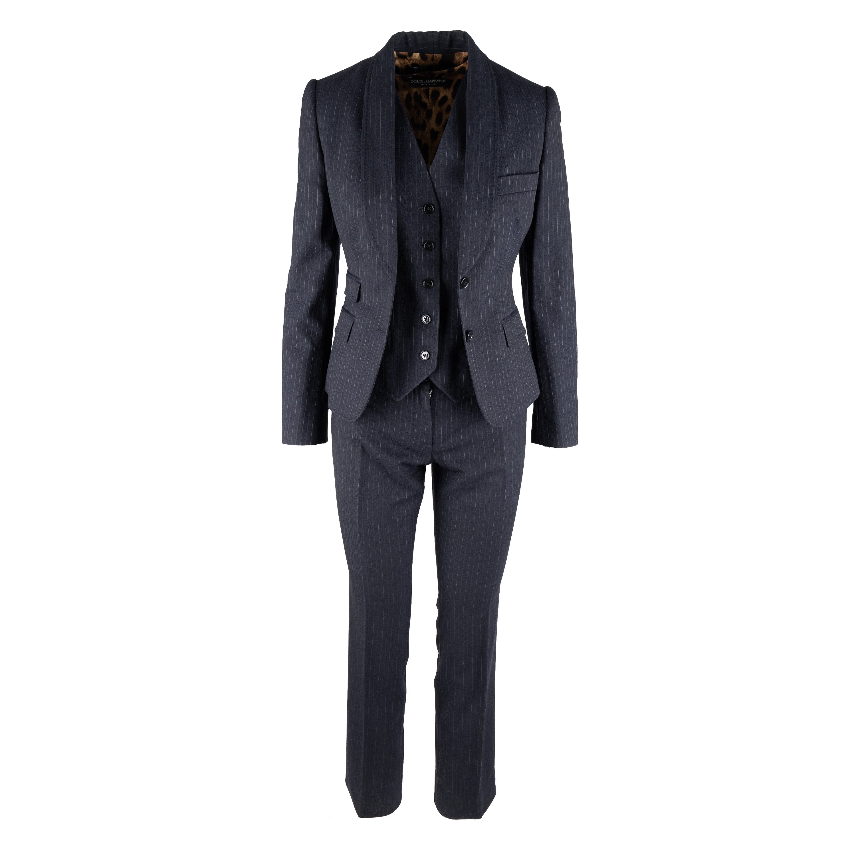 This Dolce & Gabbana pinstripe suit exudes chic sophistication with its tailored look. Crafted from a virgin wool blend, the suit is complete with a vest, jacket, and trousers, all featuring tonal pinstripes. Lean cut lapels and pocket flaps define the jacket, while the vest boasts a silk back and pointed hem. The trousers are slim-fitting with side pockets for convenience.