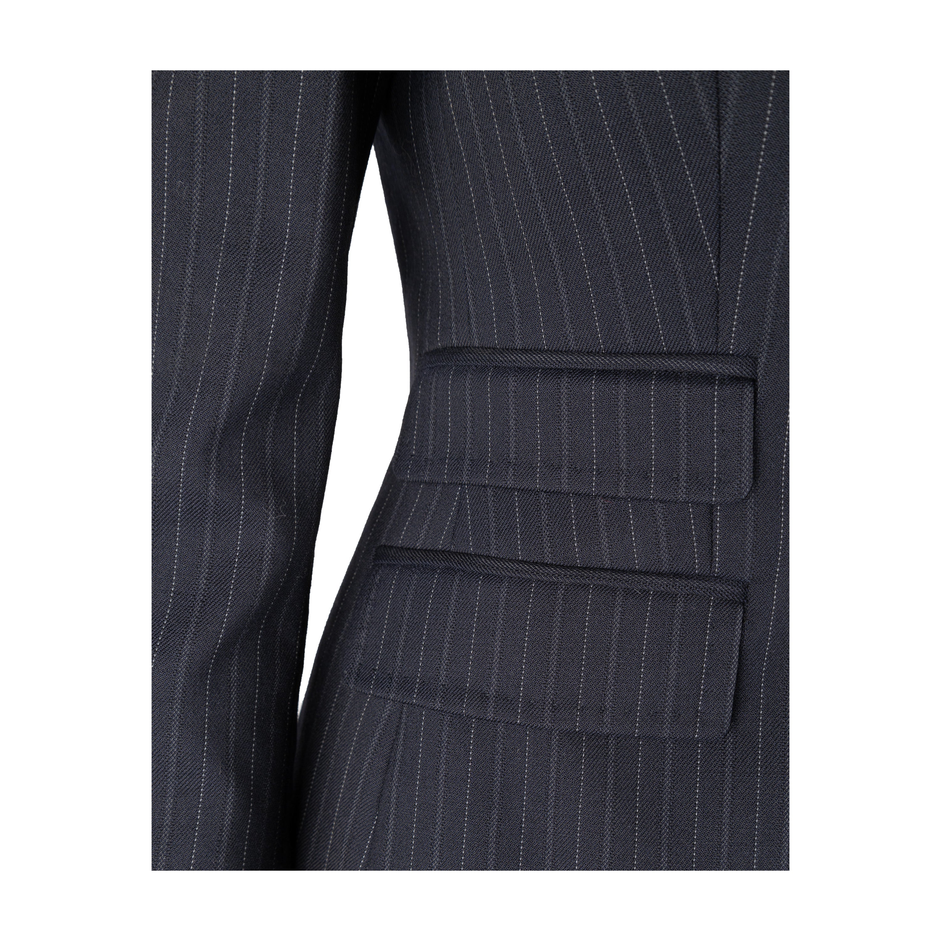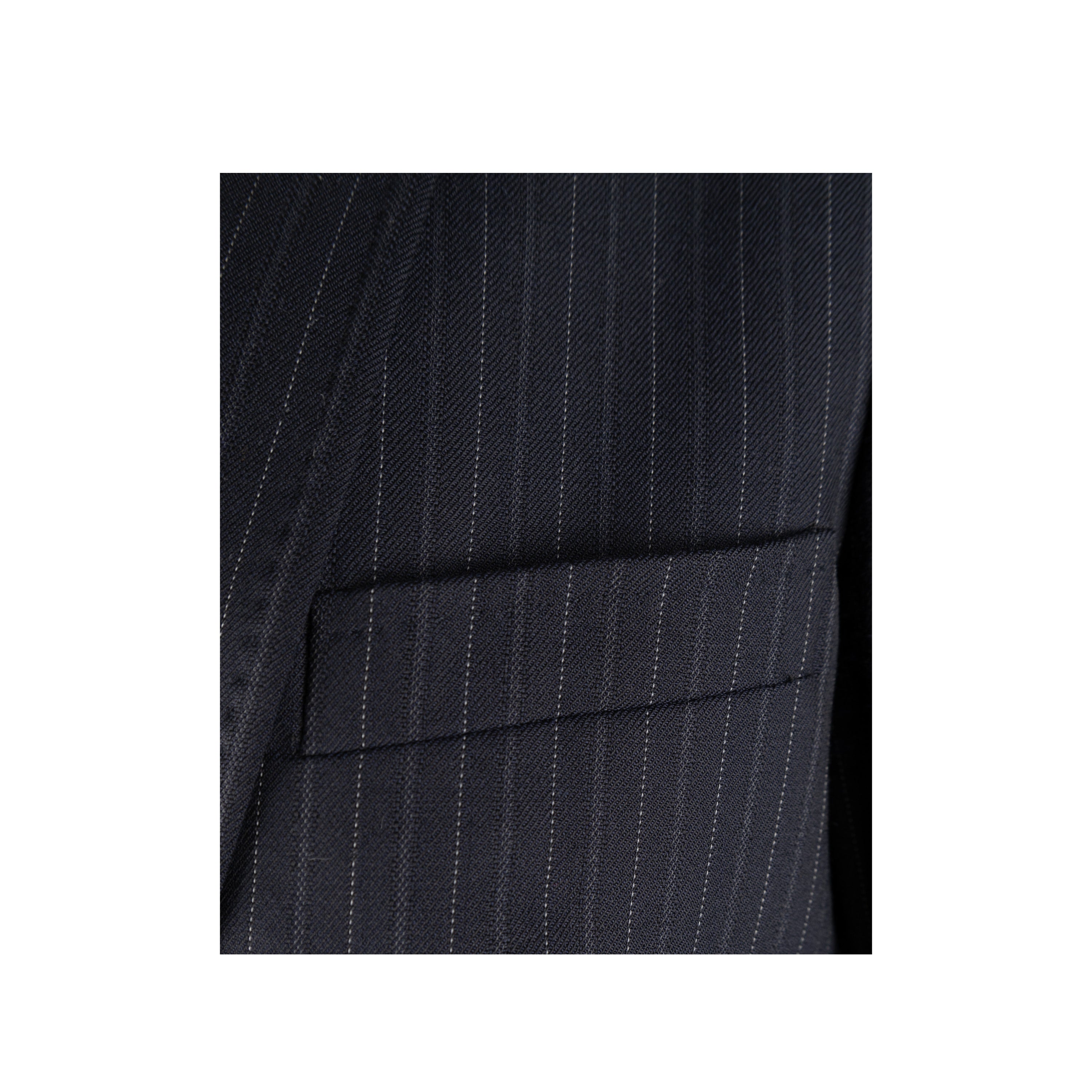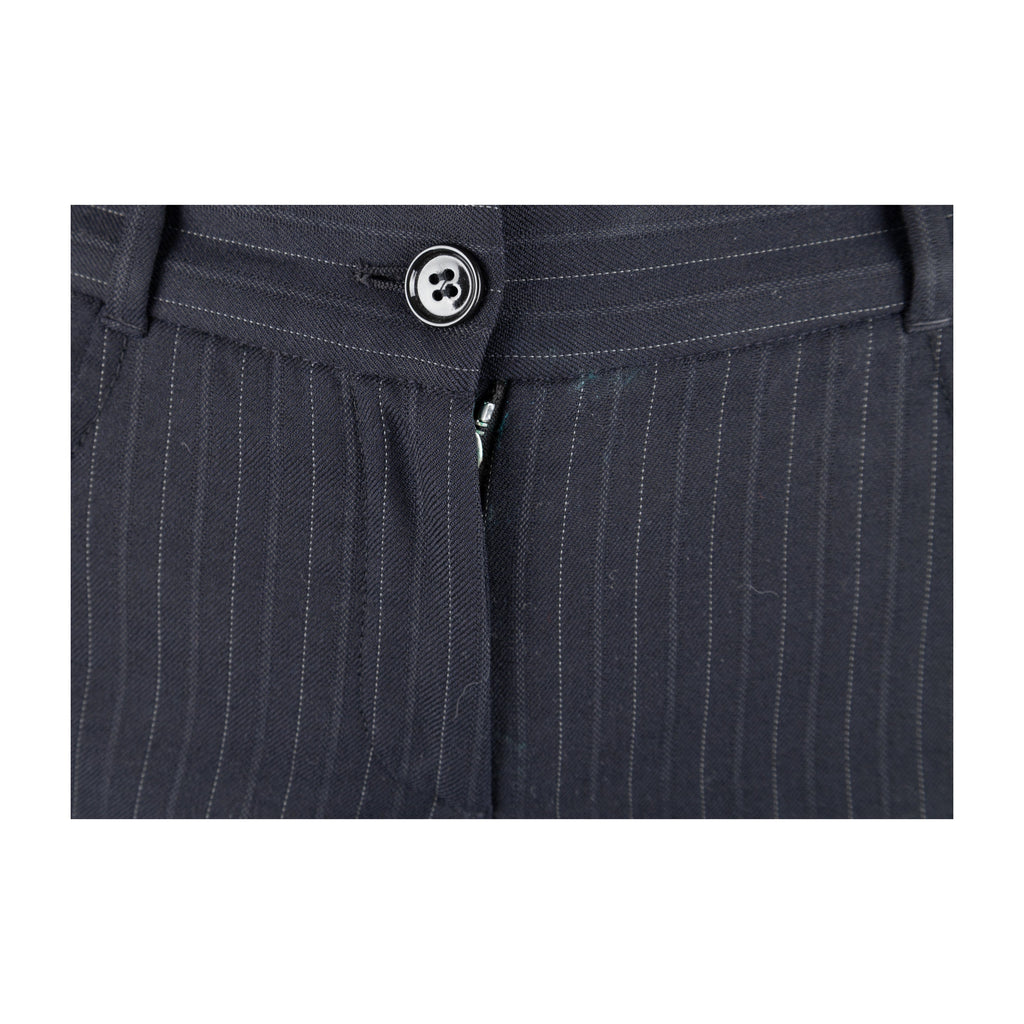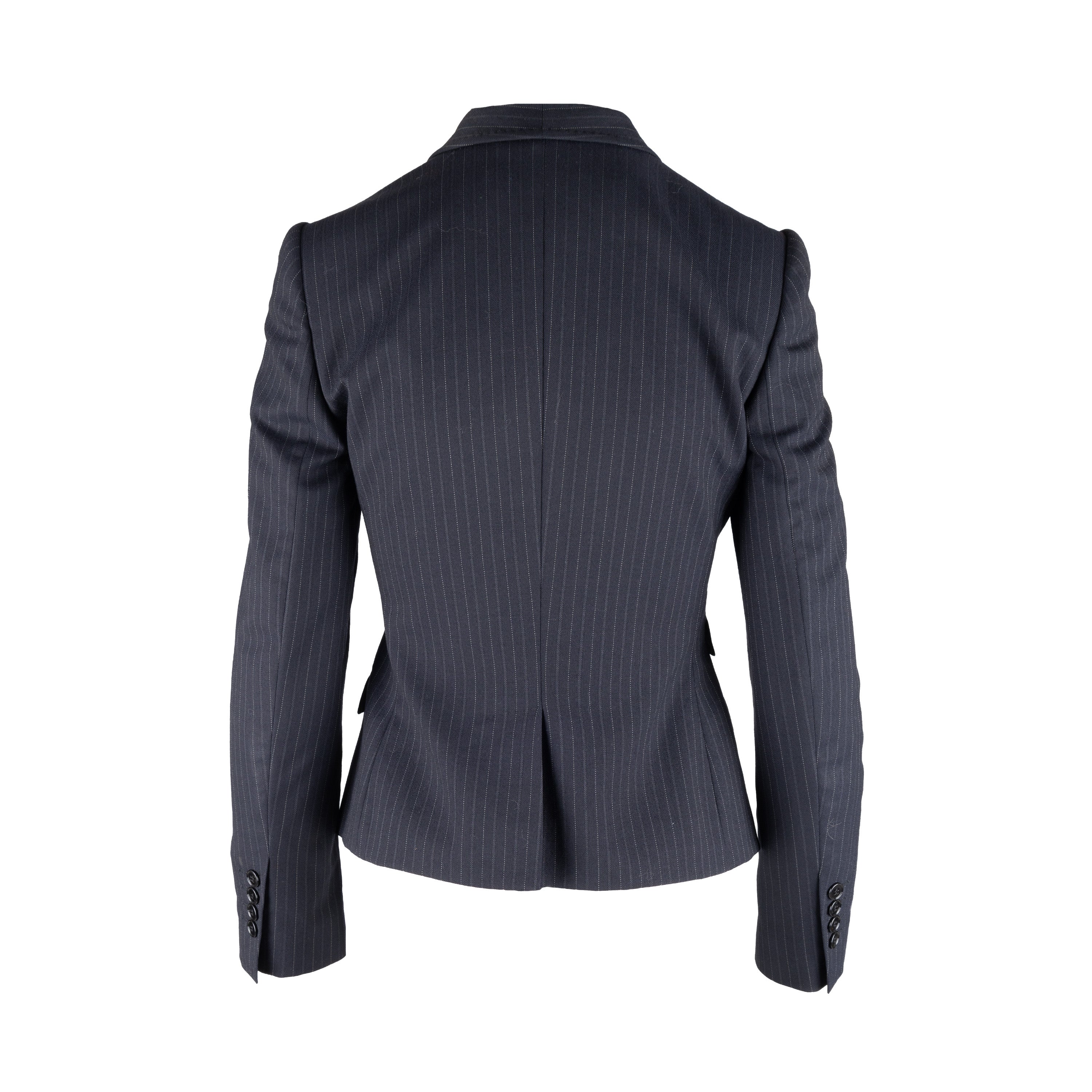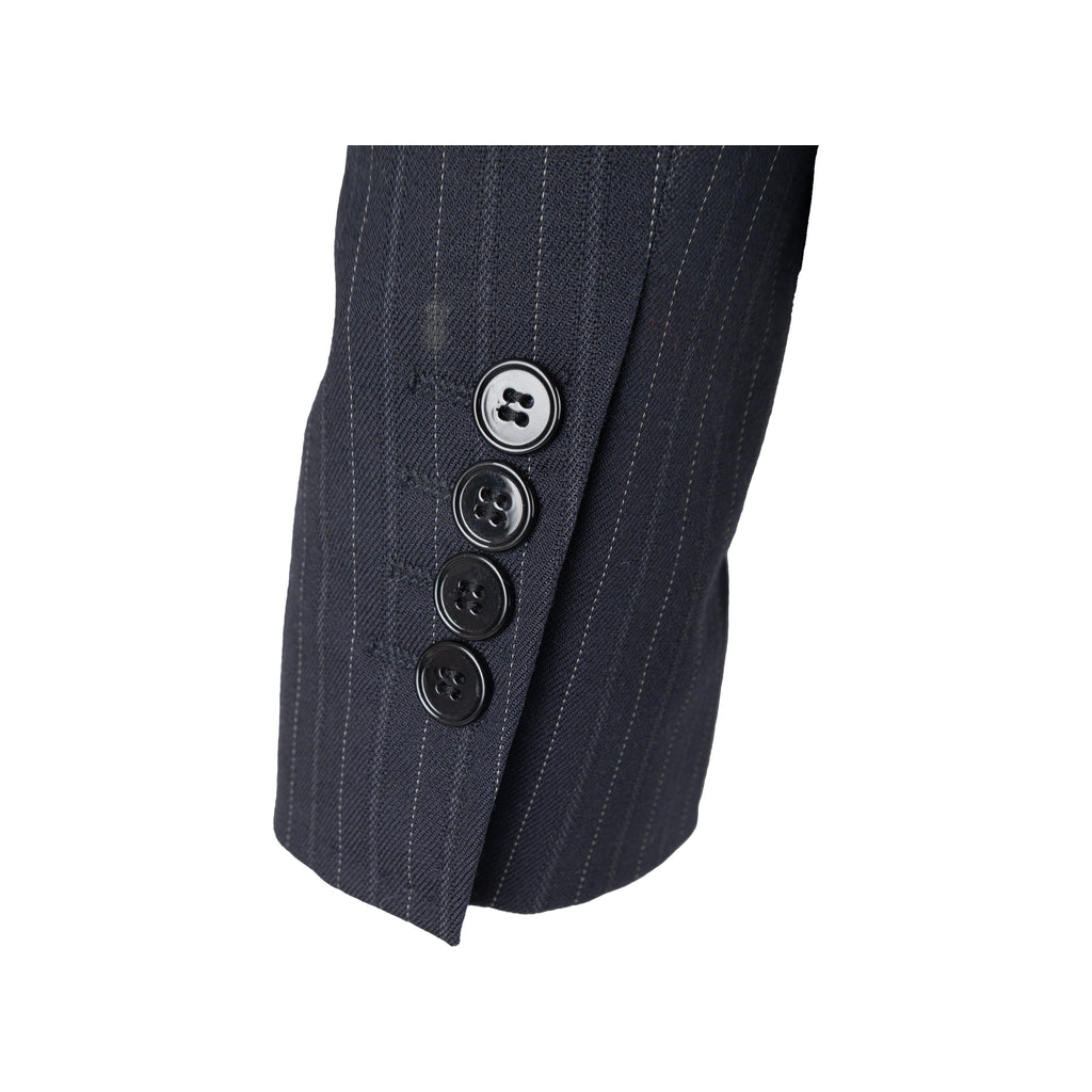 This Dolce & Gabbana pinstripe suit exudes chic sophistication with its tailored look. Crafted from a virgin wool blend, the suit is complete with a vest, jacket, and trousers, all featuring tonal pinstripes. Lean cut lapels and pocket flaps define the jacket, while the vest boasts a silk back and pointed hem. The trousers are slim-fitting with side pockets for convenience.