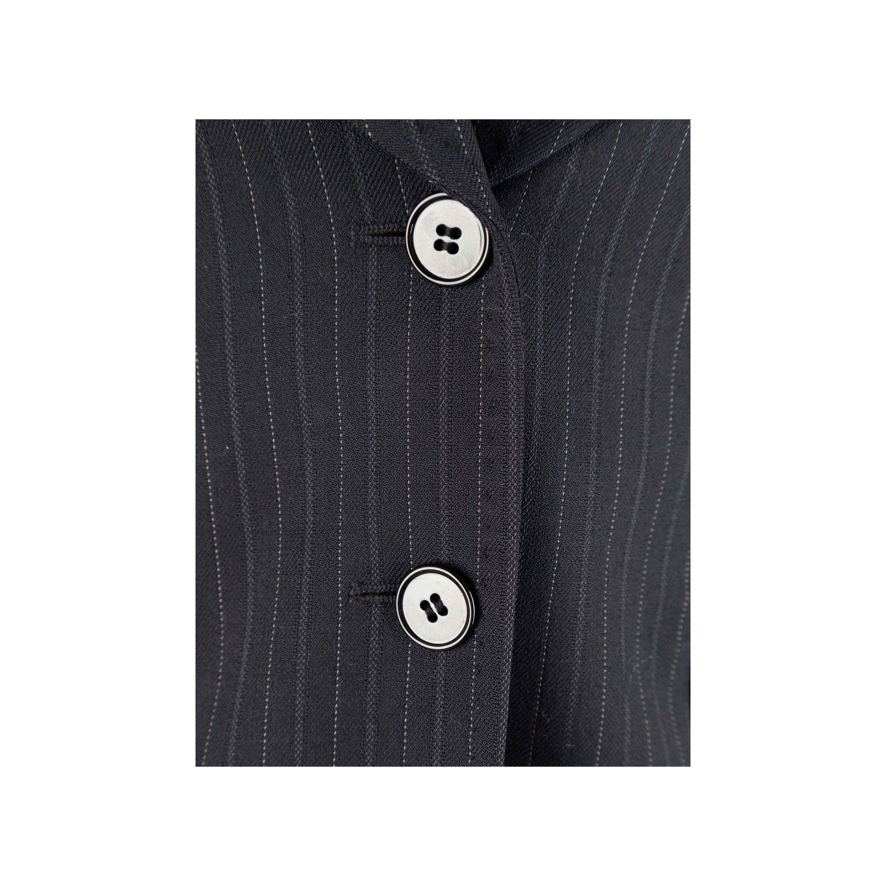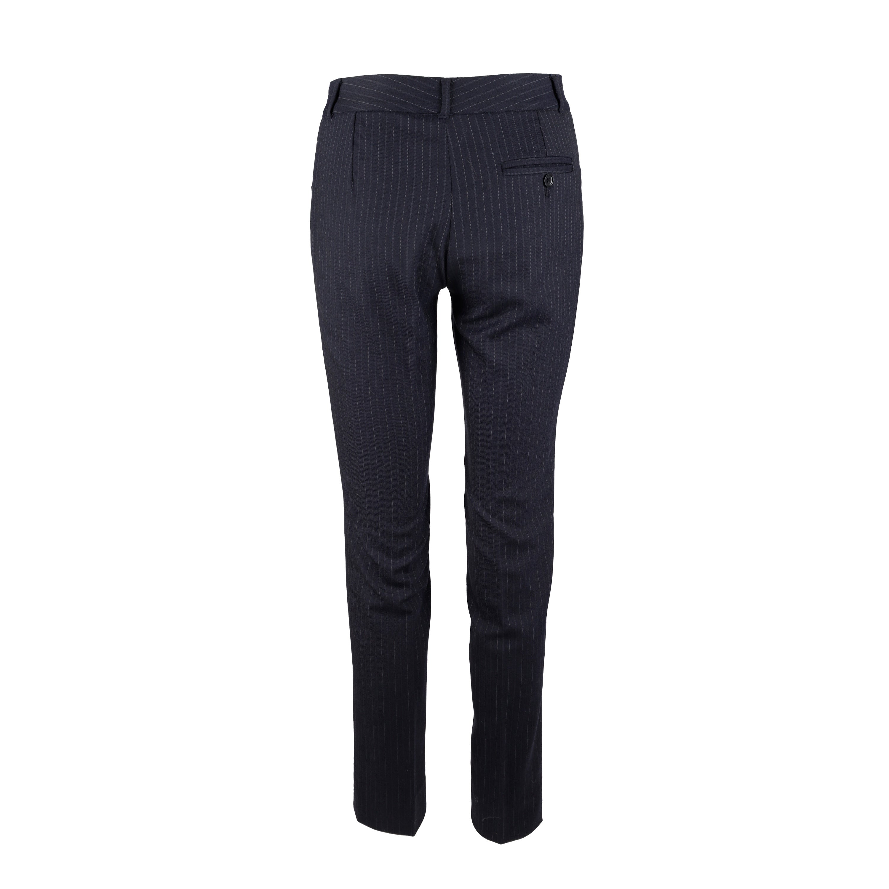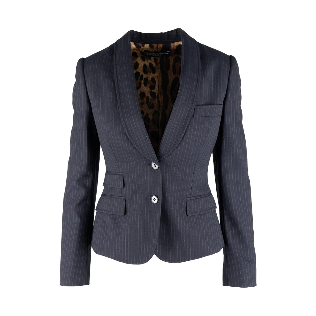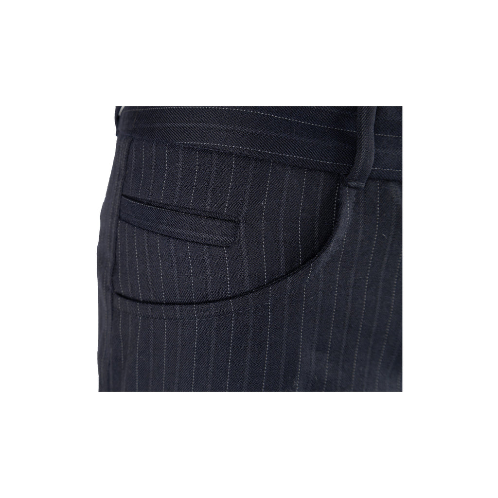 This Dolce & Gabbana pinstripe suit exudes chic sophistication with its tailored look. Crafted from a virgin wool blend, the suit is complete with a vest, jacket, and trousers, all featuring tonal pinstripes. Lean cut lapels and pocket flaps define the jacket, while the vest boasts a silk back and pointed hem. The trousers are slim-fitting with side pockets for convenience.
