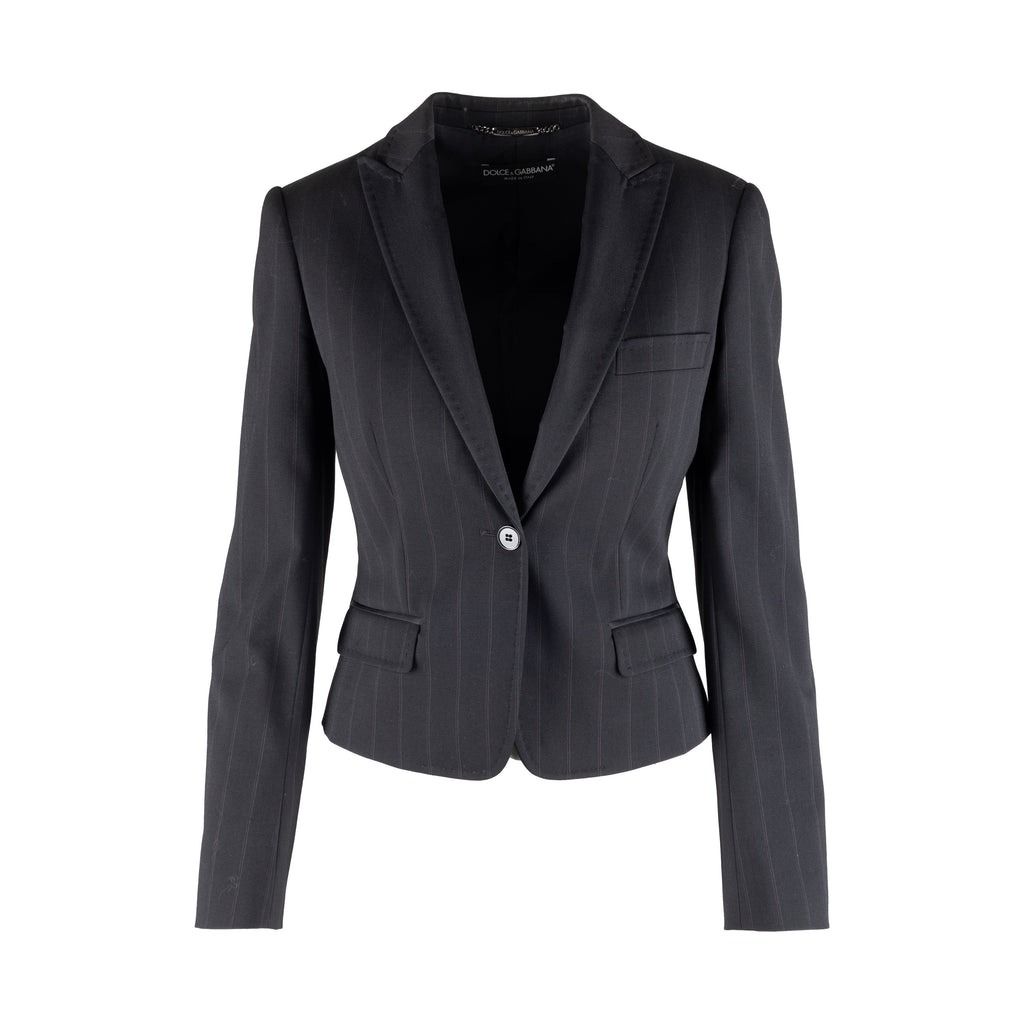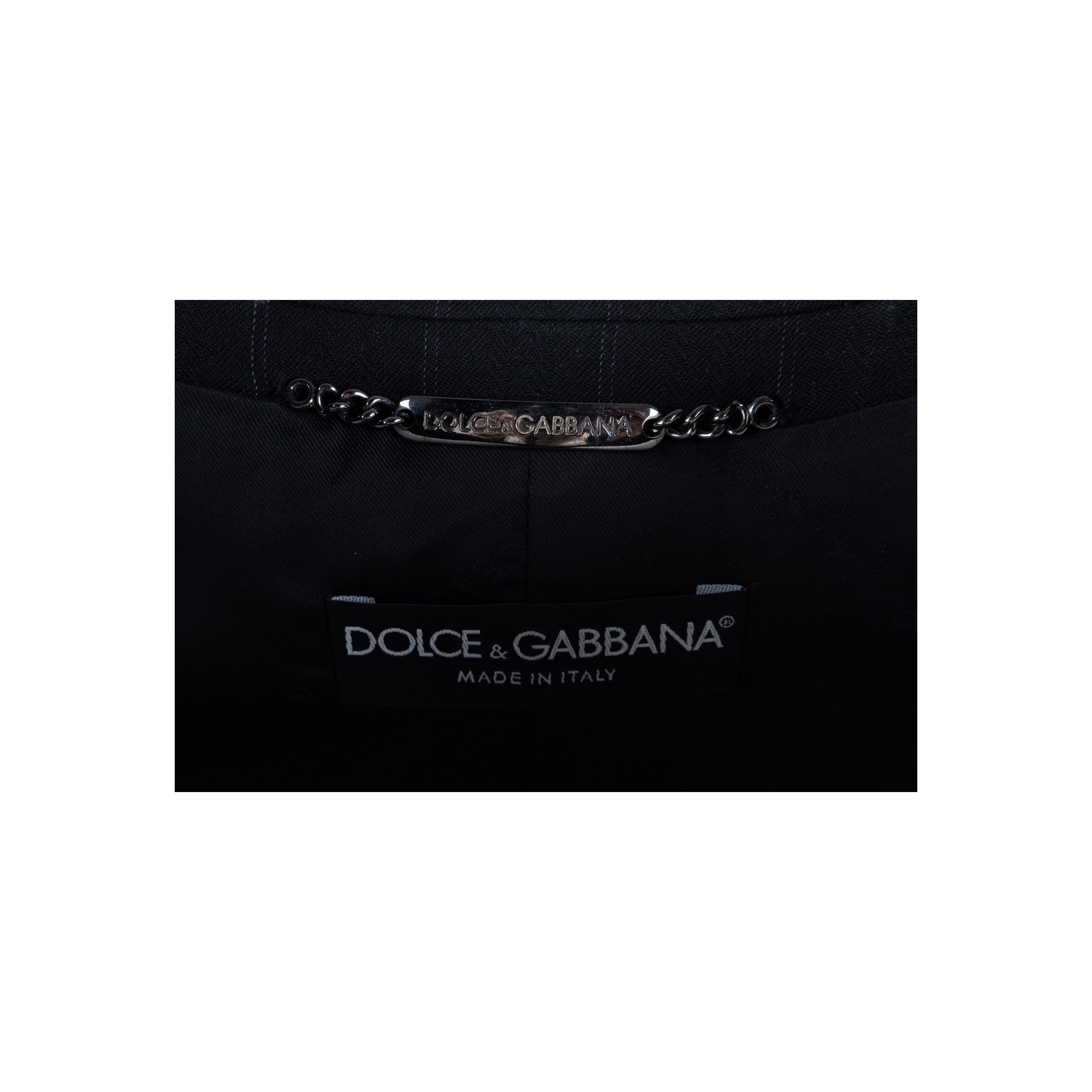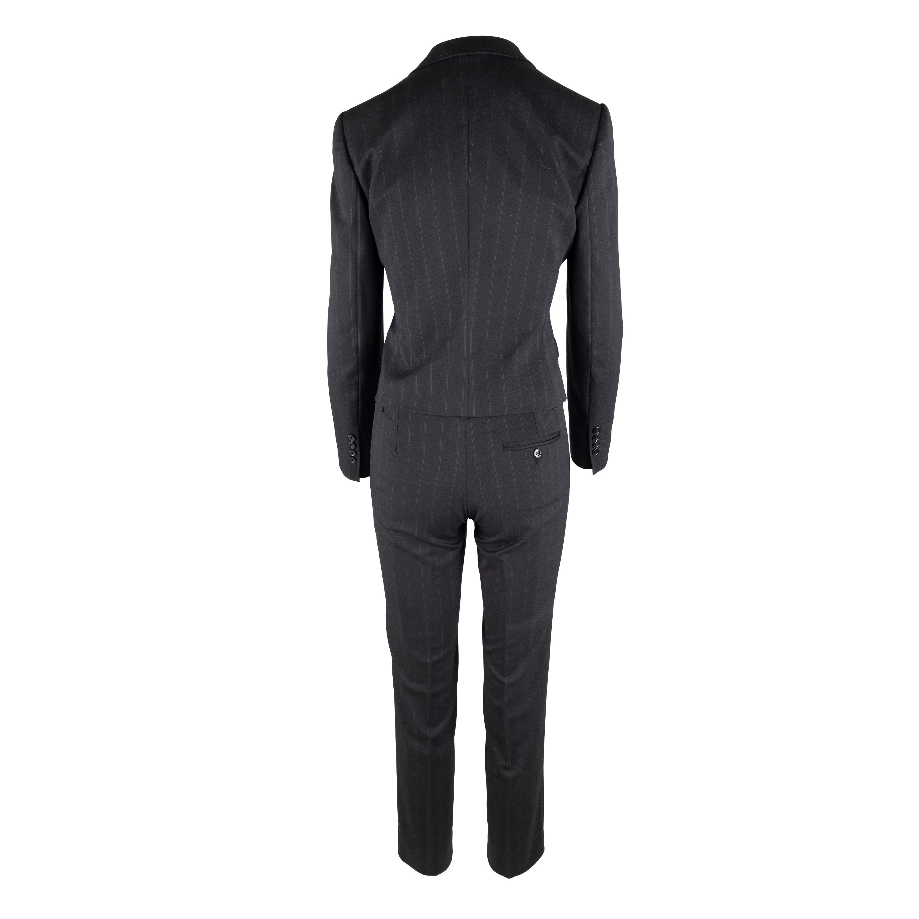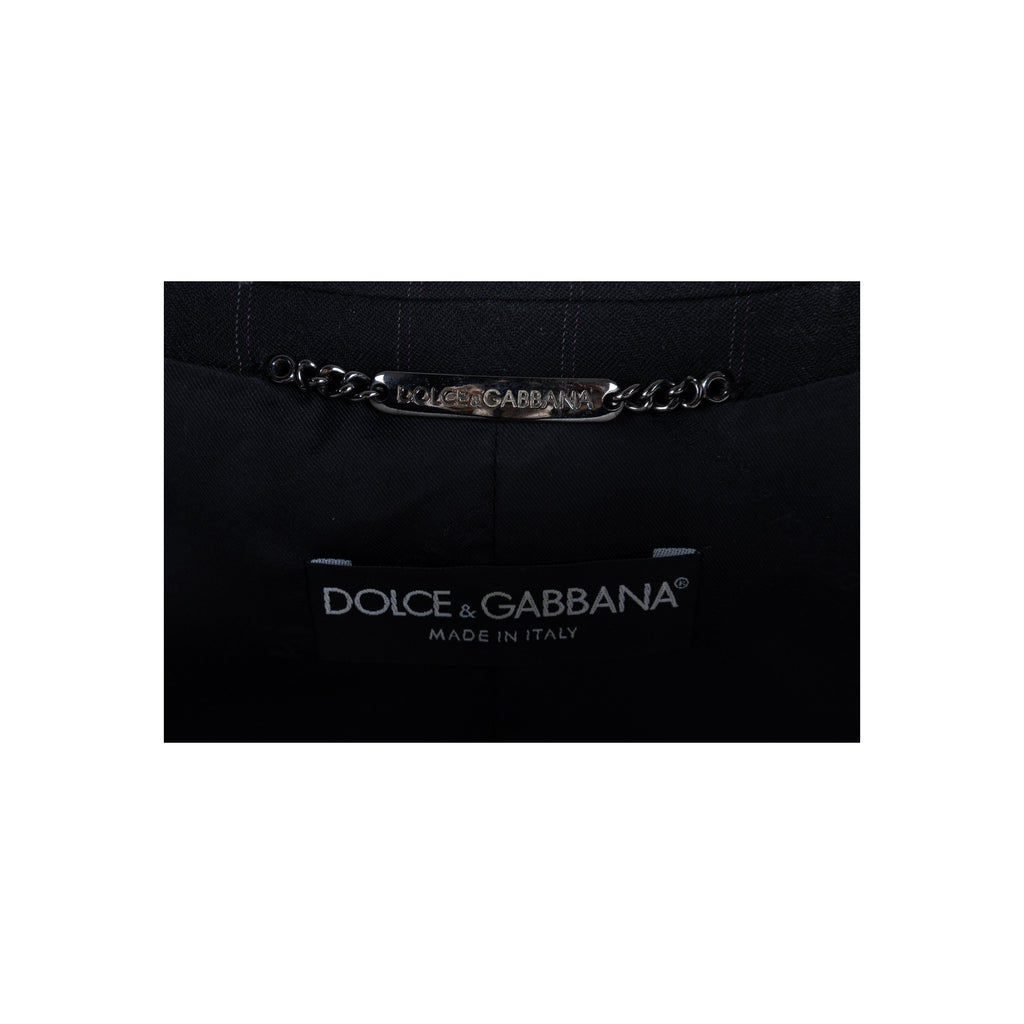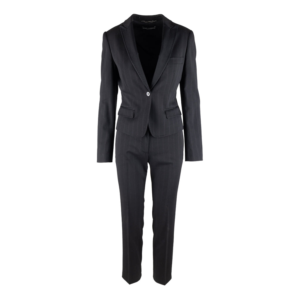 This Dolce & Gabbana suit is expertly crafted from a luxurious blend of wool and silk, adorned in tonal stripes. This lined jacket features a classic one button front with lean-cut contrast lapel collar, buttons at the cuffs, a chest pocket, and two flap pockets. The trousers offer a classic tailored fit, with a decorative pocket at the back. Perfect for the modern woman.