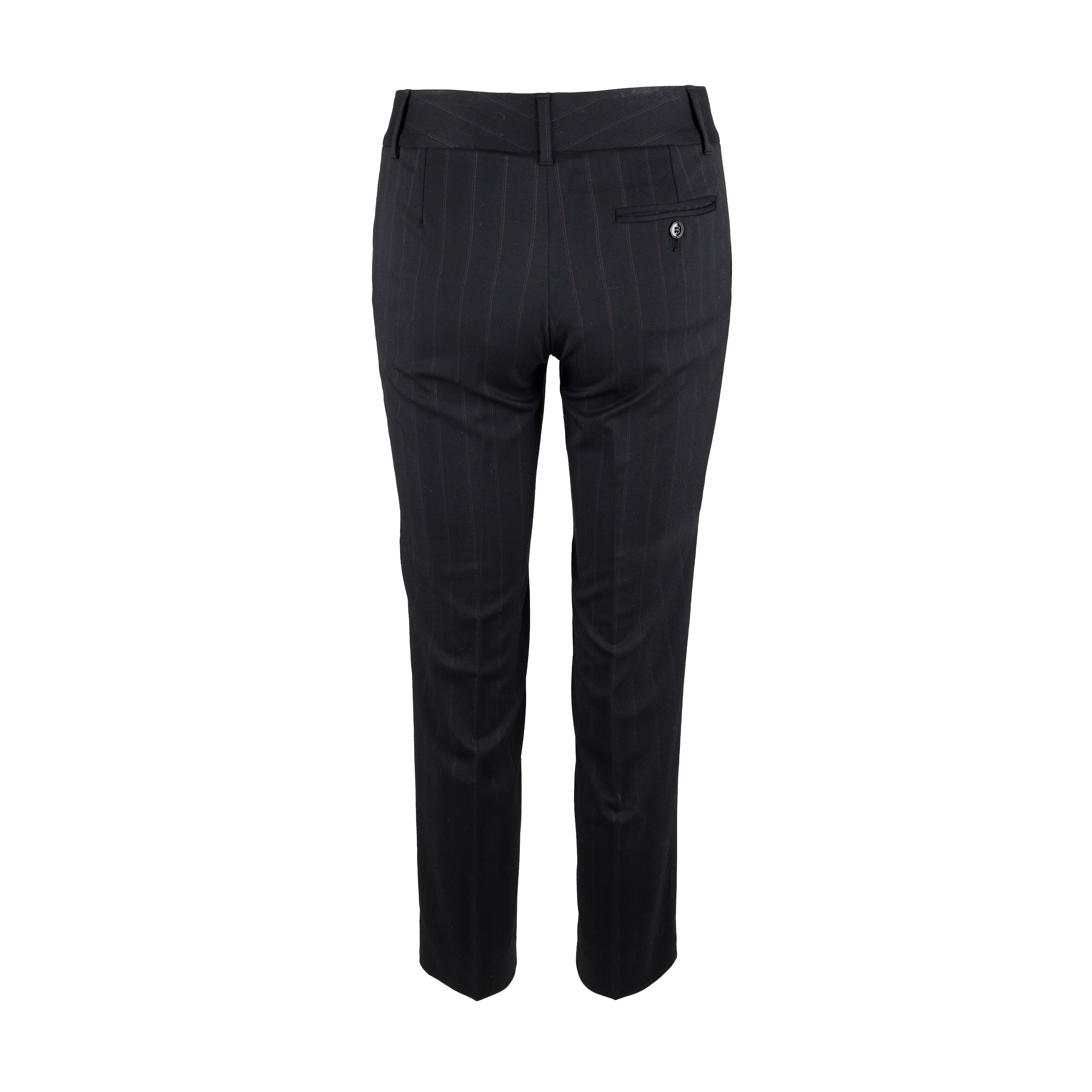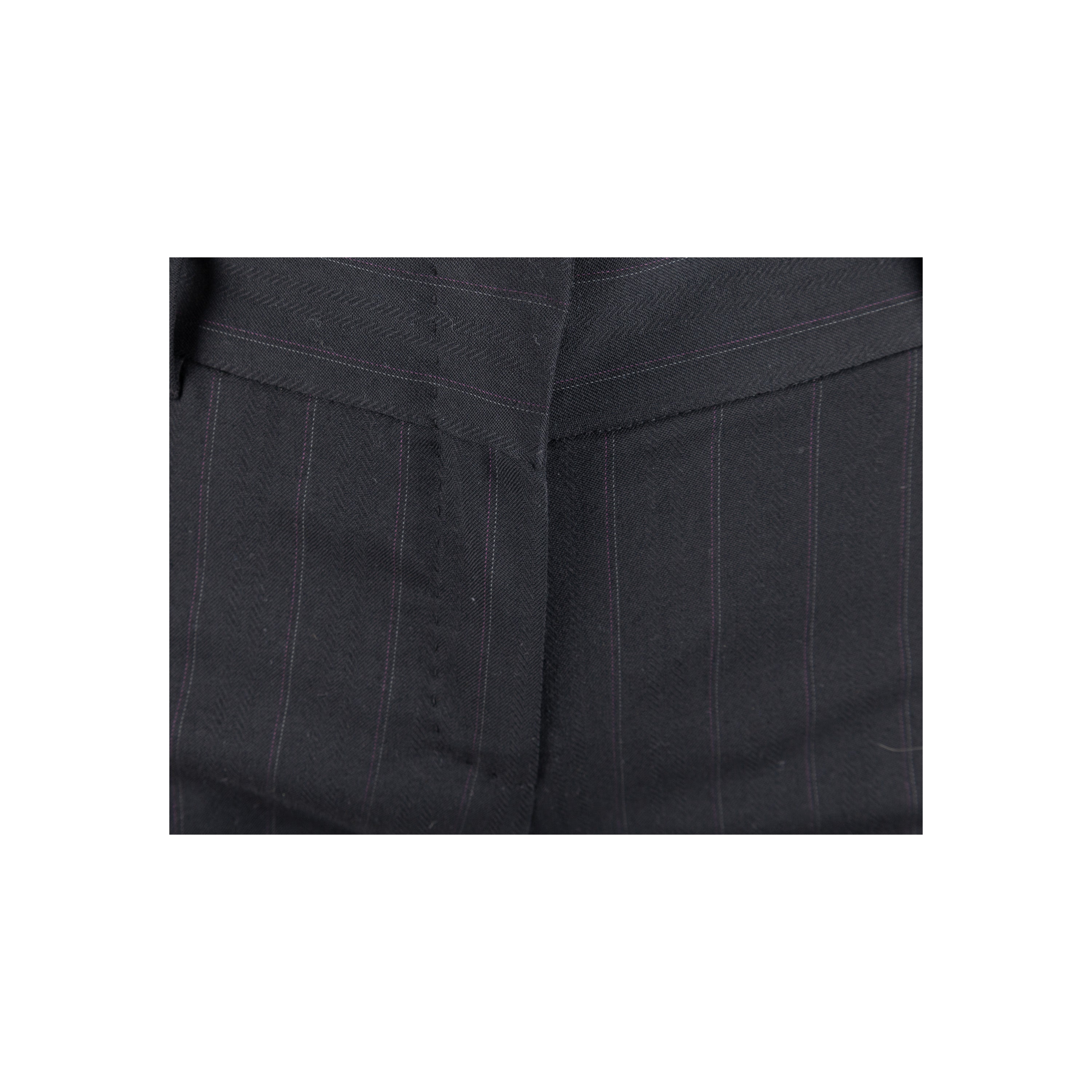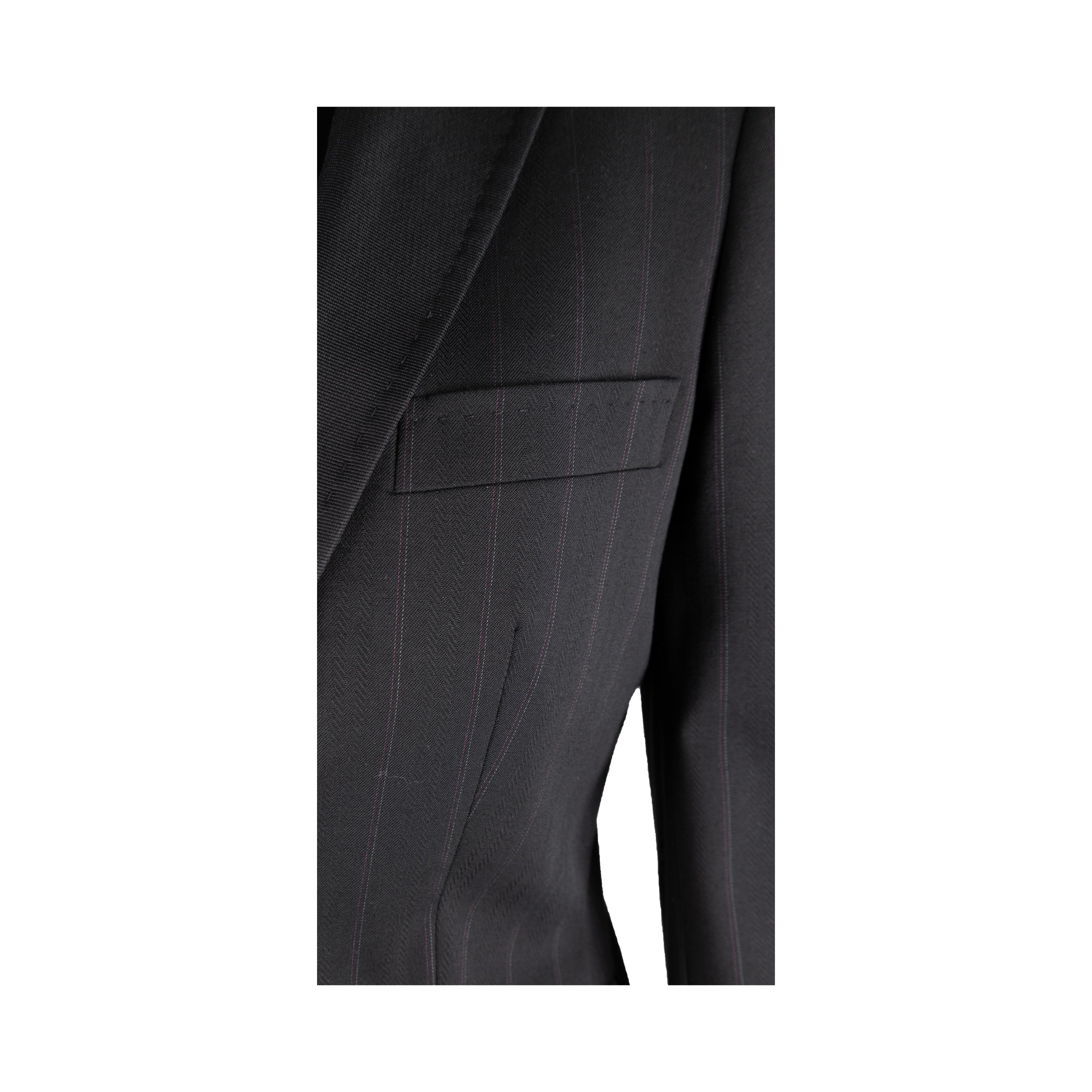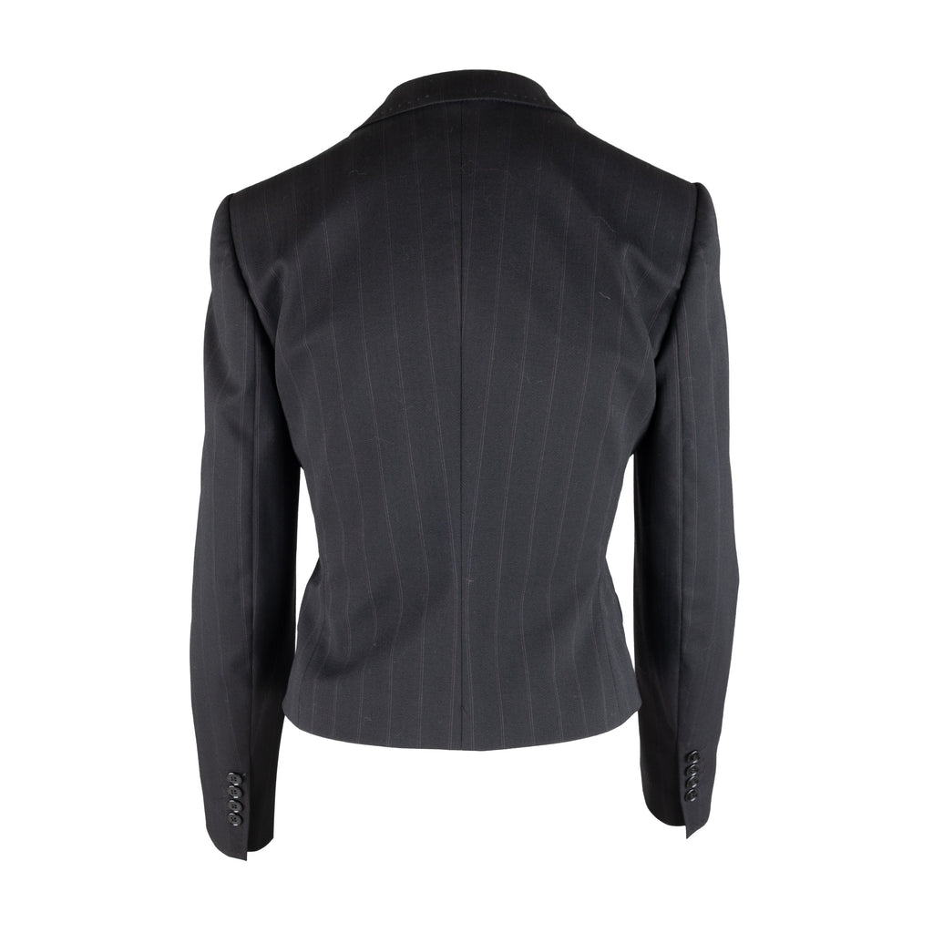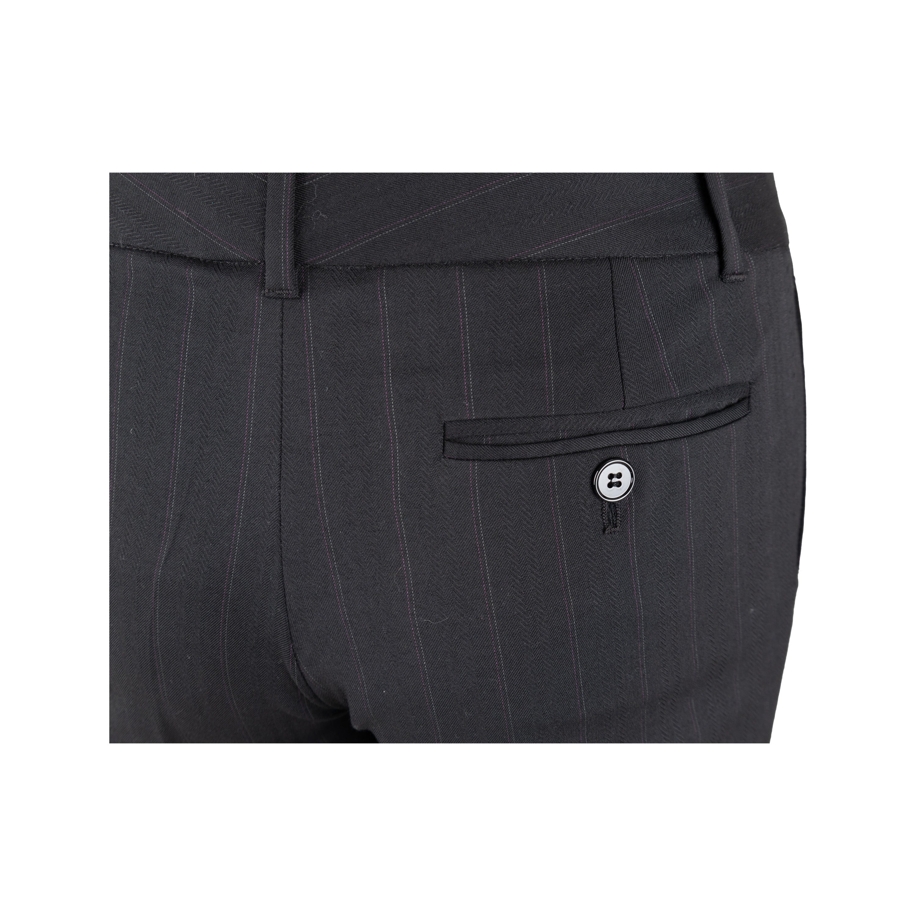 This Dolce & Gabbana suit is expertly crafted from a luxurious blend of wool and silk, adorned in tonal stripes. This lined jacket features a classic one button front with lean-cut contrast lapel collar, buttons at the cuffs, a chest pocket, and two flap pockets. The trousers offer a classic tailored fit, with a decorative pocket at the back. Perfect for the modern woman.