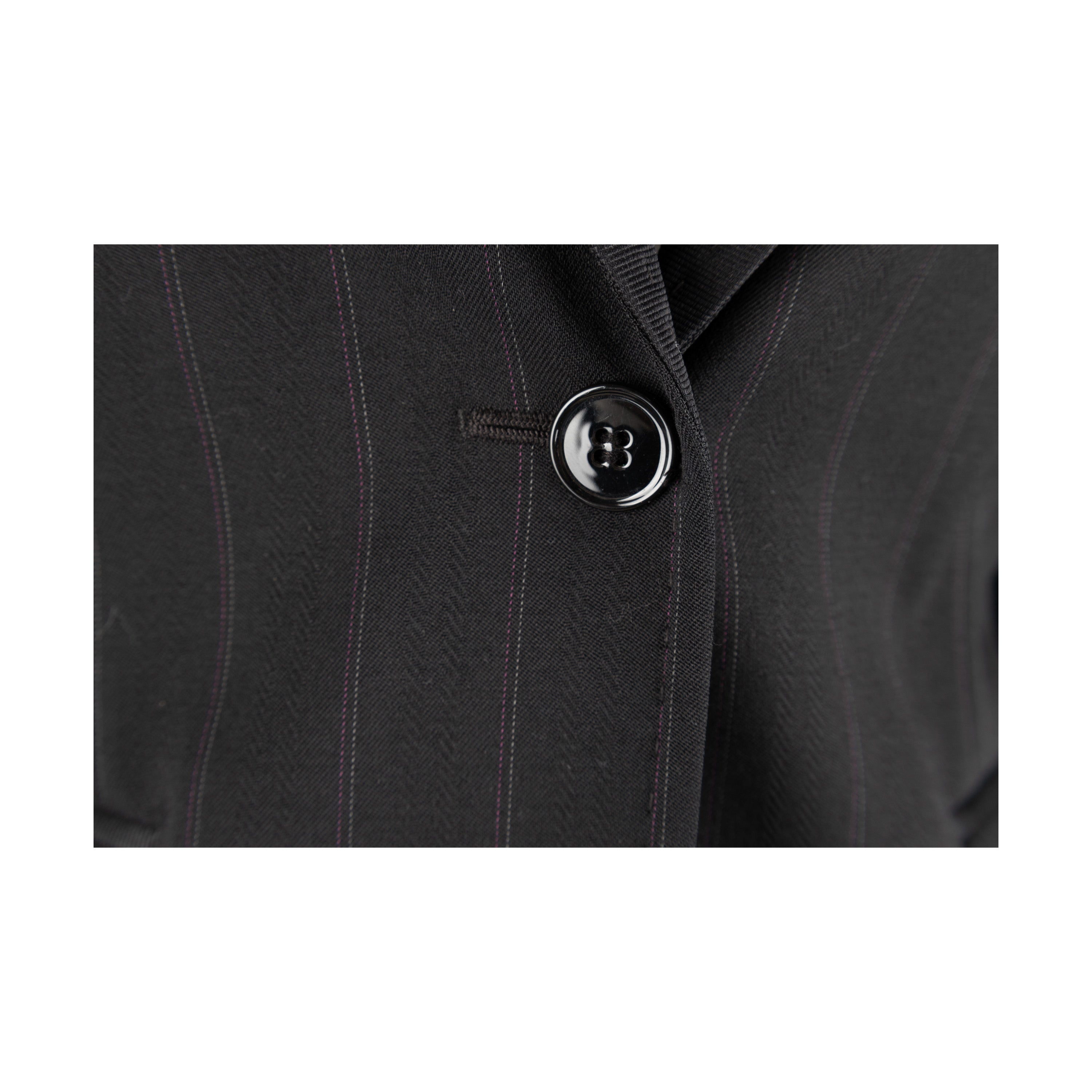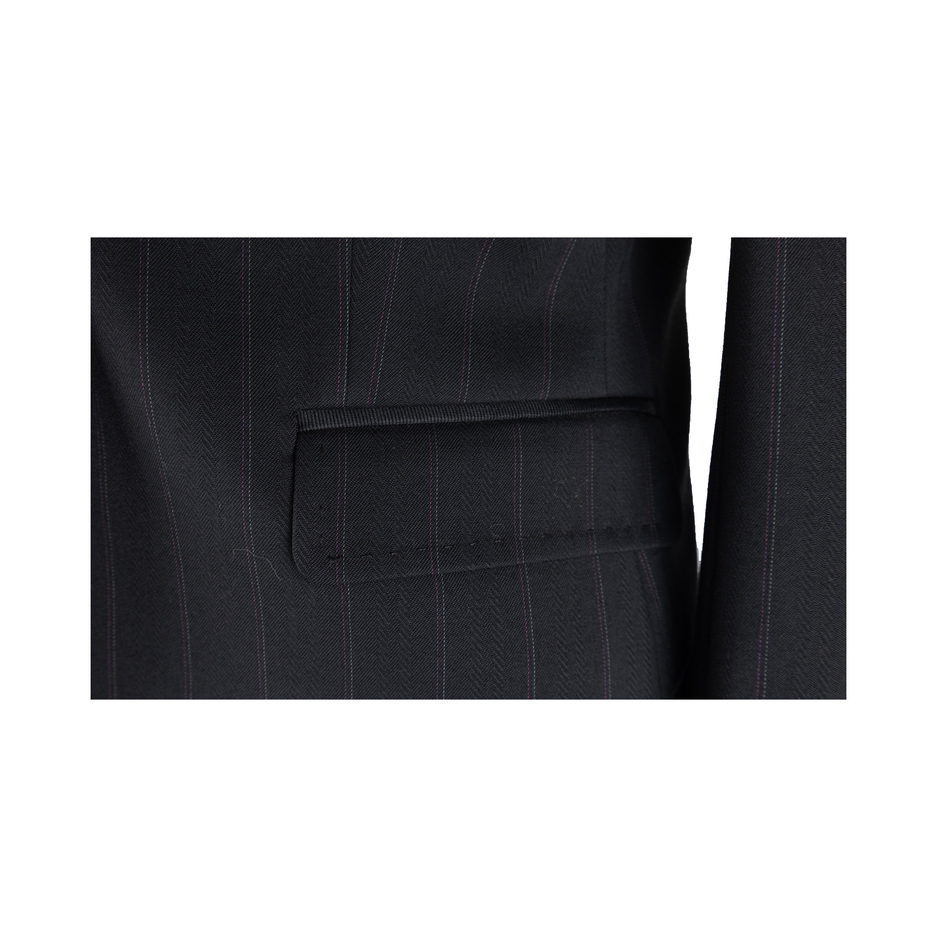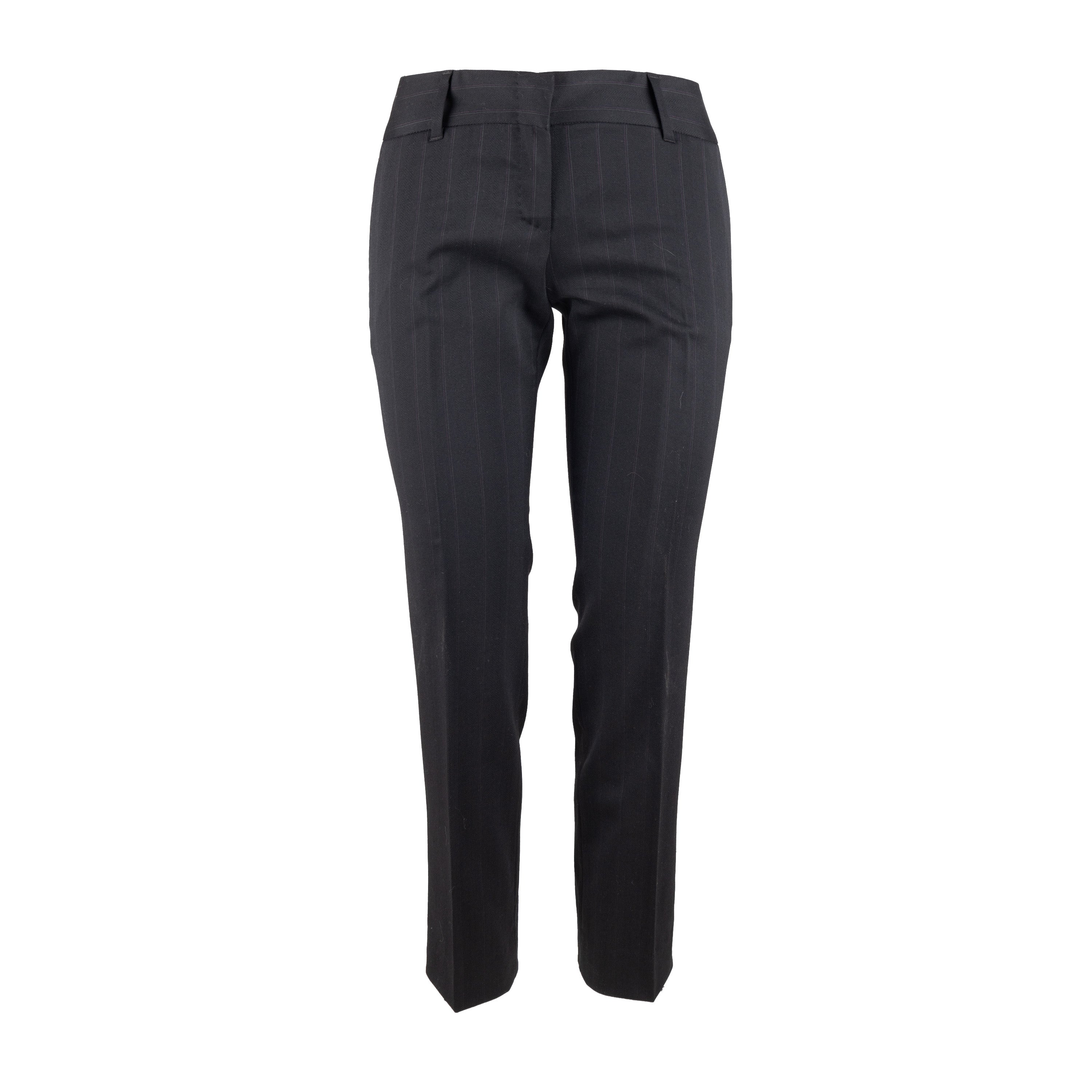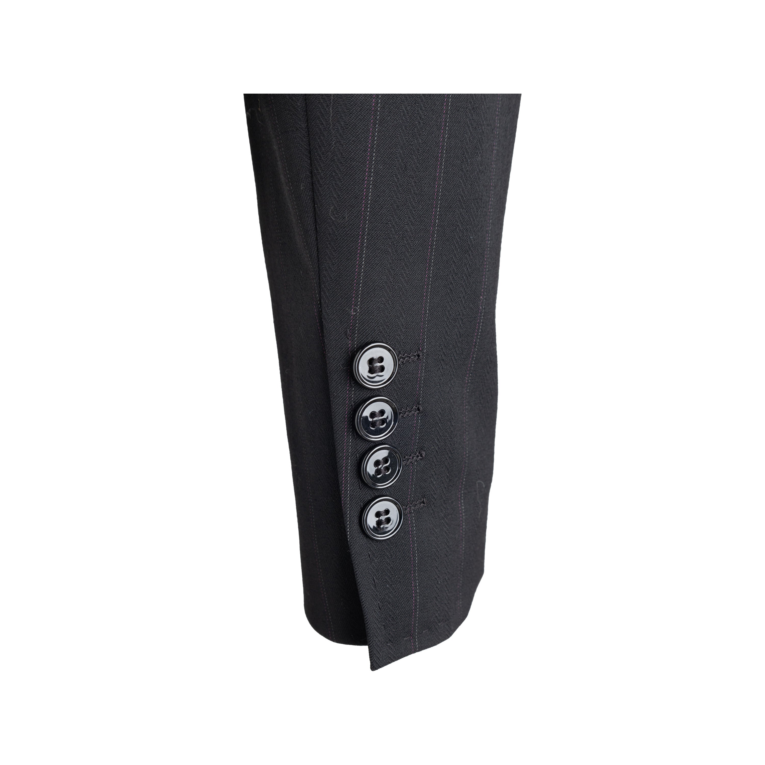 This Dolce & Gabbana suit is expertly crafted from a luxurious blend of wool and silk, adorned in tonal stripes. This lined jacket features a classic one button front with lean-cut contrast lapel collar, buttons at the cuffs, a chest pocket, and two flap pockets. The trousers offer a classic tailored fit, with a decorative pocket at the back. Perfect for the modern woman.