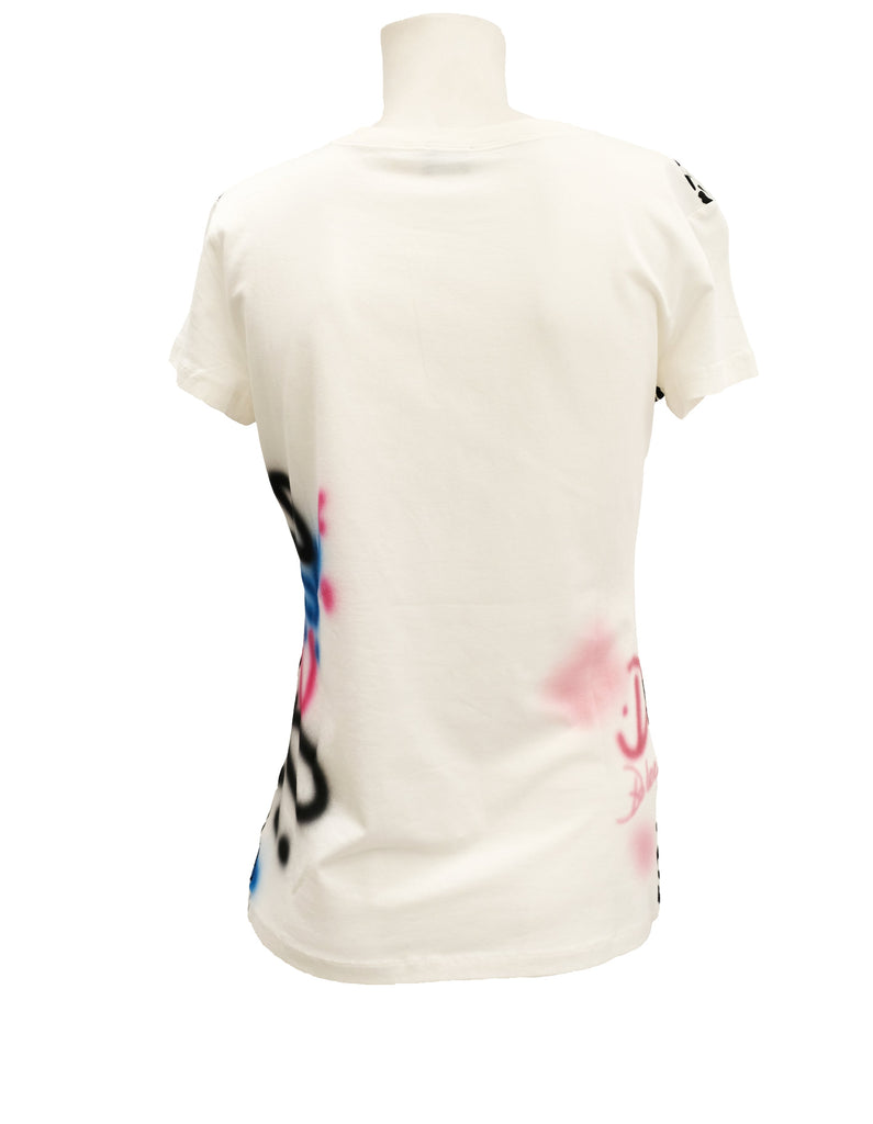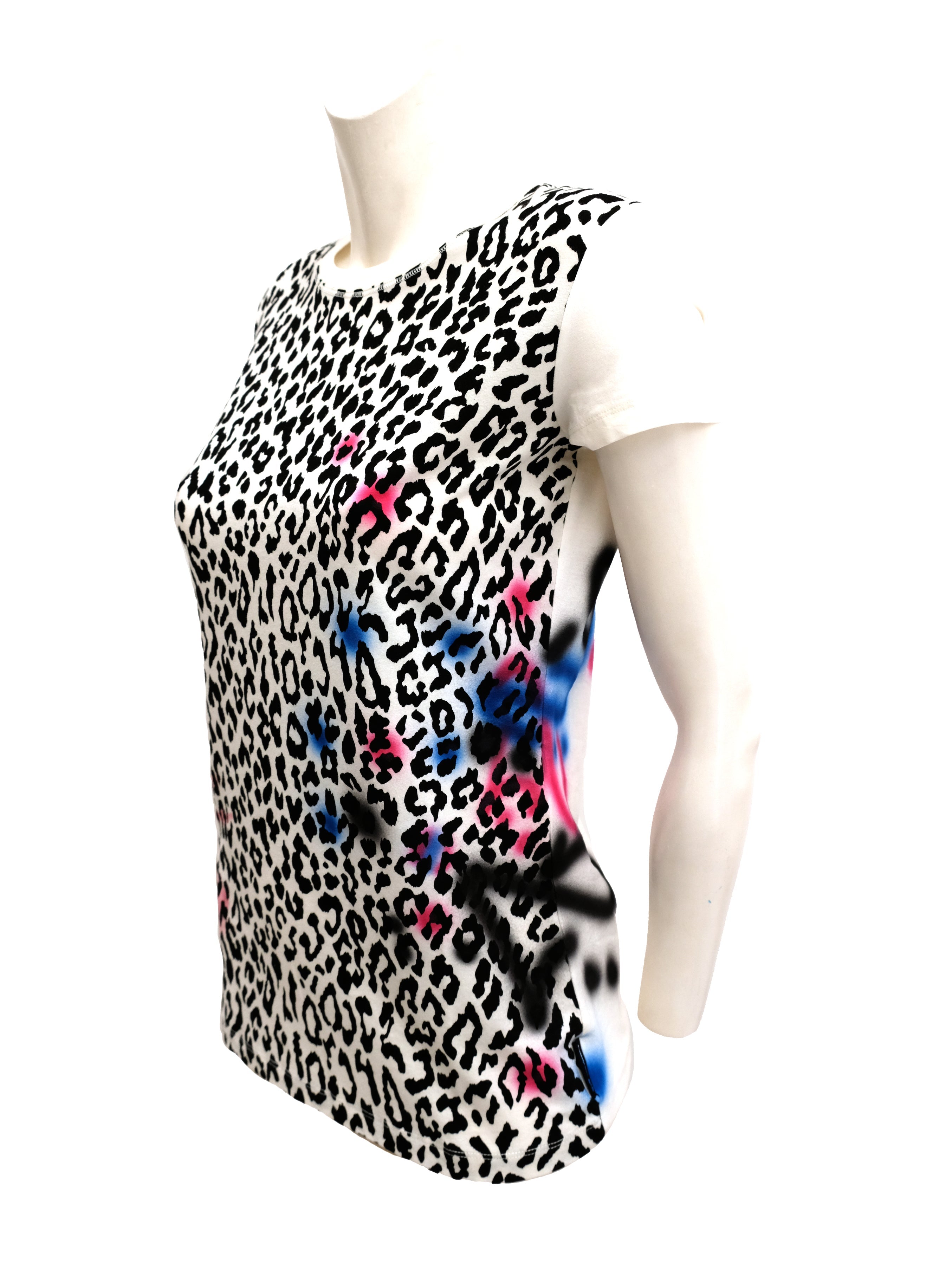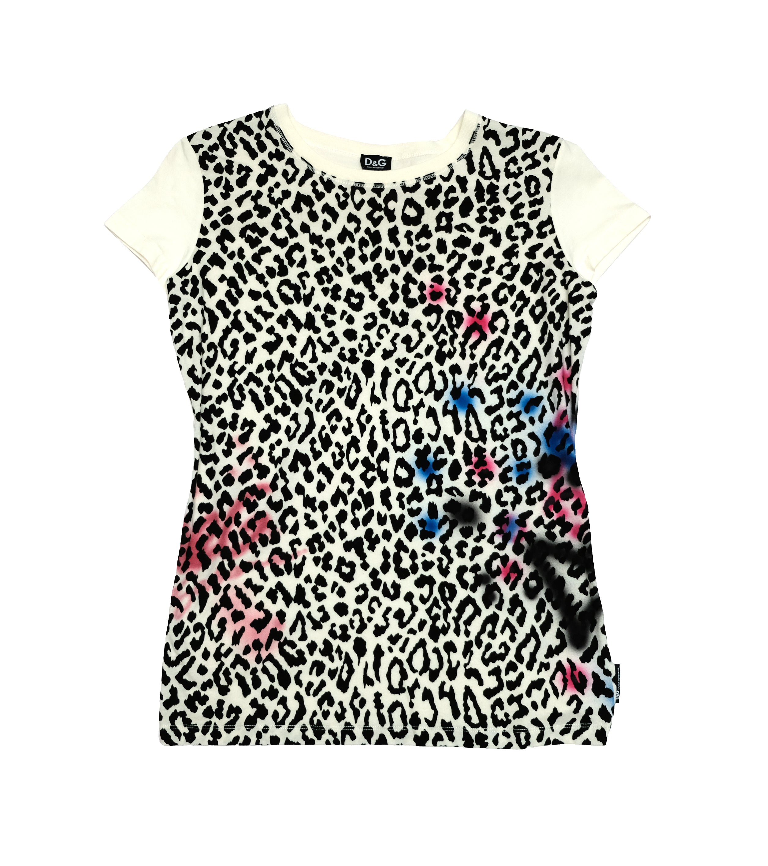 A cute graphic T shirt by Dolce & Gabbana in white cotton, with monochrome leopard spots to the front panel. Artfully covered in red and blue spray can graffiti with initials D&G.