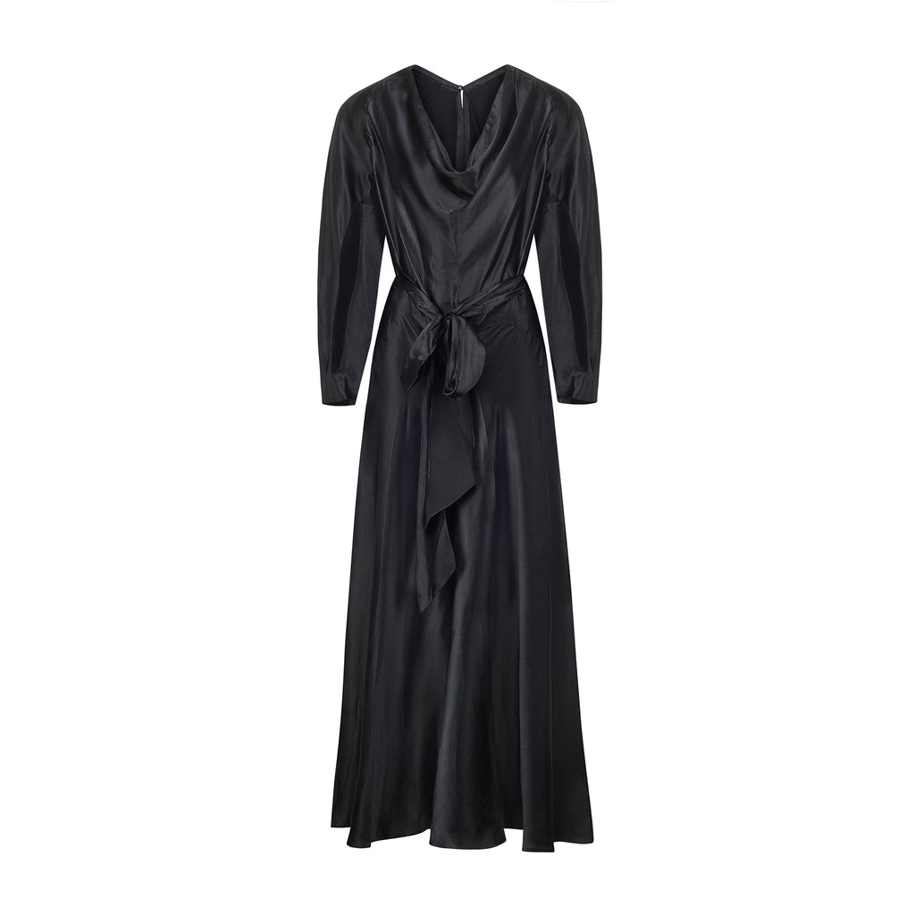 1930s Haute Couture Black Liquid Satin Maxi Dress with Open Sleeves