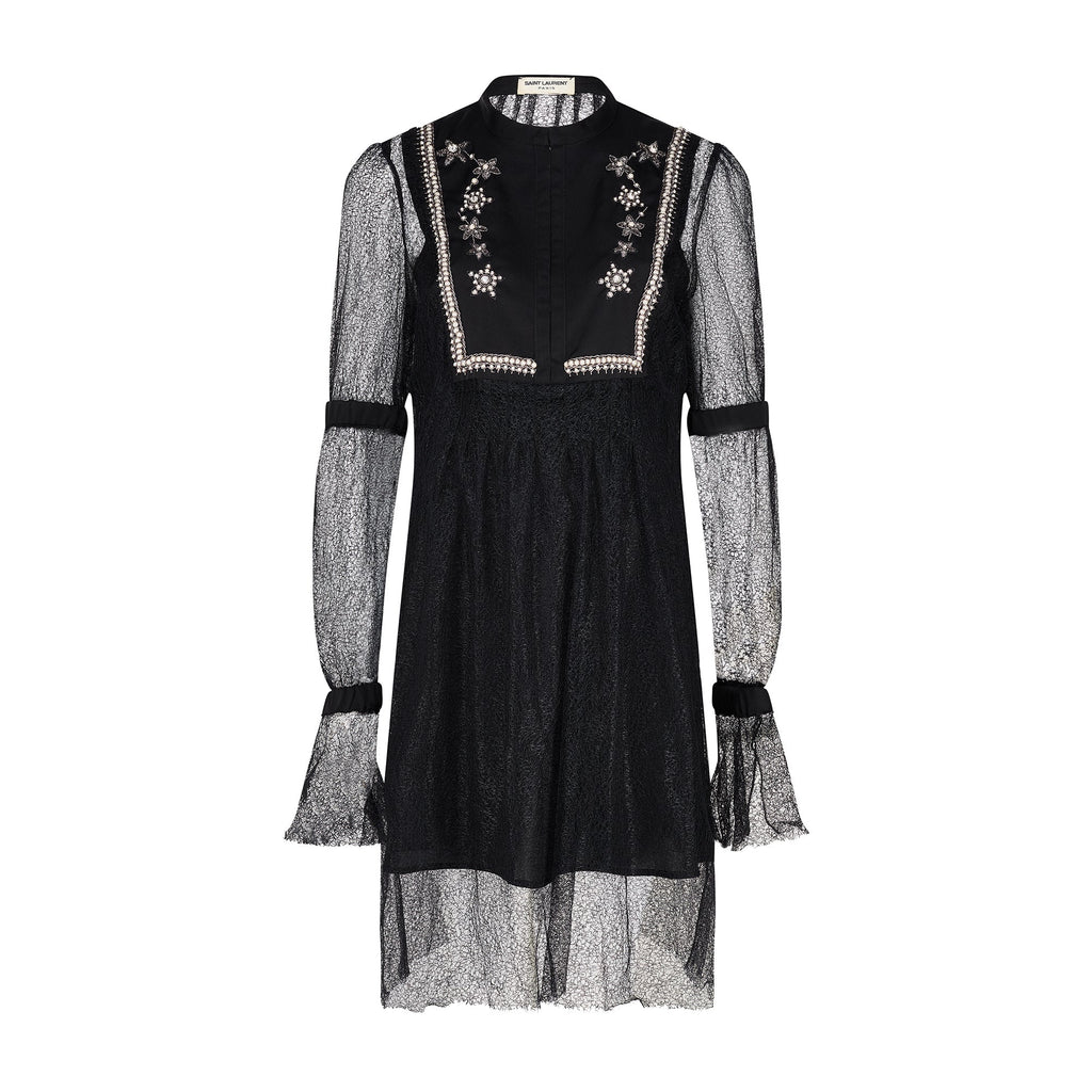 2017 Saint Laurent Embellished Yolk Black Lace Dress
