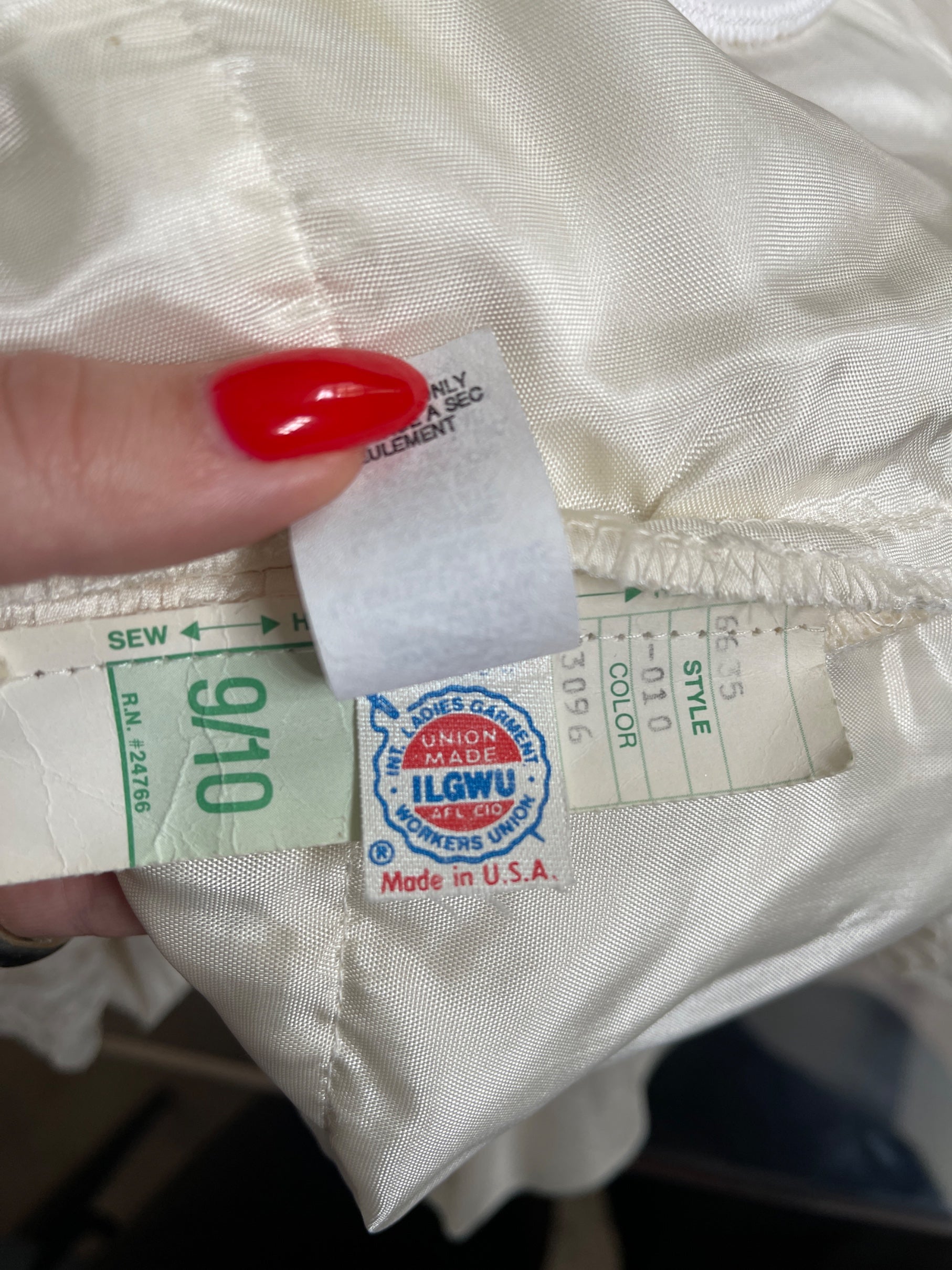 The dress is in very good vintage condition and is dry-cleaned, ready to wear. Not a condition issue per say; however, the nature of this silk means that the texture is uneven with visible thicker threads and natural imperfections in the weave which look like pulls. The fabrics used are 100% Silk with embellishments of 100% Acetate. It retains the ILWGU manufacturing label dating the dress from the period 1974 to 1995. There are no size labels so please check the below measurements as the fabric has no stretch. Our model is a UK 8-10, US 4-6, and 5'9". This dress fit her perfectly.