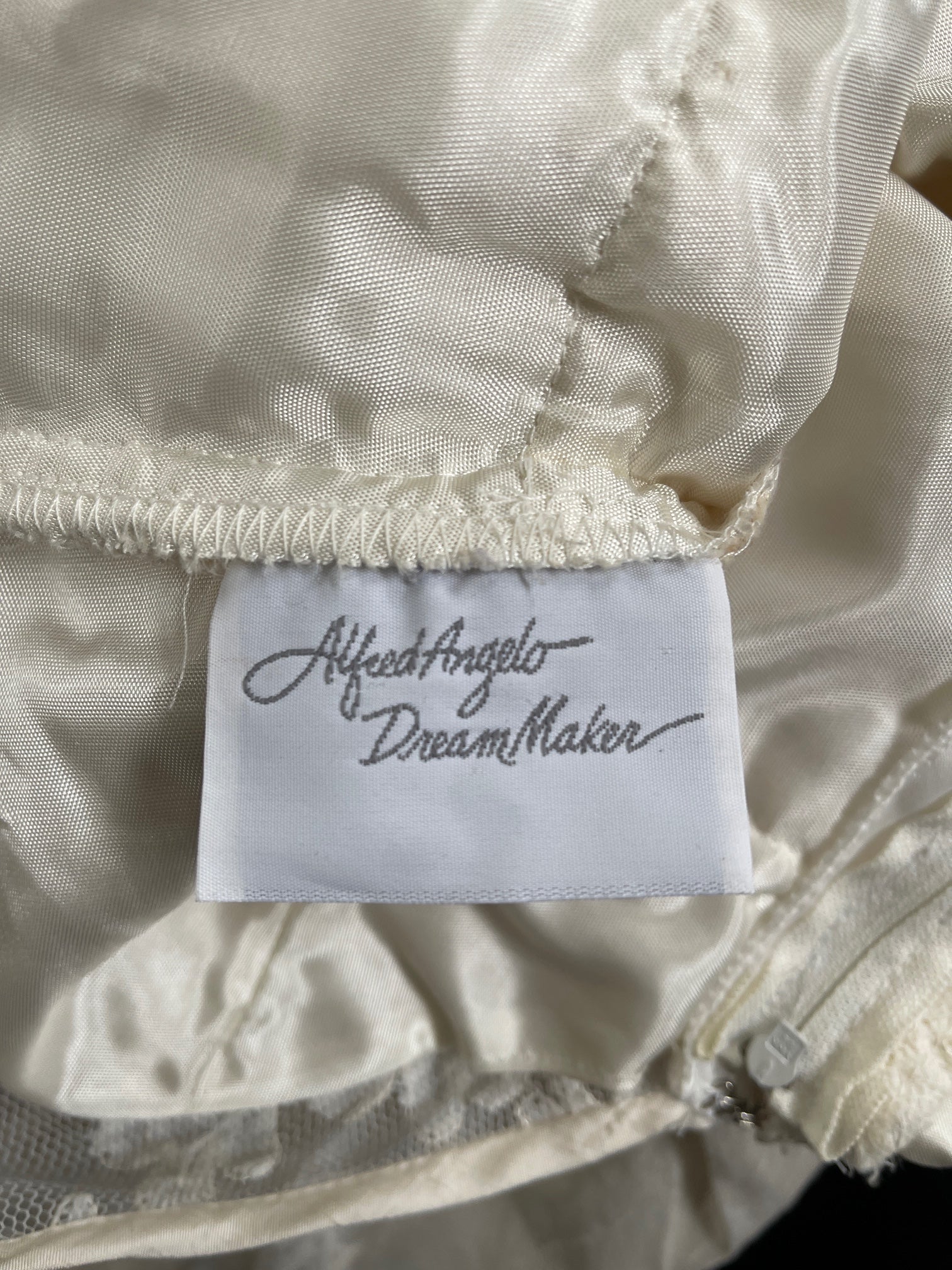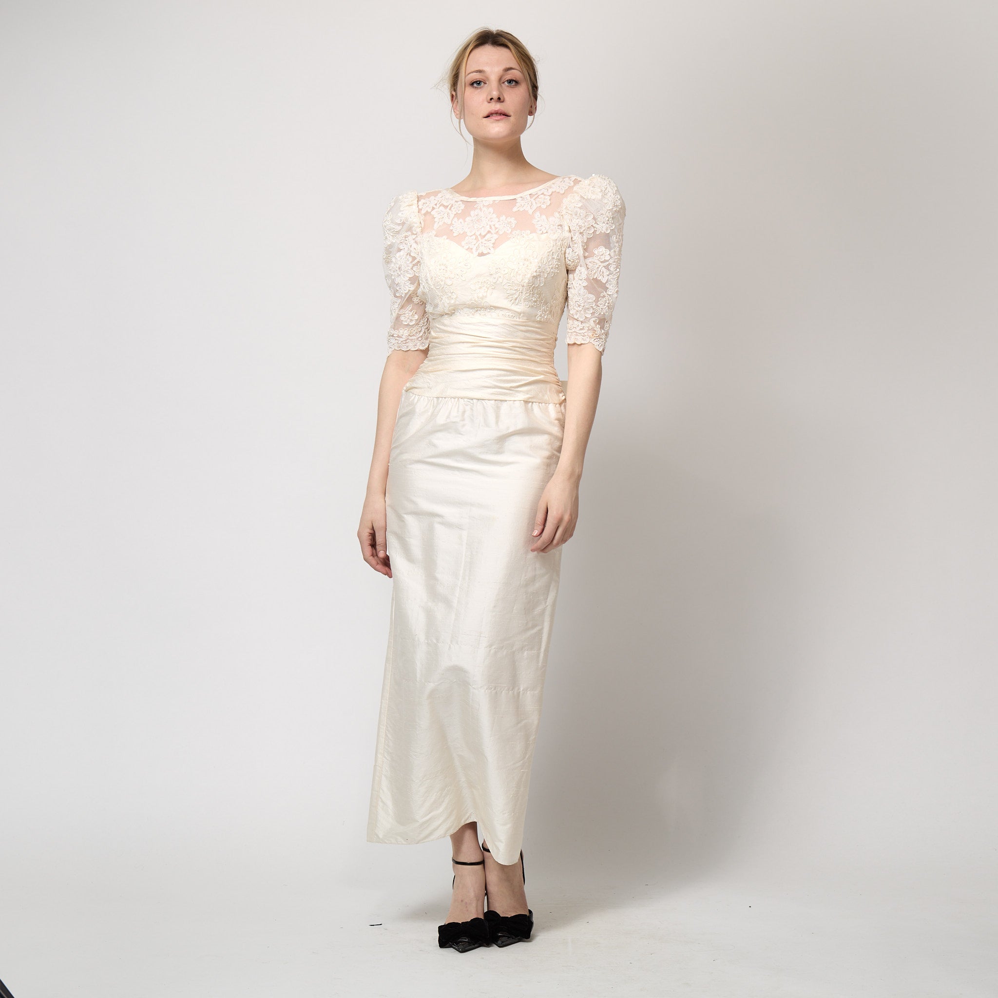 1990s Alfred Angelo Off White Raw Silk Dress with Tulle Bodice