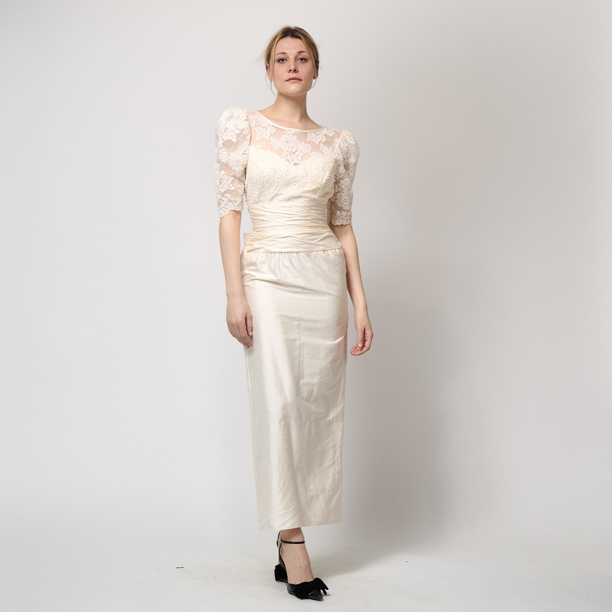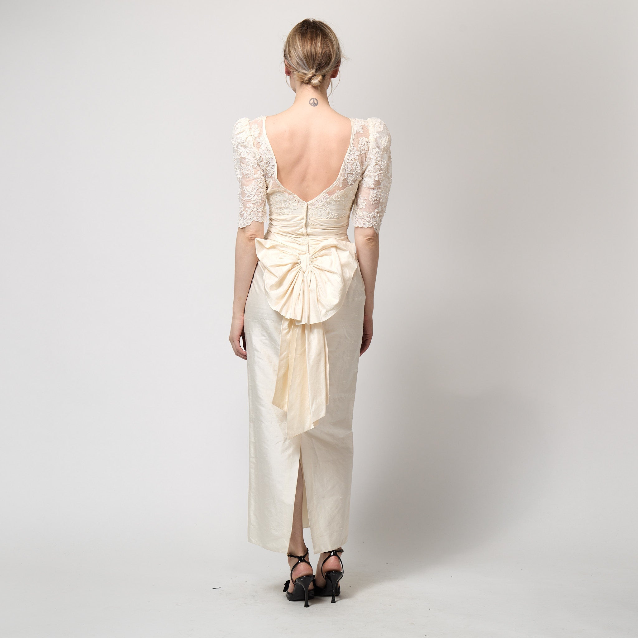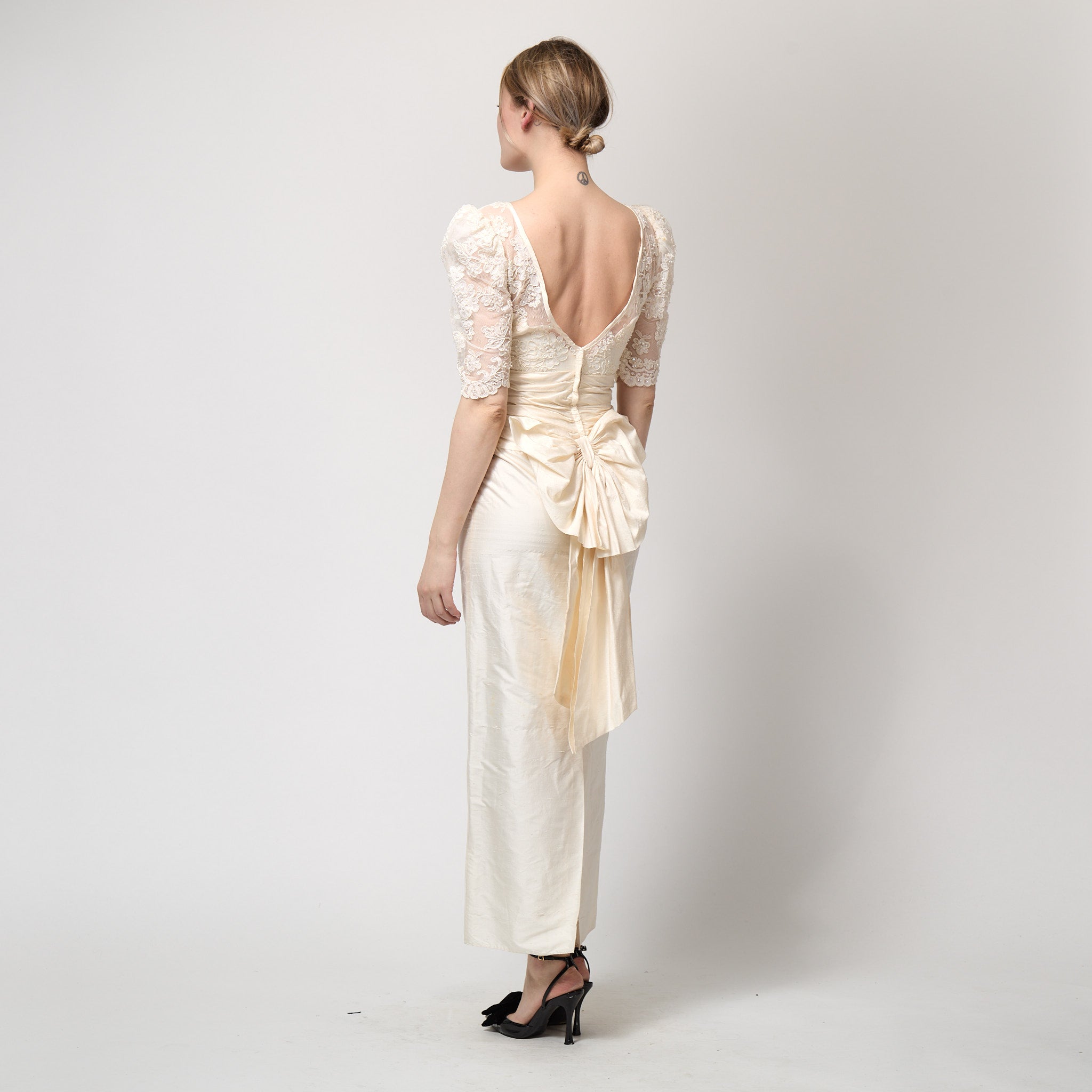Alfred Angelo was a Florida-based designer of bridal gowns founded in the 1930s. This vintage wedding dress was created in the late 1980s to early 1990s and is tailored from lustrous shot-silk and elaborately embellished lace. The silk skirt is fitted and falls to the ankle in a column style. The waistband is ruched and delicately positioned around the waist. Elbow length sleeves are tailored from tulle which has been decorated with appliqué lace, ribbon work, sequins and delicate teardrop shaped pearls. The rounded neckline at the front is trimmed with shot-silk and gives way to a low V-shaped back which closes with a hidden tonal zip and hook-and-eye. There is a large bow that sits pert like butterfly wings and two tails fall from underneath the bow to the back of the knees. The dress is lined in cream satin and features a padded bust.