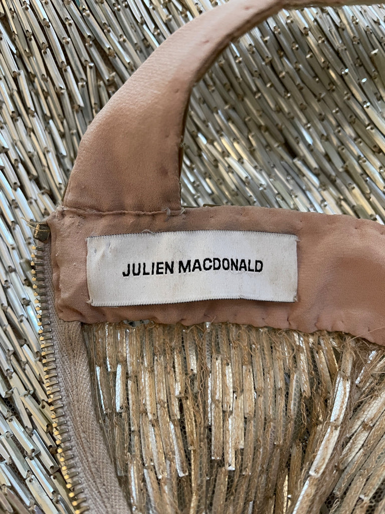 Note on the designer: Julien Macdonald OBE rose to prominence in the late 1990s. After graduating from the Royal College of Art, he was hired by Karl Lagerfeld to work at Chanel, and was later appointed chief designer at Givenchy. In 1997, Macdonald launched his eponymous label and it was here that he cemented his reputation for high-octane, couture-level craftsmanship. He was named “British Fashion Designer of the Year” at the 2001 British Fashion Awards and, in 2006, he was awarded an OBE for services to fashion. Macdonald is known for his meticulous handwork, opulent fabrics, and body-sculpting silhouettes that marry traditional techniques with unabashed sensuality. His designs, often featuring intricate beading, featherwork, and lacework, have made him a red carpet favorite and a key figure in modern fashion, celebrated for reviving the spectacle and decadence of haute couture in a contemporary context.