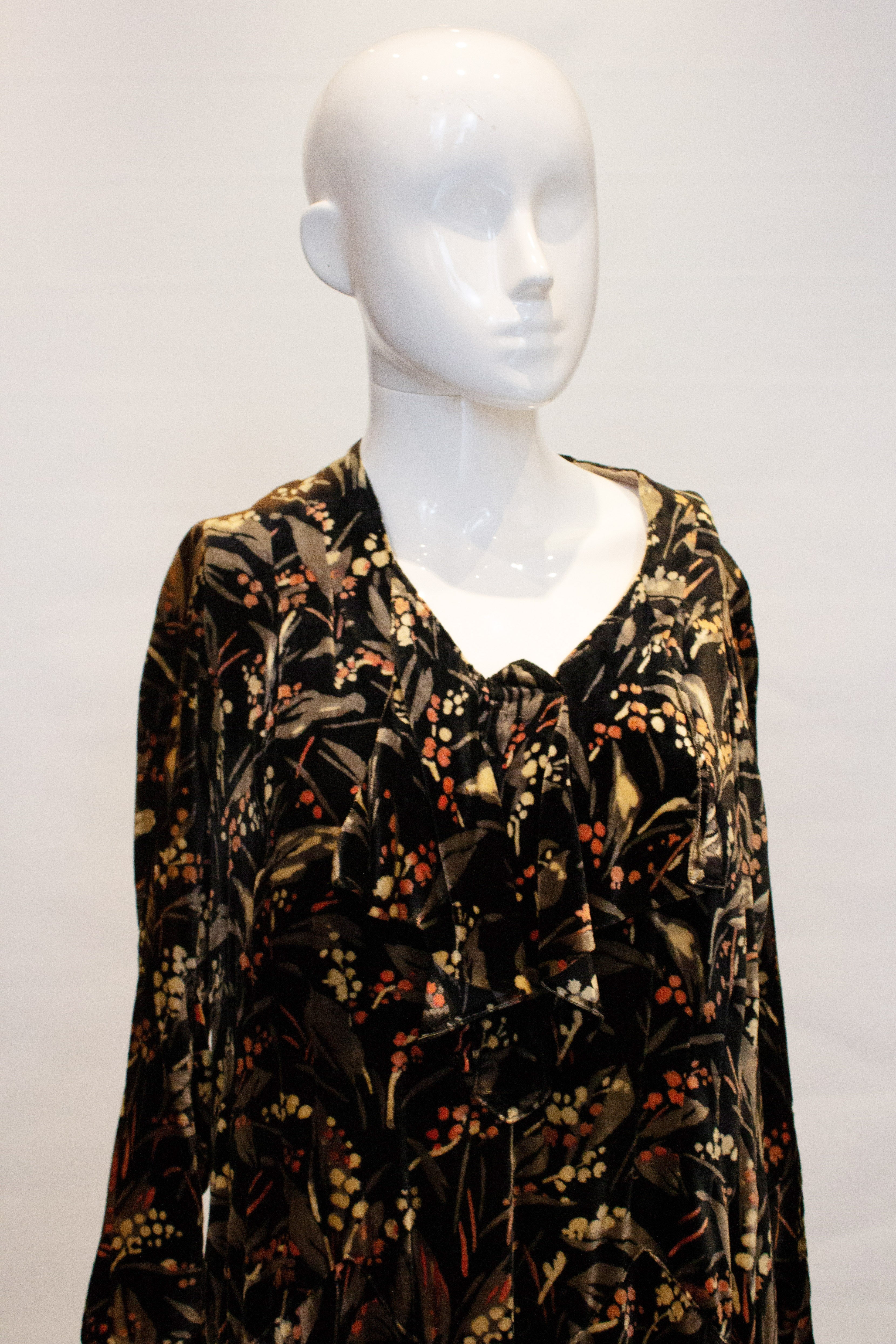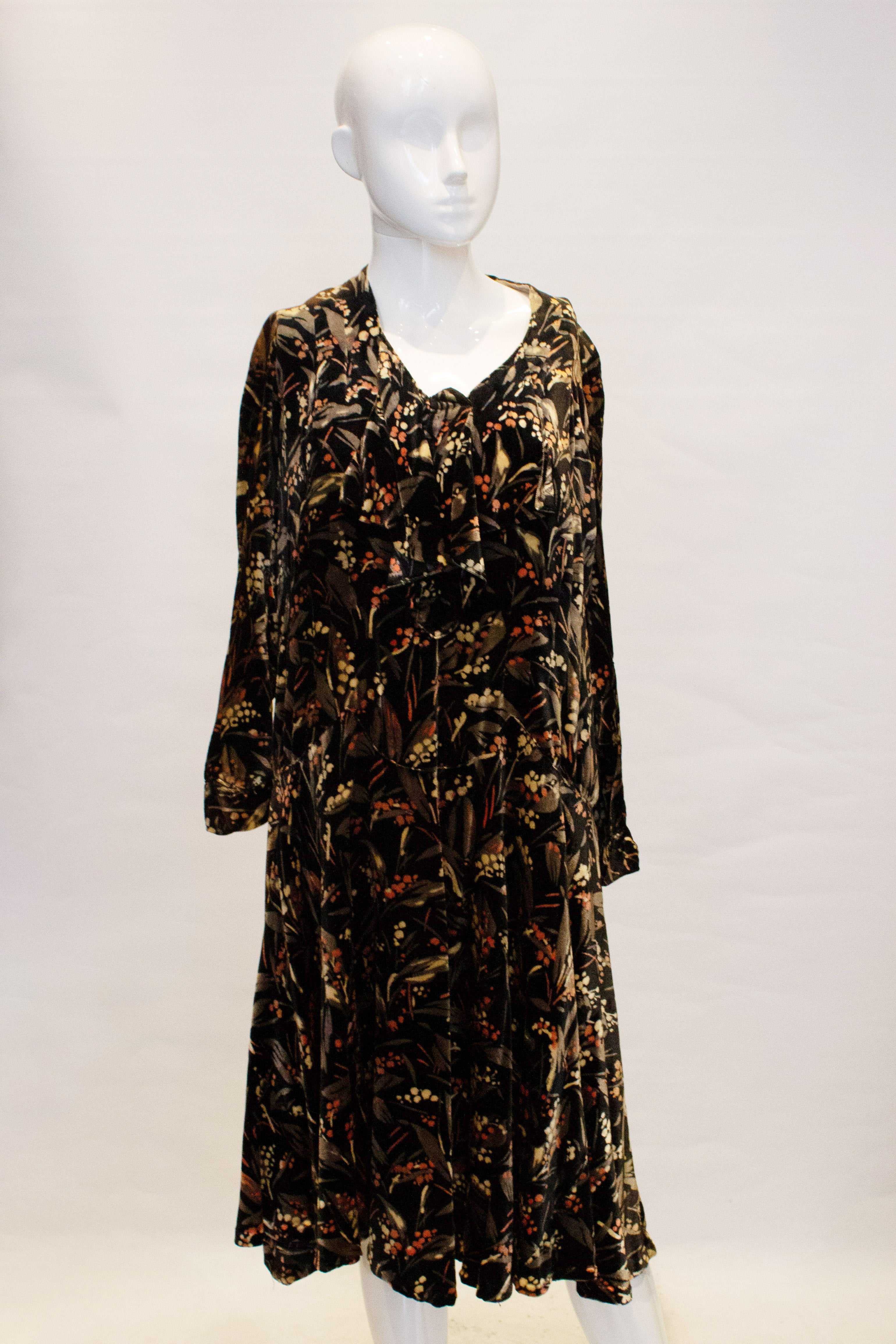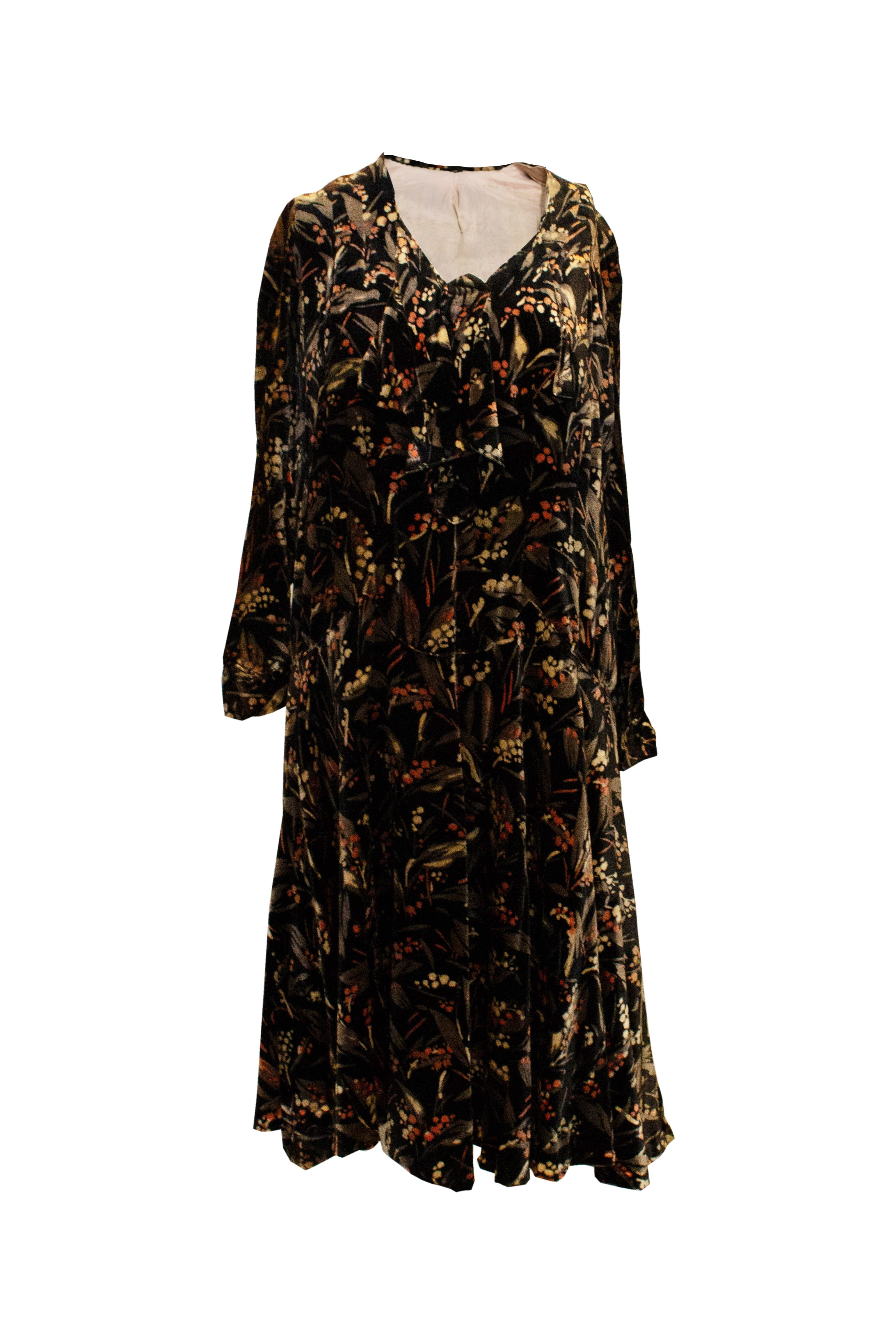 A pretty vintage velvet dress from the 1920s. The dress has a black background with cherry like print. It has pleats on the shoulder and a flap at the front and is partly lined. Measurements: Bust up to 40'',length 45''