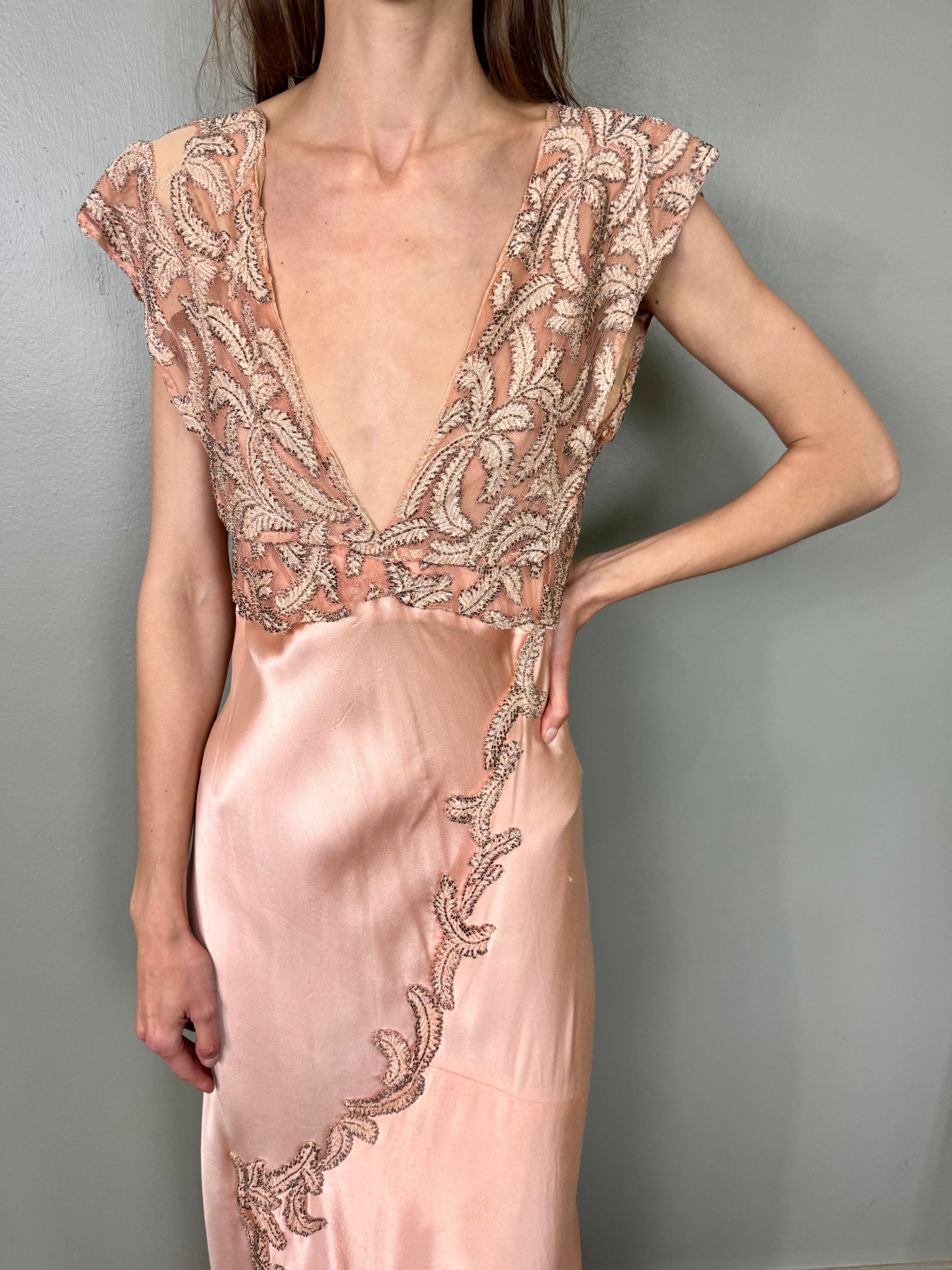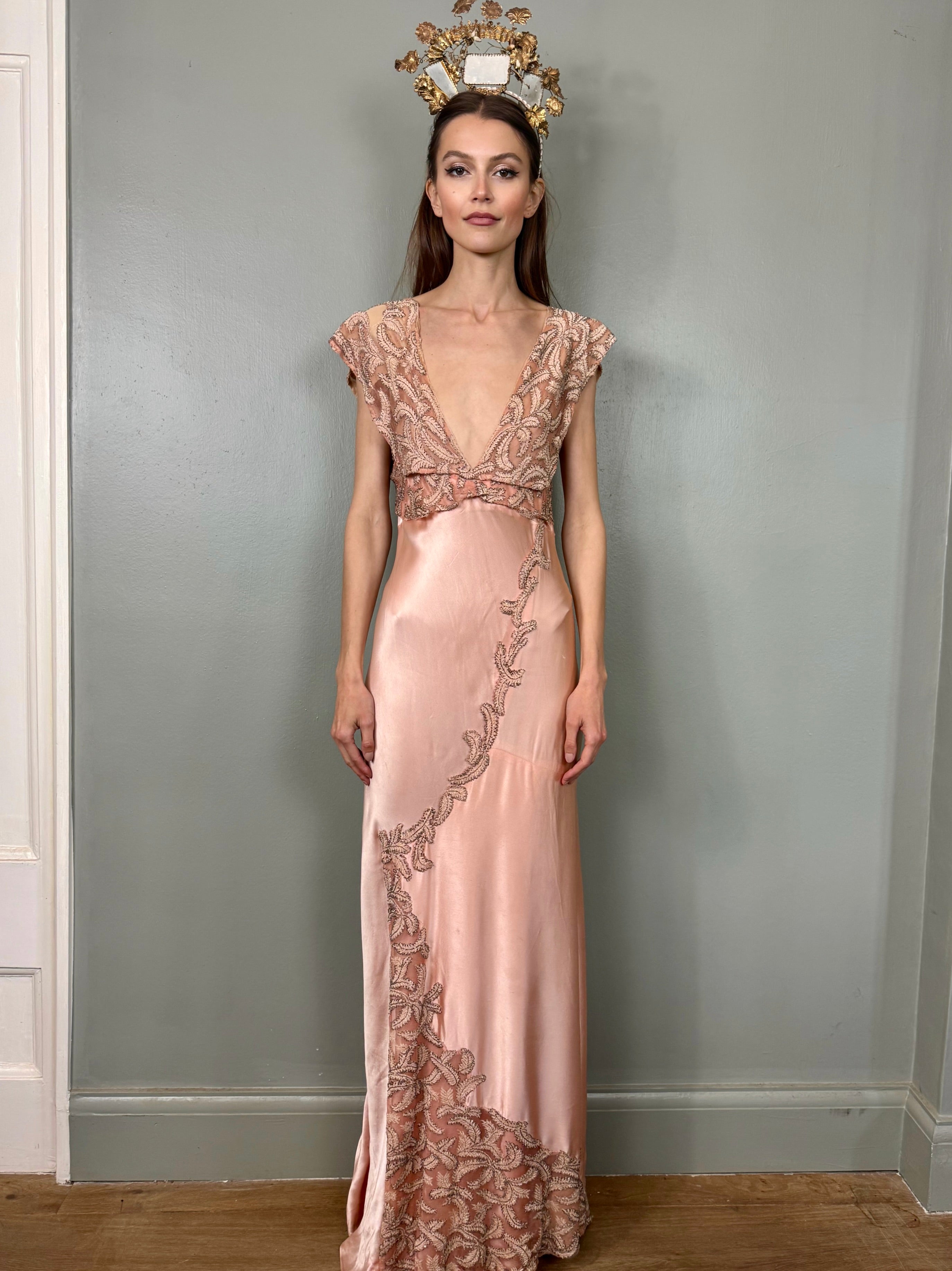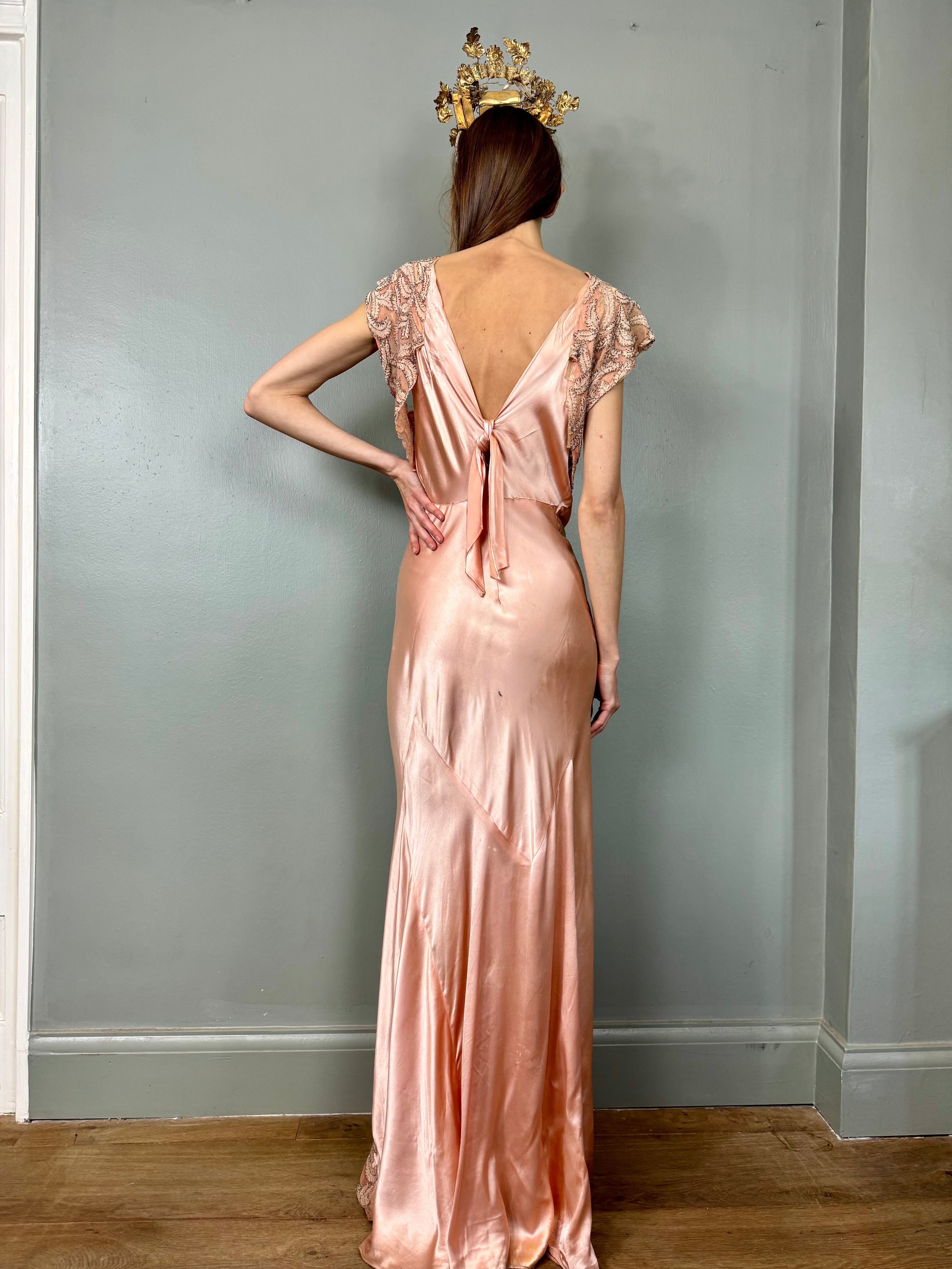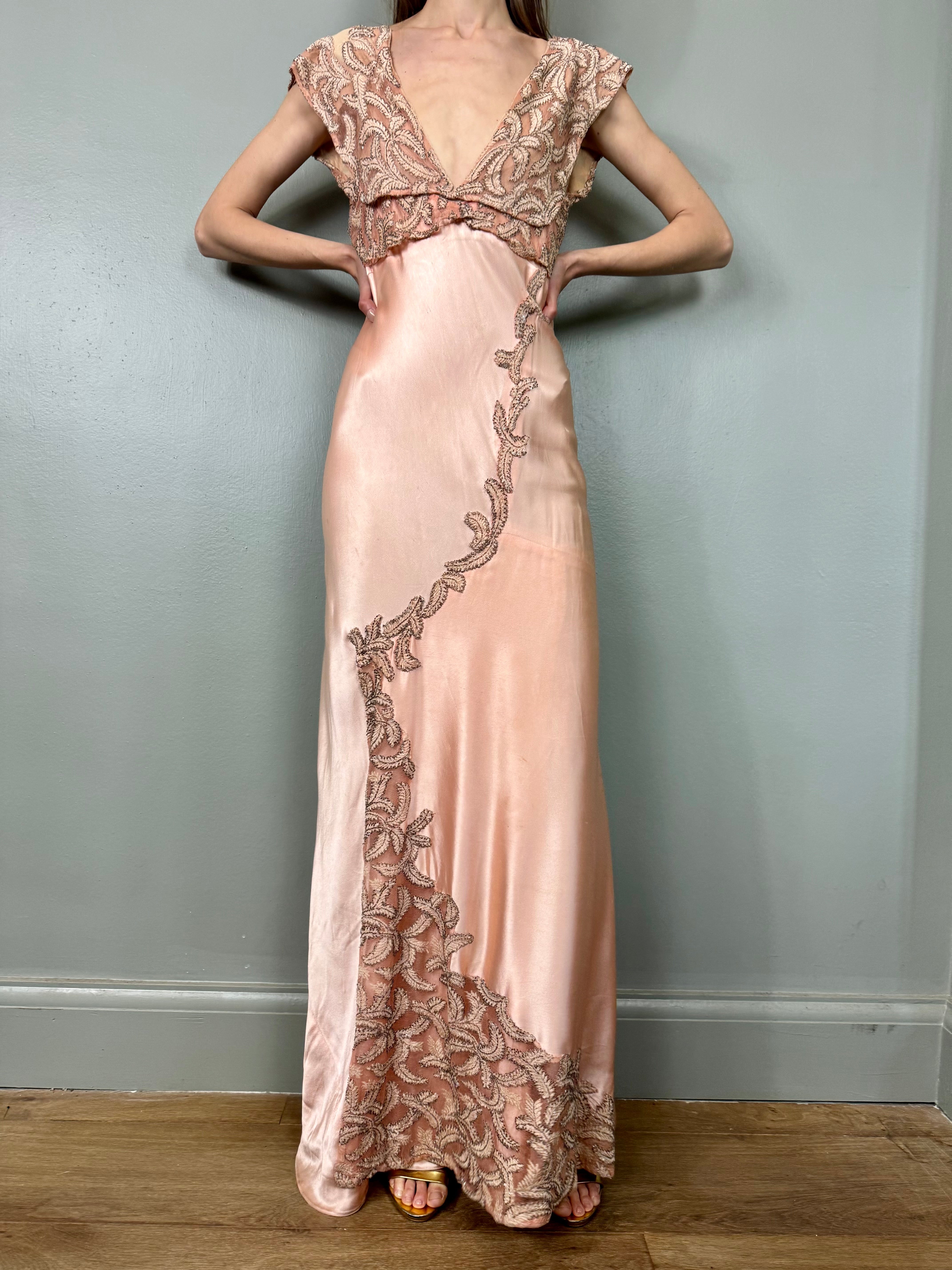 Experience timeless elegance in this silk 30s dress. Crafted with intricate beading and a bias cut, this dress highlights your curves and features a V neckline and knotted back with gorgeous cup sleeves and a slight tail. Fastens on the side.