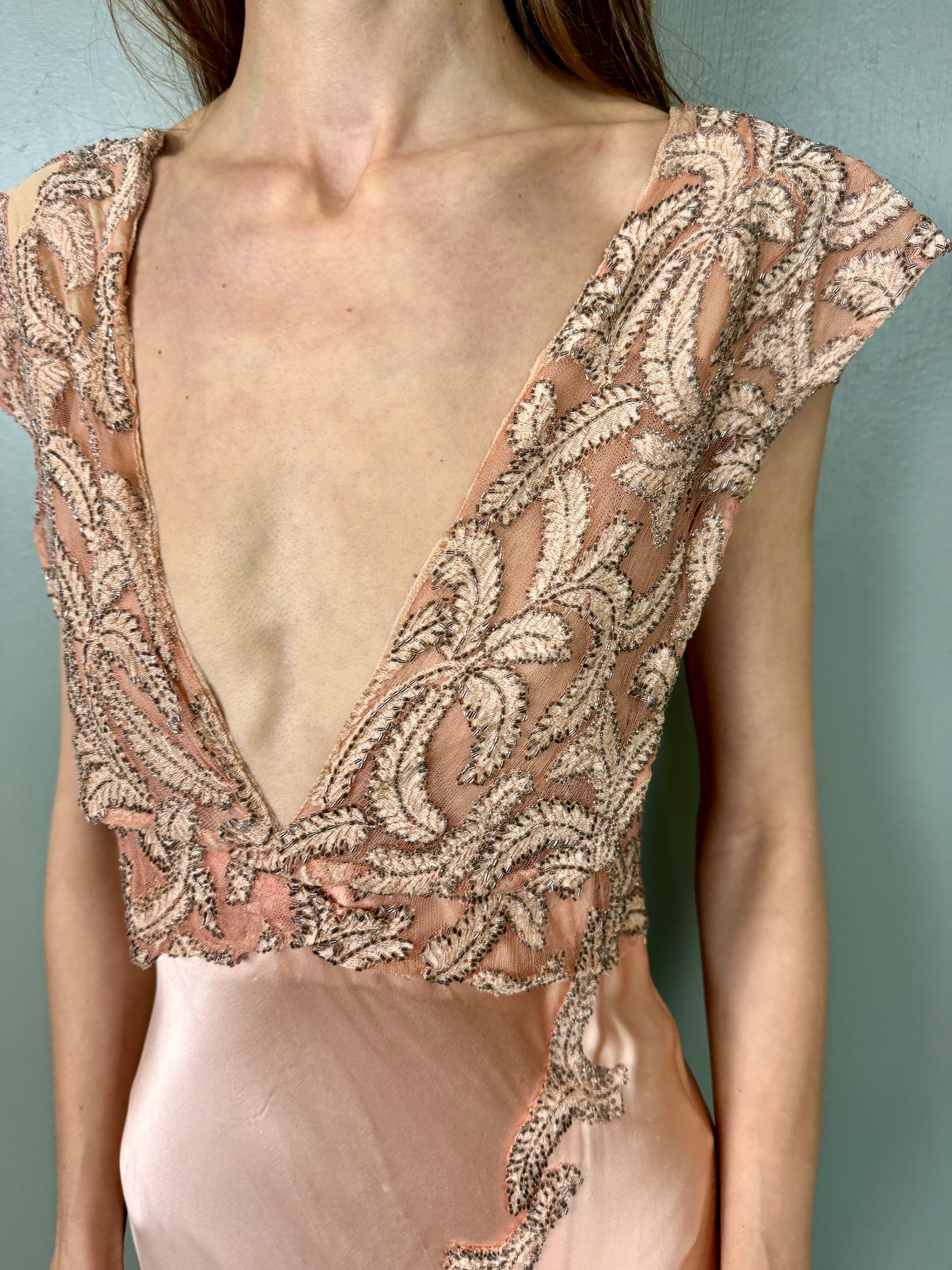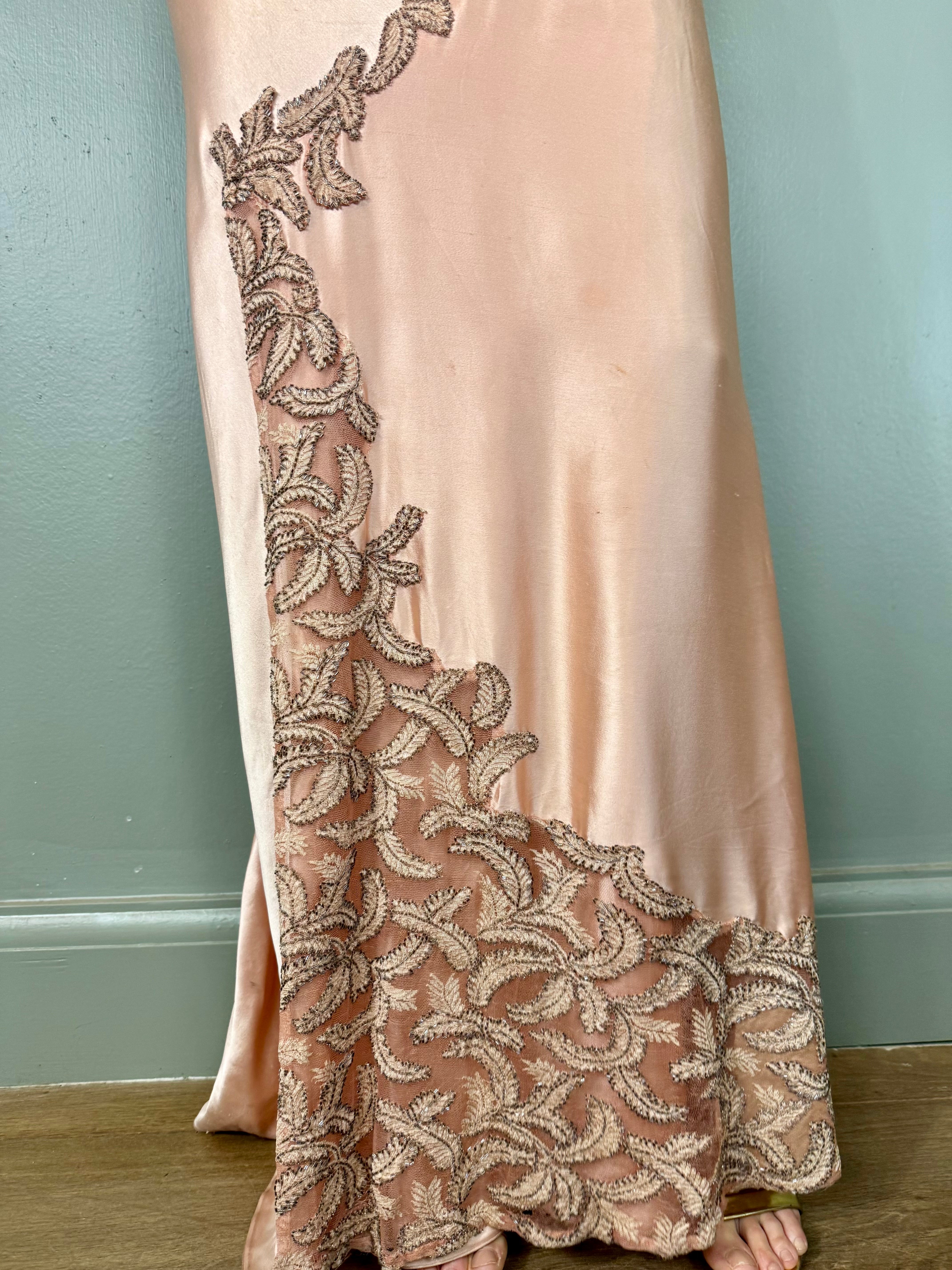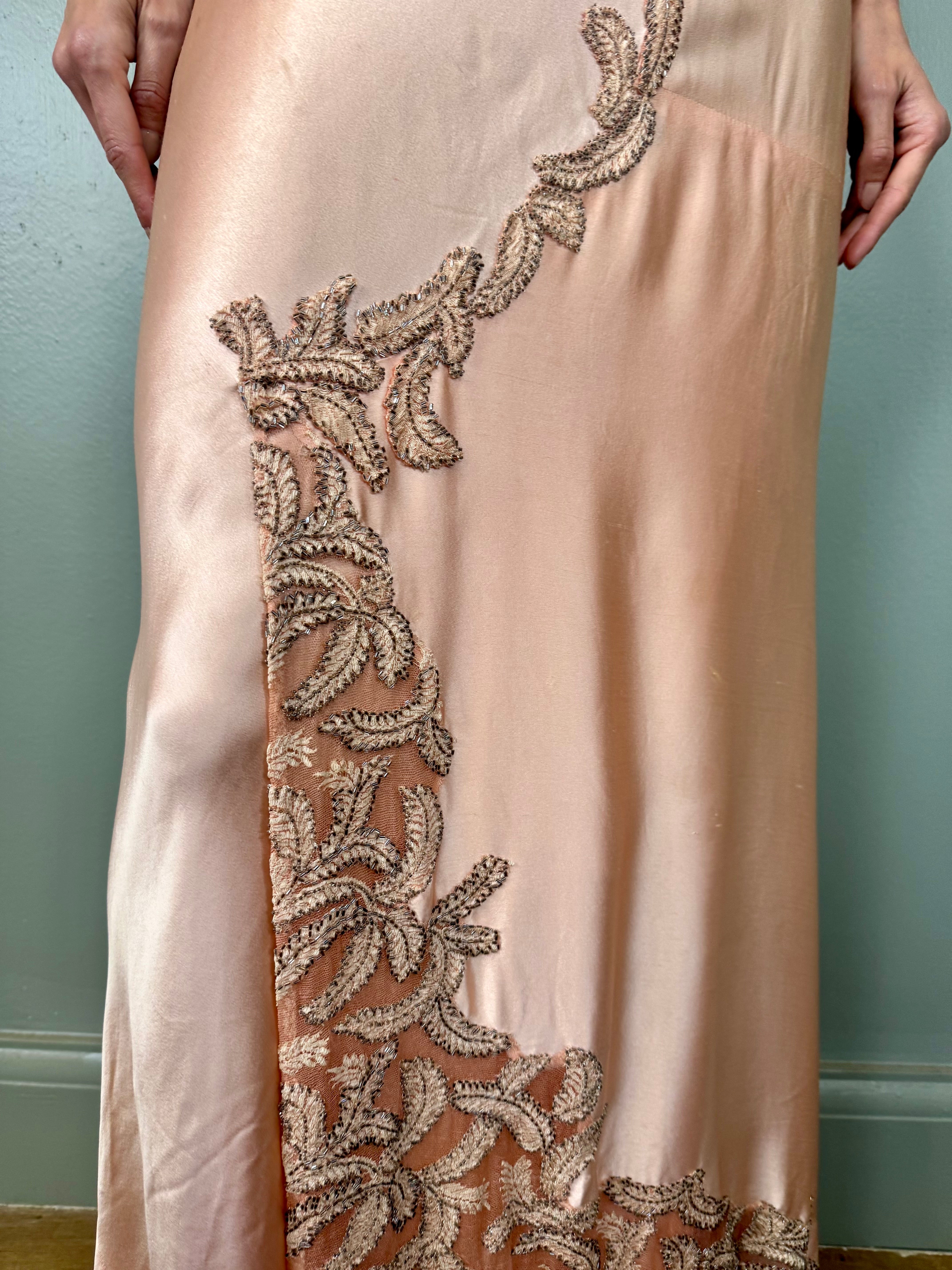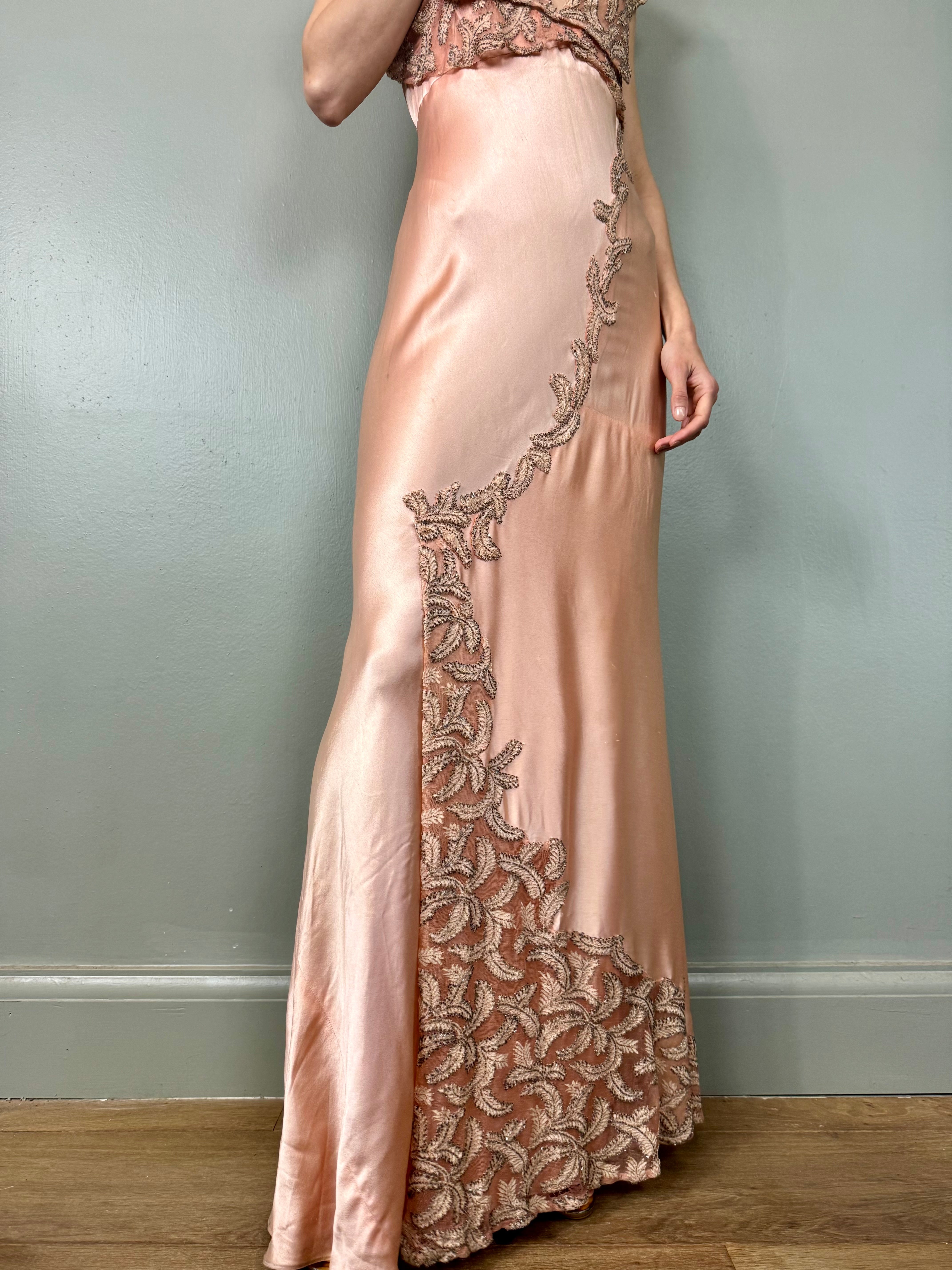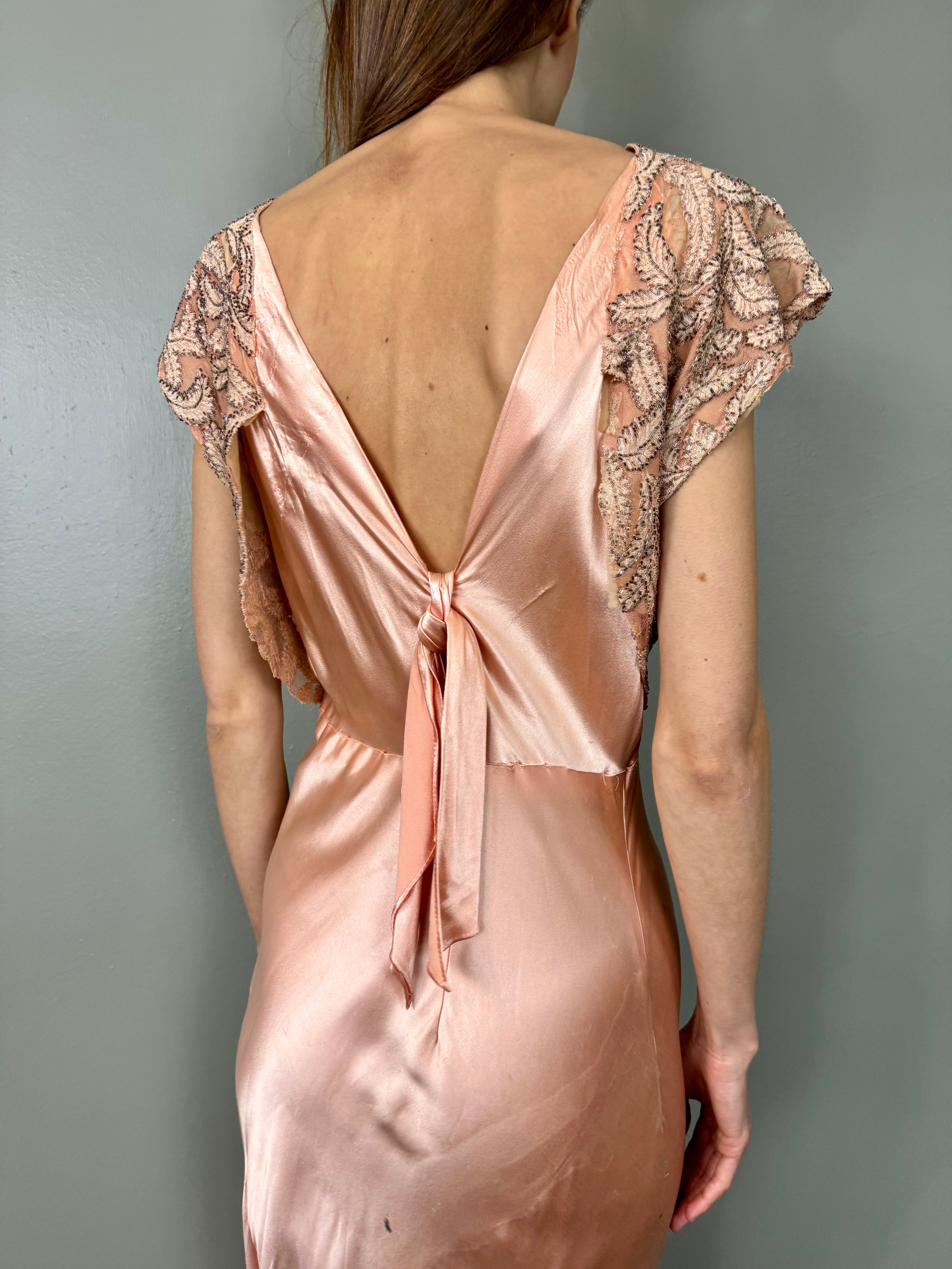 Experience timeless elegance in this silk 30s dress. Crafted with intricate beading and a bias cut, this dress highlights your curves and features a V neckline and knotted back with gorgeous cup sleeves and a slight tail. Fastens on the side.