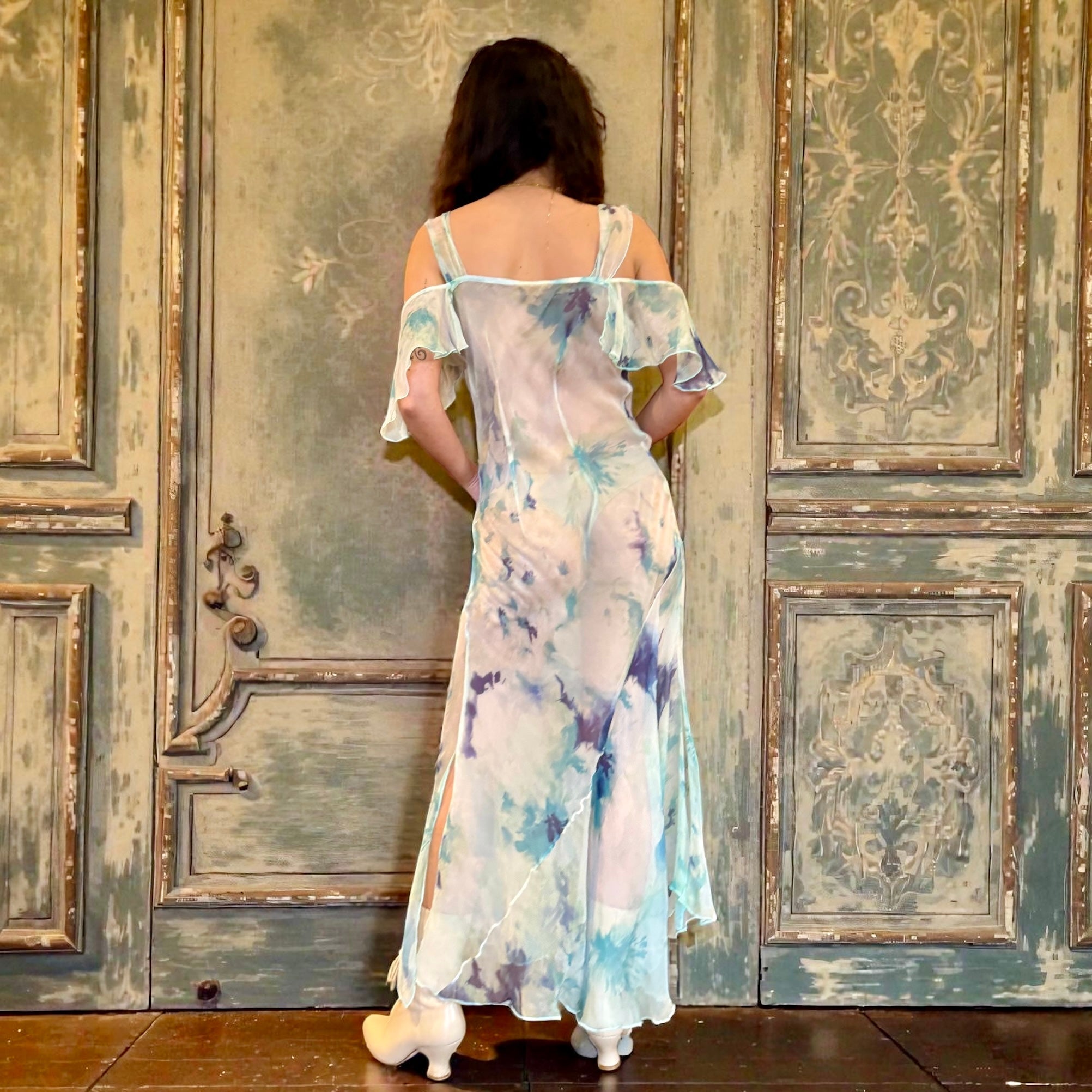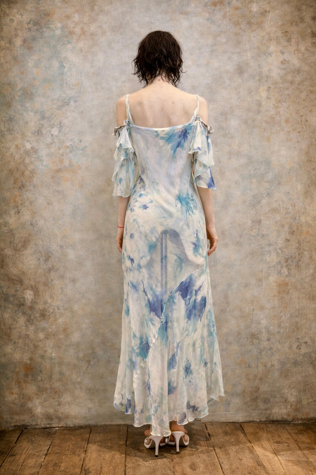 Aqua, 90s pale blues, bias cut chiffon dress with frill sleeves