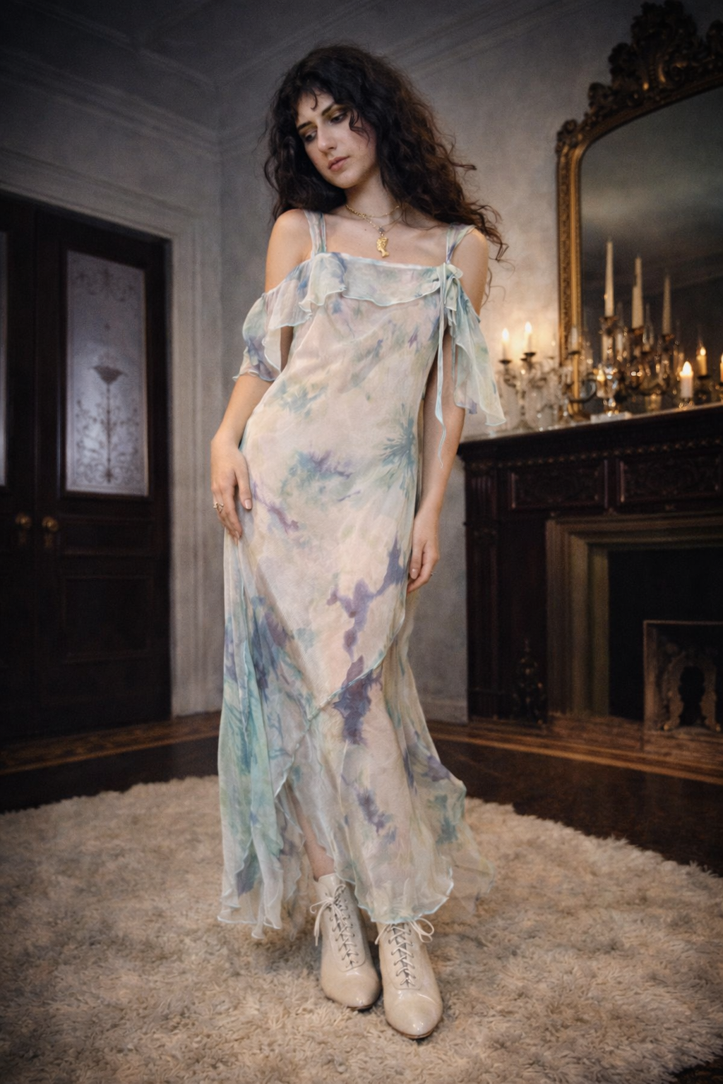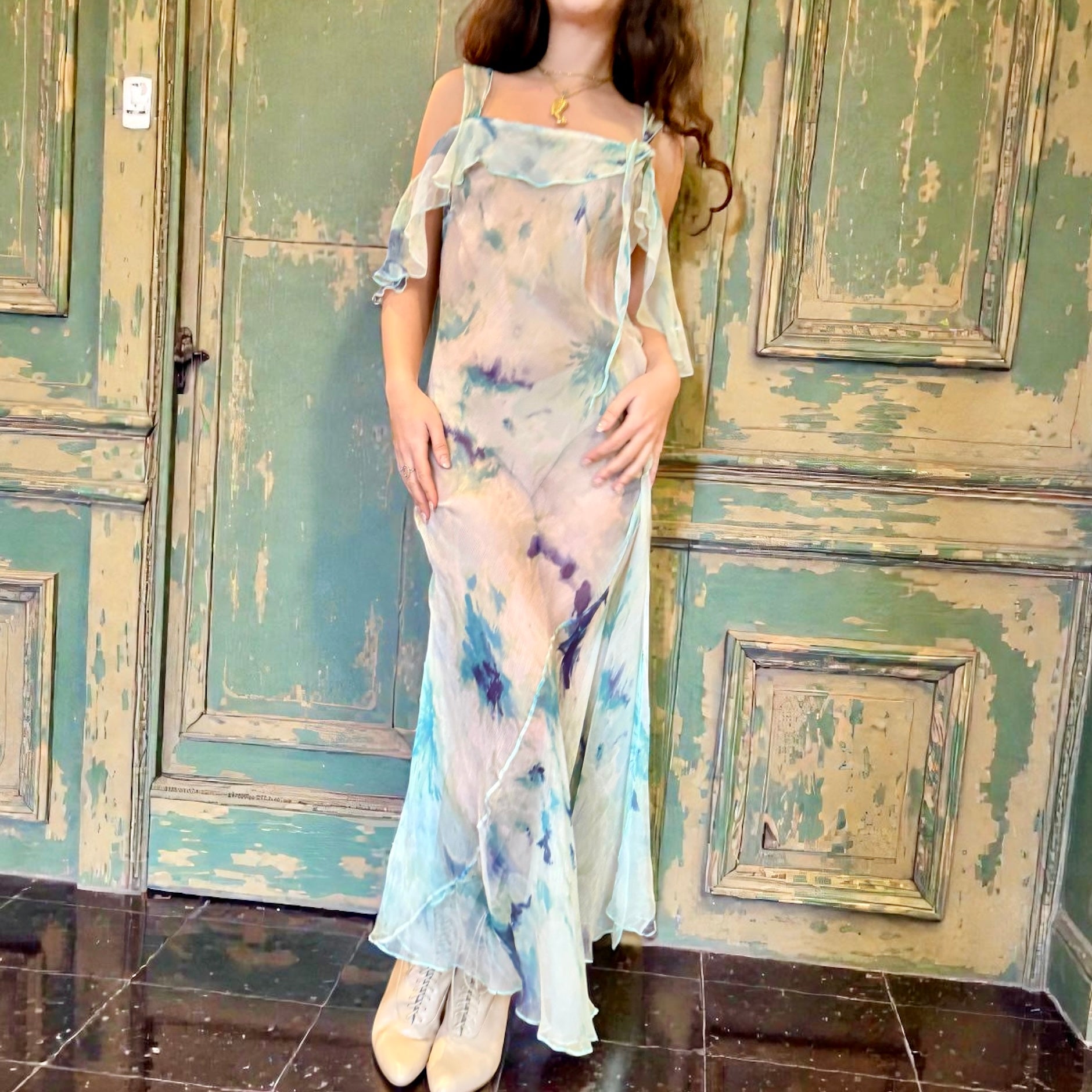 Effortlessly exude wispy playful sensuality with this 90s silk chiffon dress. The bias cut and leg slit offer a touch of allure, while the frill sleeves and neckline add a playful touch. Perfect for any occasion, this unlabelled dress is a must-have for any summer getaway.