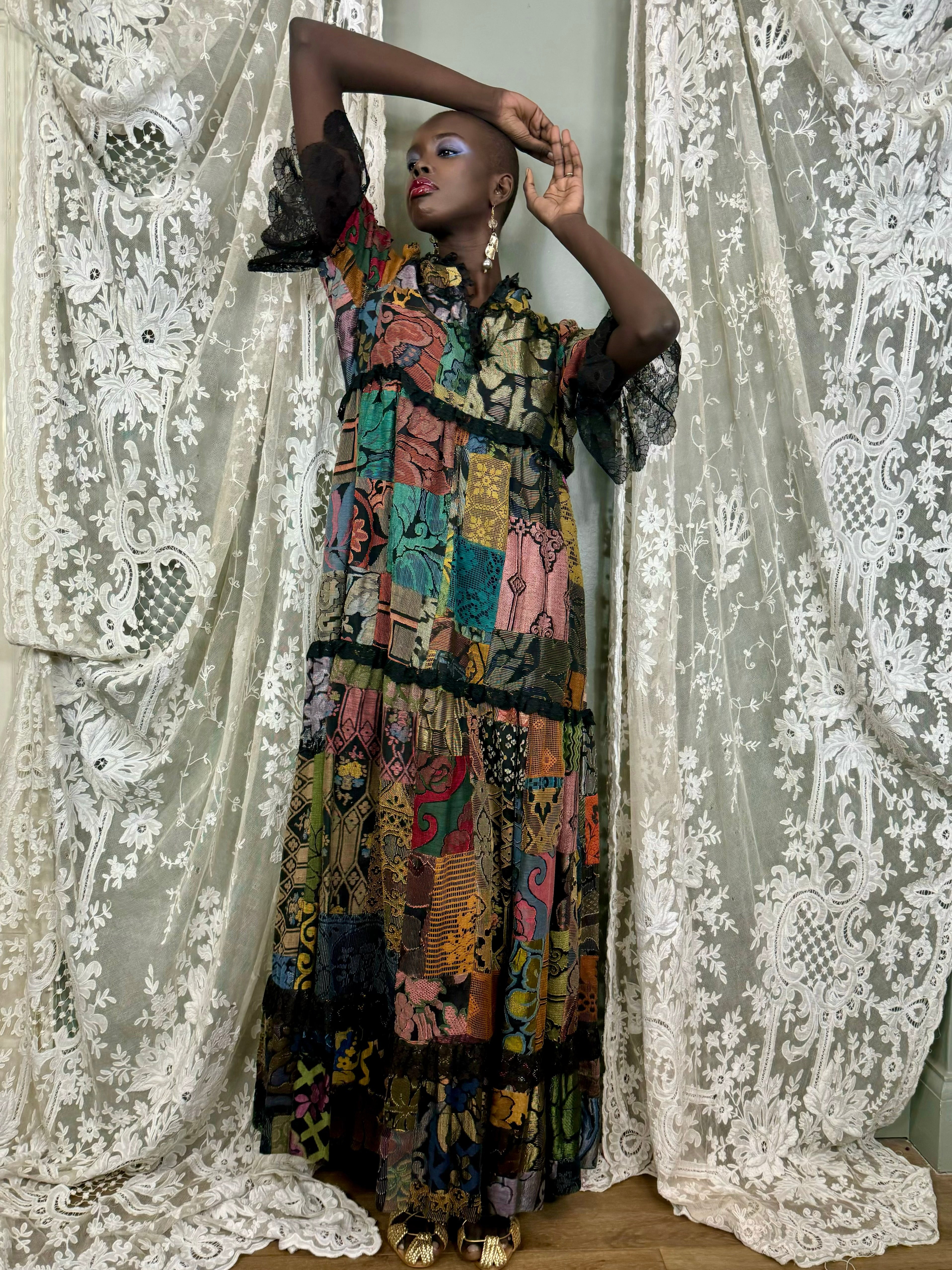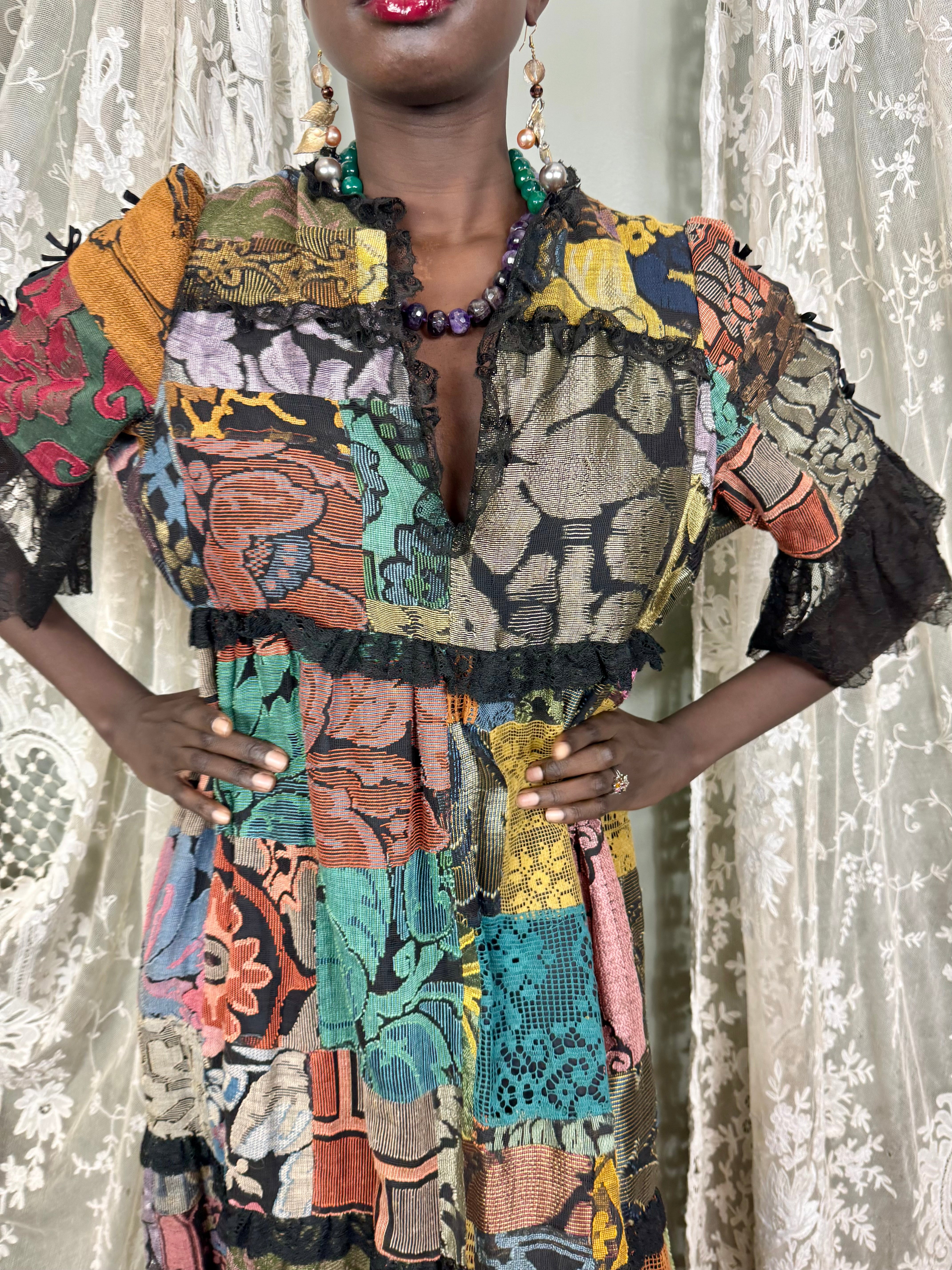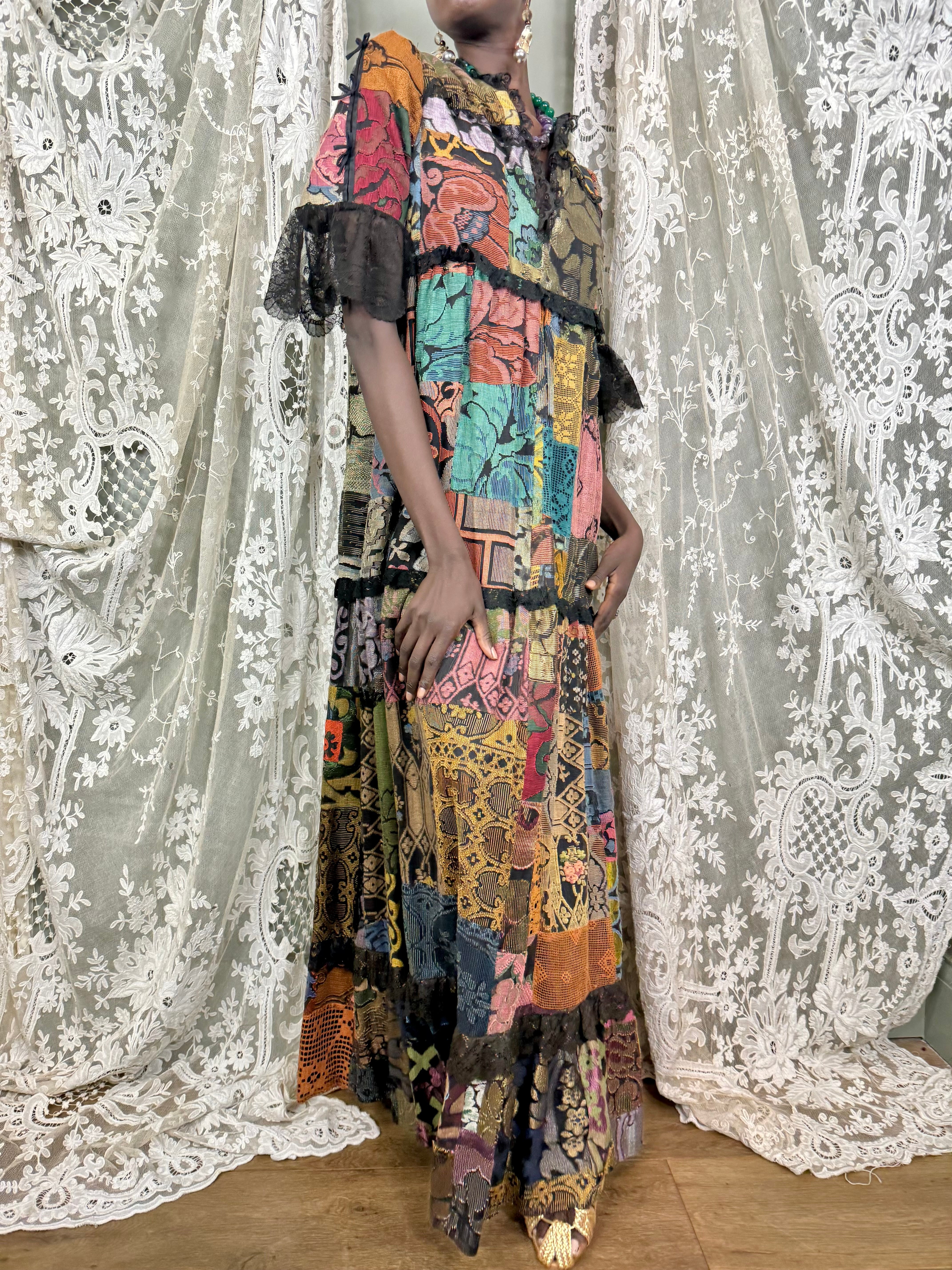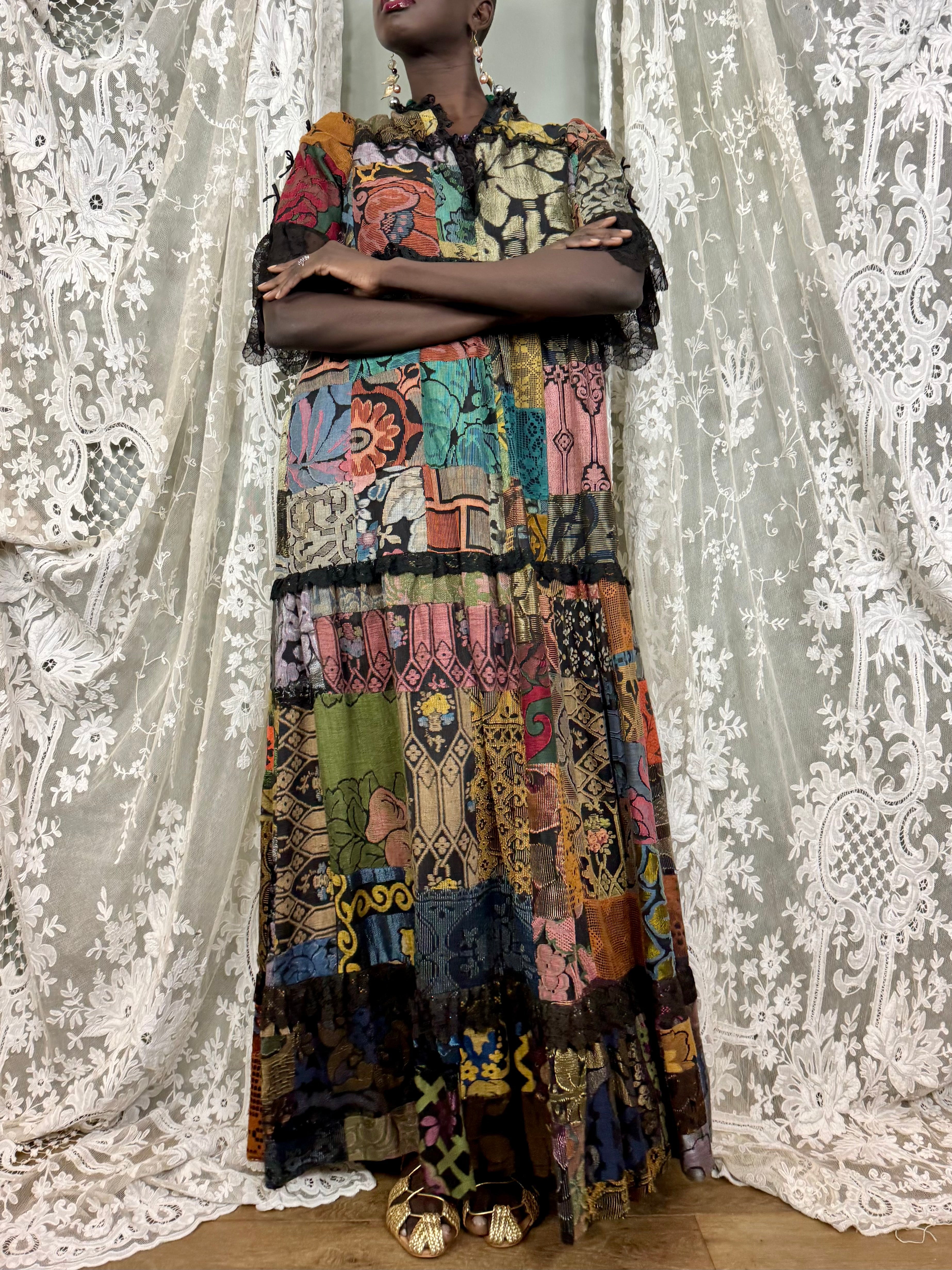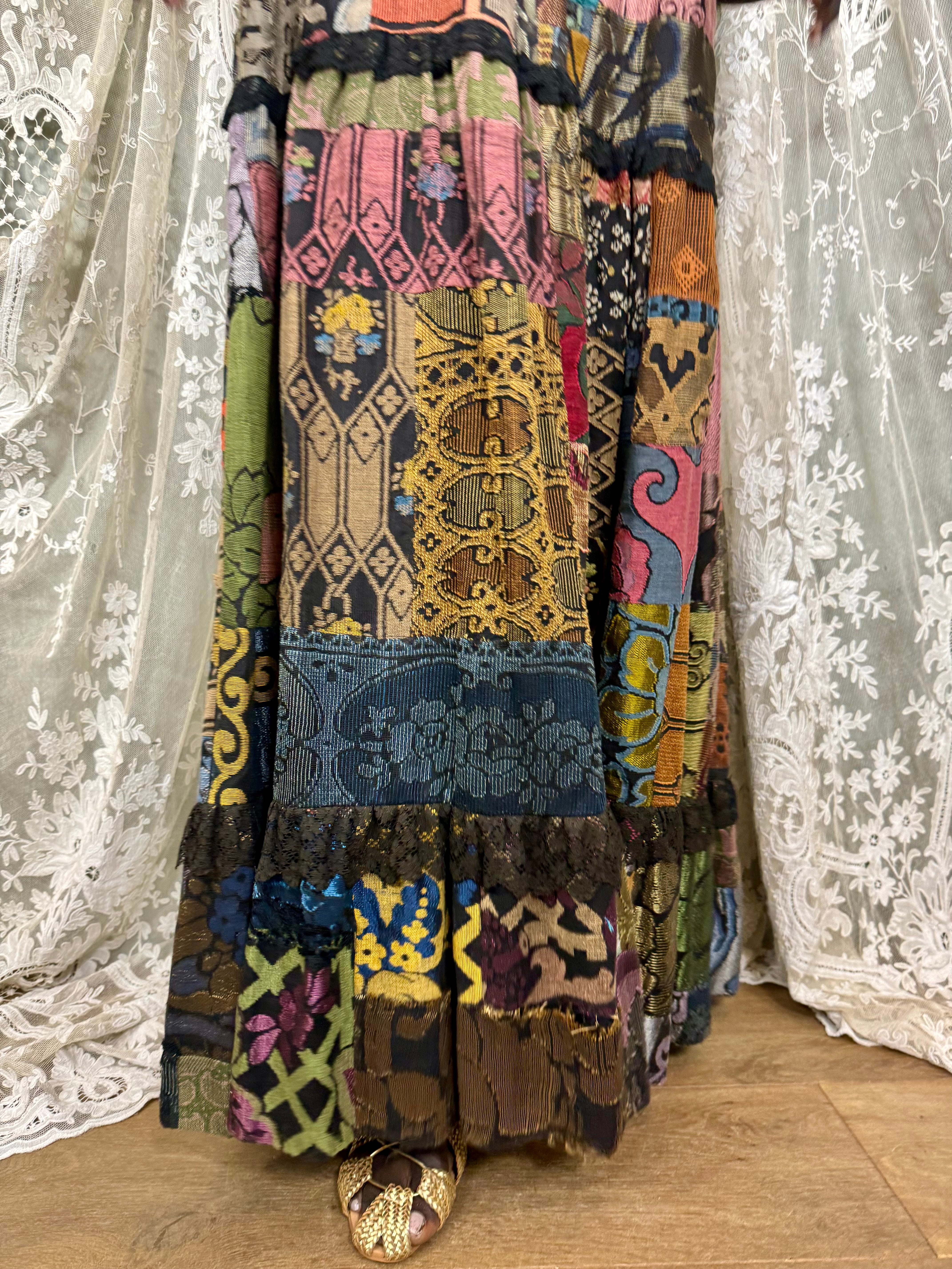 This rare and collectable dress, designed by iconic 70s designer Catherine Buckley, is a must-have for any fashion enthusiast. Its patchwork of gorgeous fabrics creates a unique and eye-catching look. The dress also features short lace-up sleeves with lace frill, a front V-neckline, and 3 tiers of A-line fabric for a flattering silhouette. Fully lined and in excellent condition.