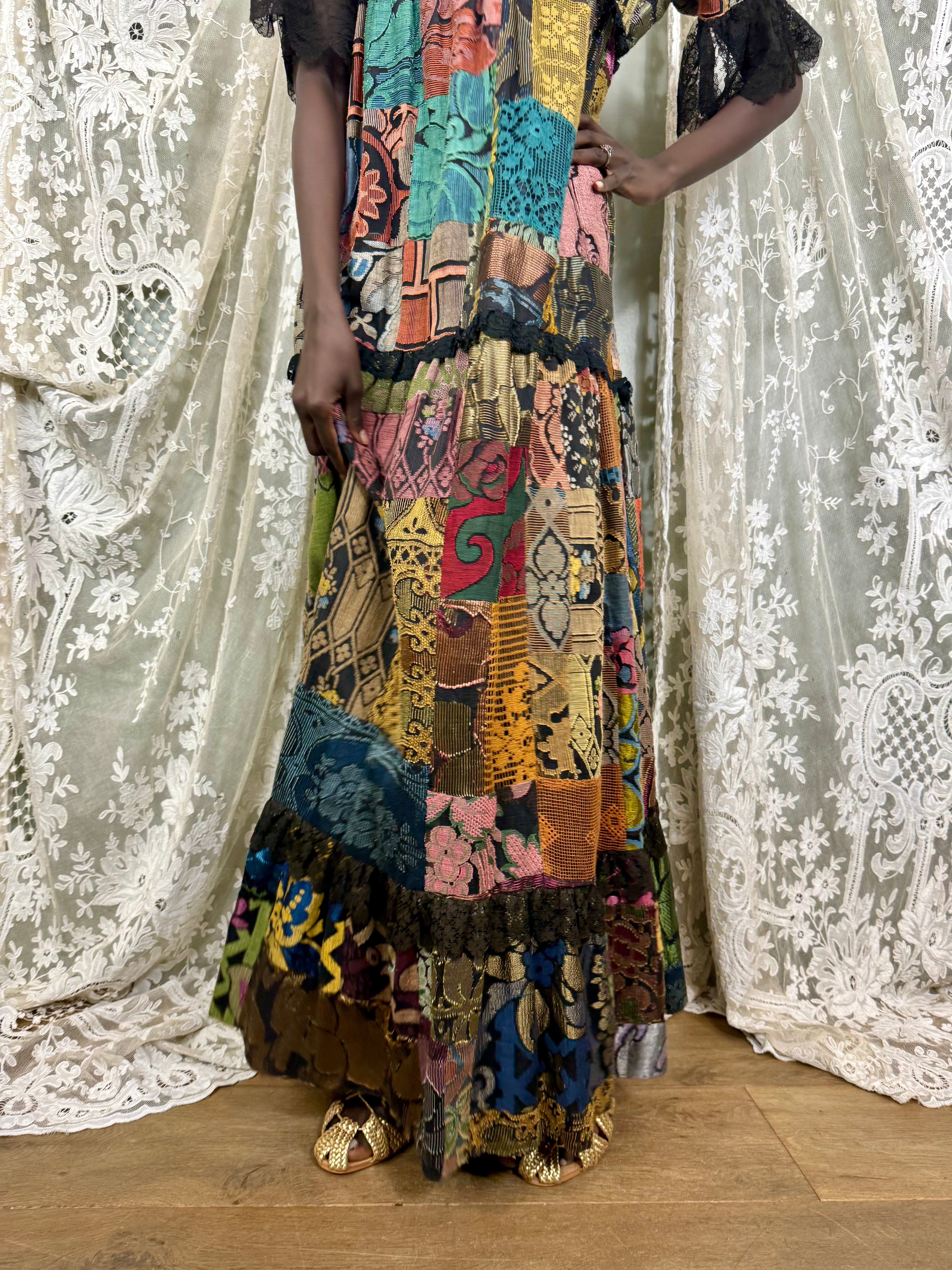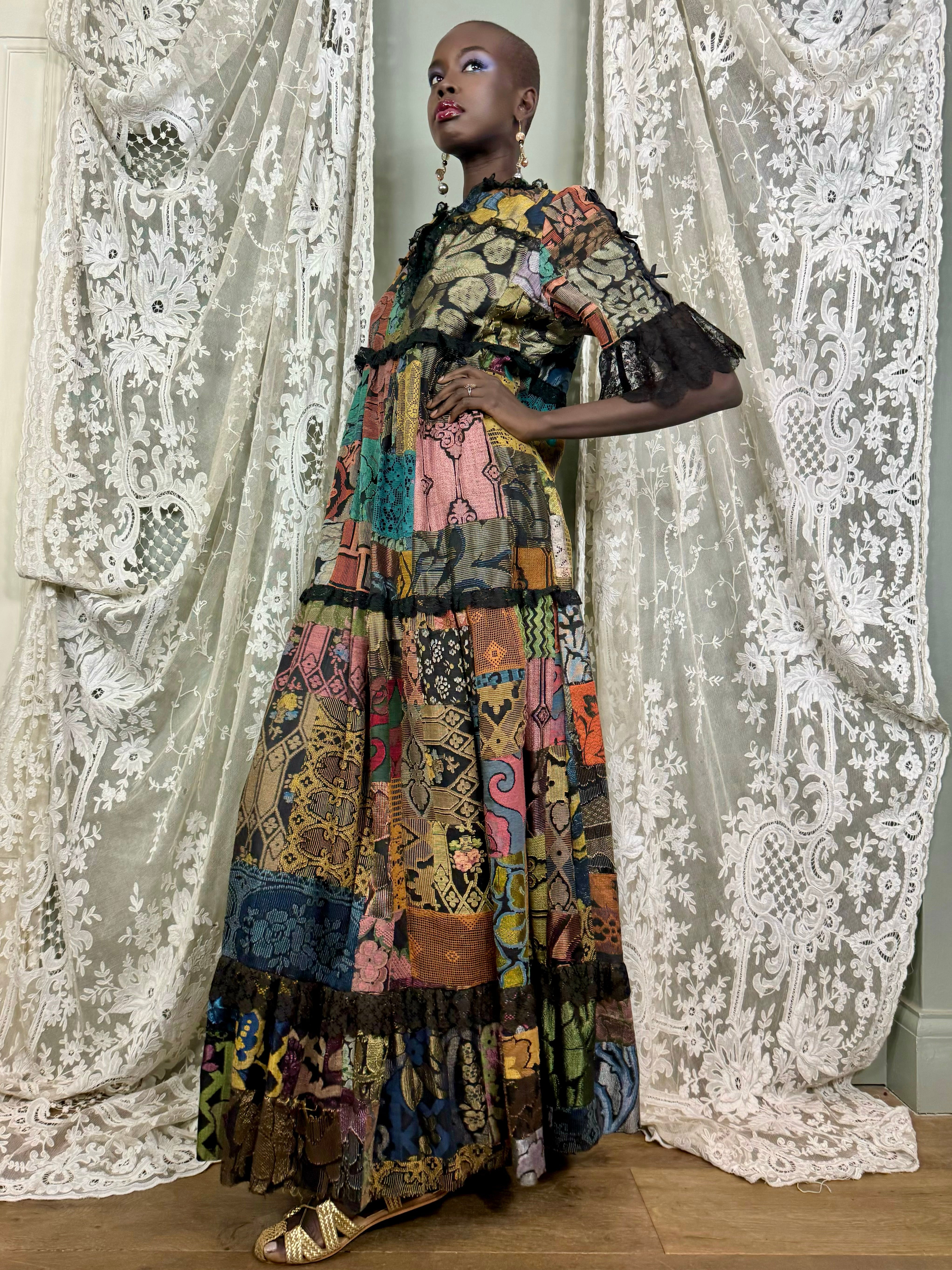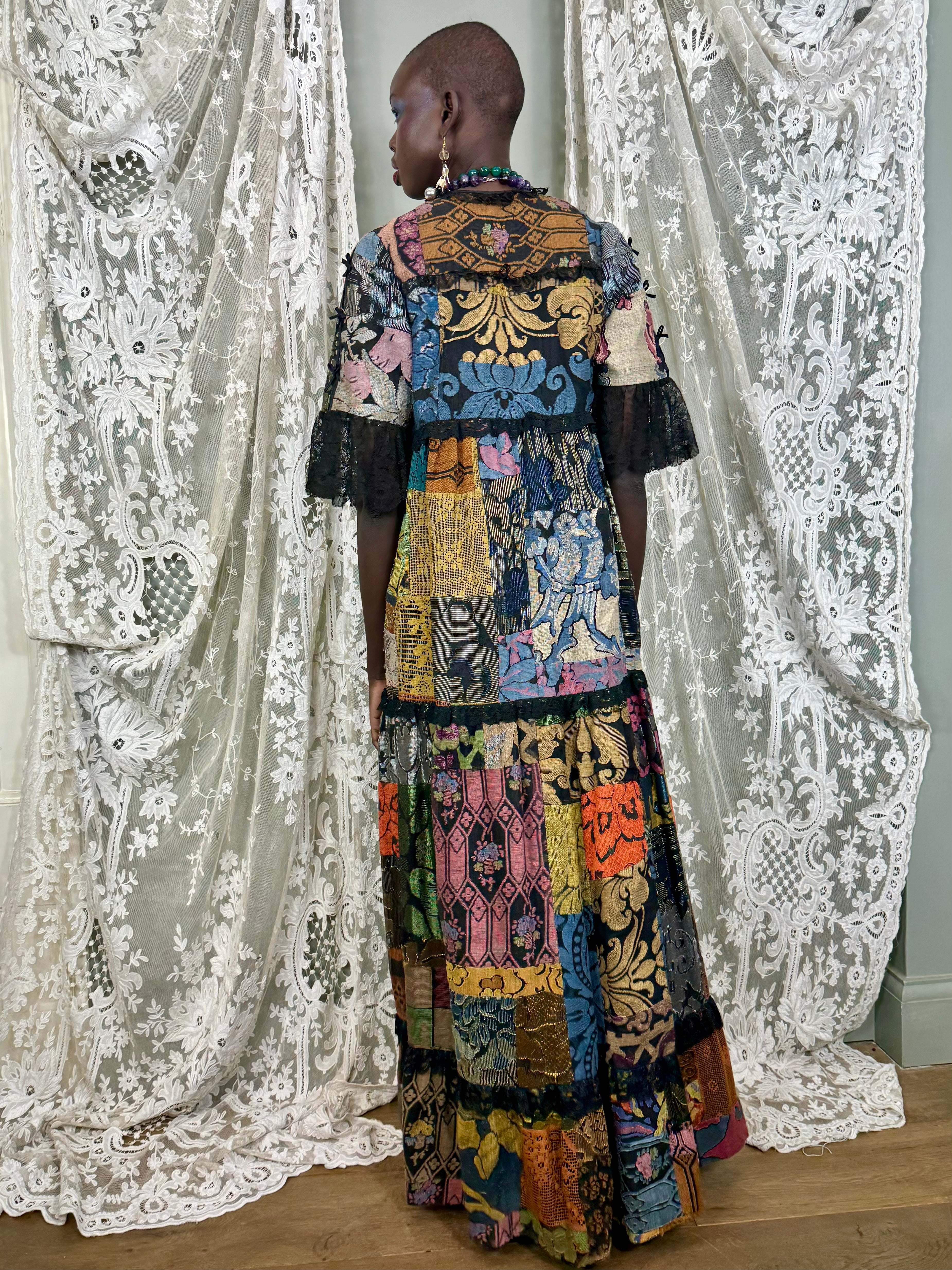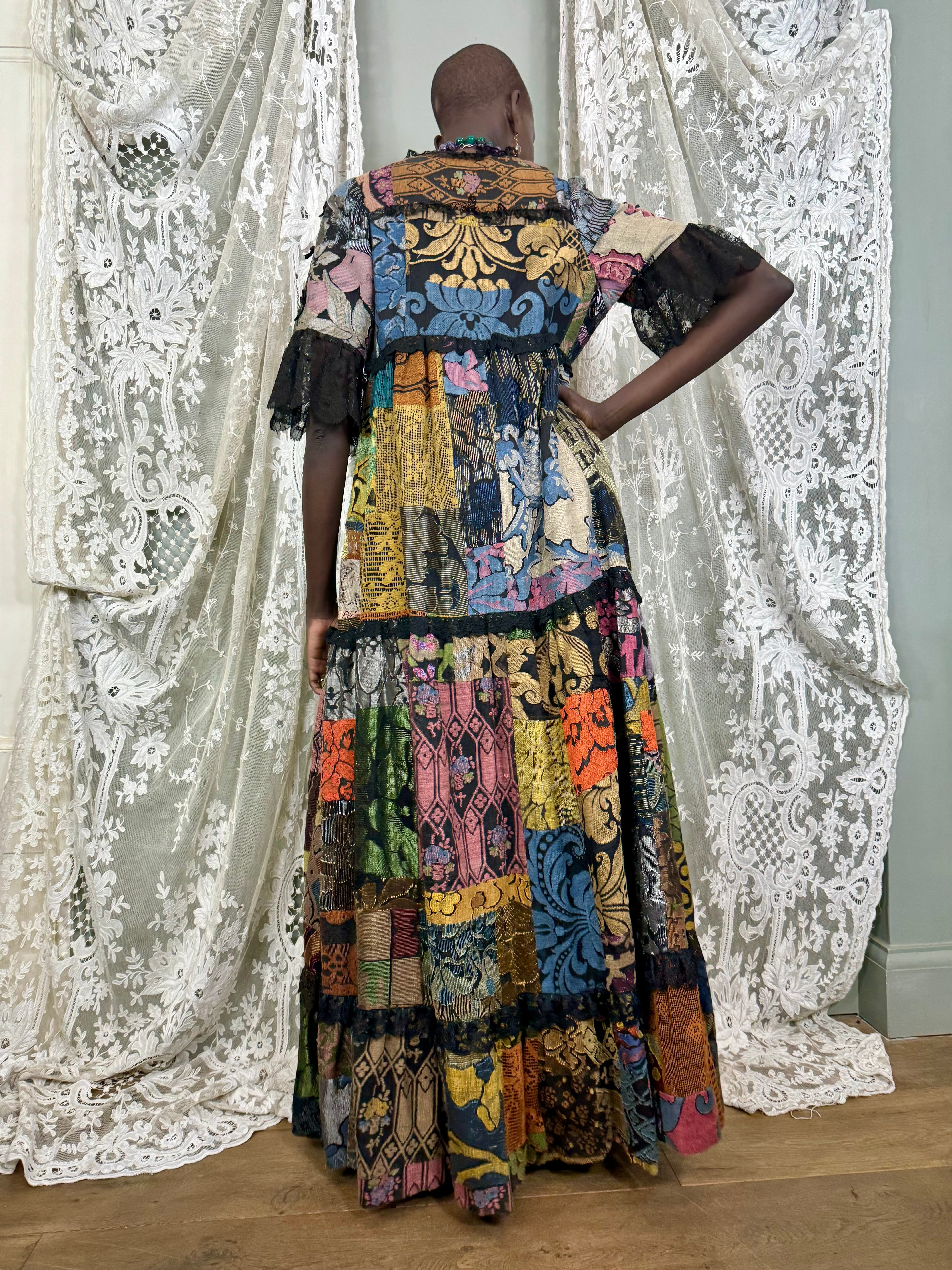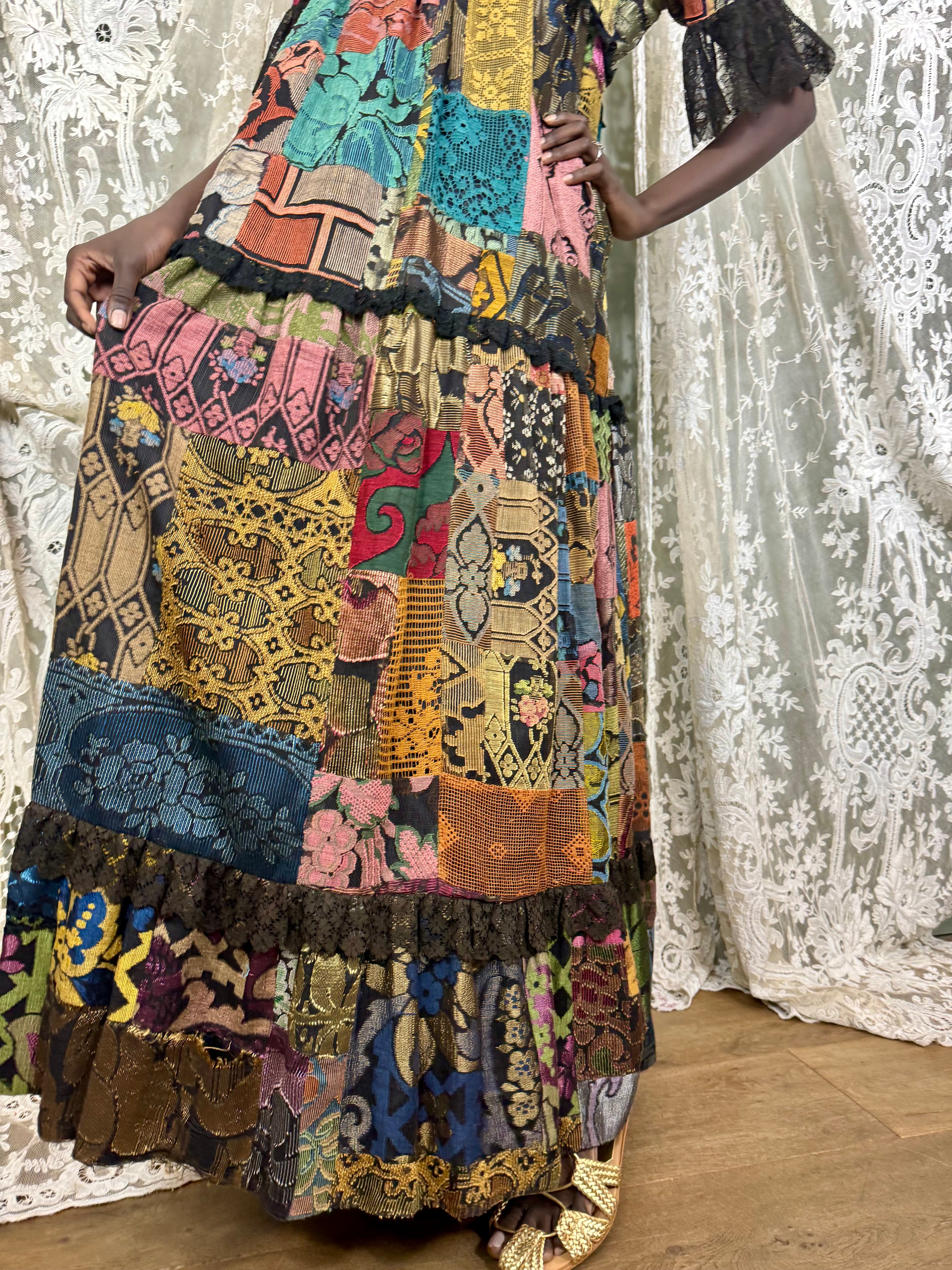 This rare and collectable dress, designed by iconic 70s designer Catherine Buckley, is a must-have for any fashion enthusiast. Its patchwork of gorgeous fabrics creates a unique and eye-catching look. The dress also features short lace-up sleeves with lace frill, a front V-neckline, and 3 tiers of A-line fabric for a flattering silhouette. Fully lined and in excellent condition.