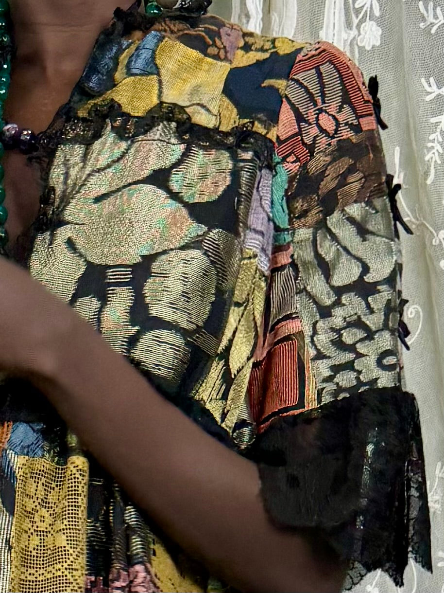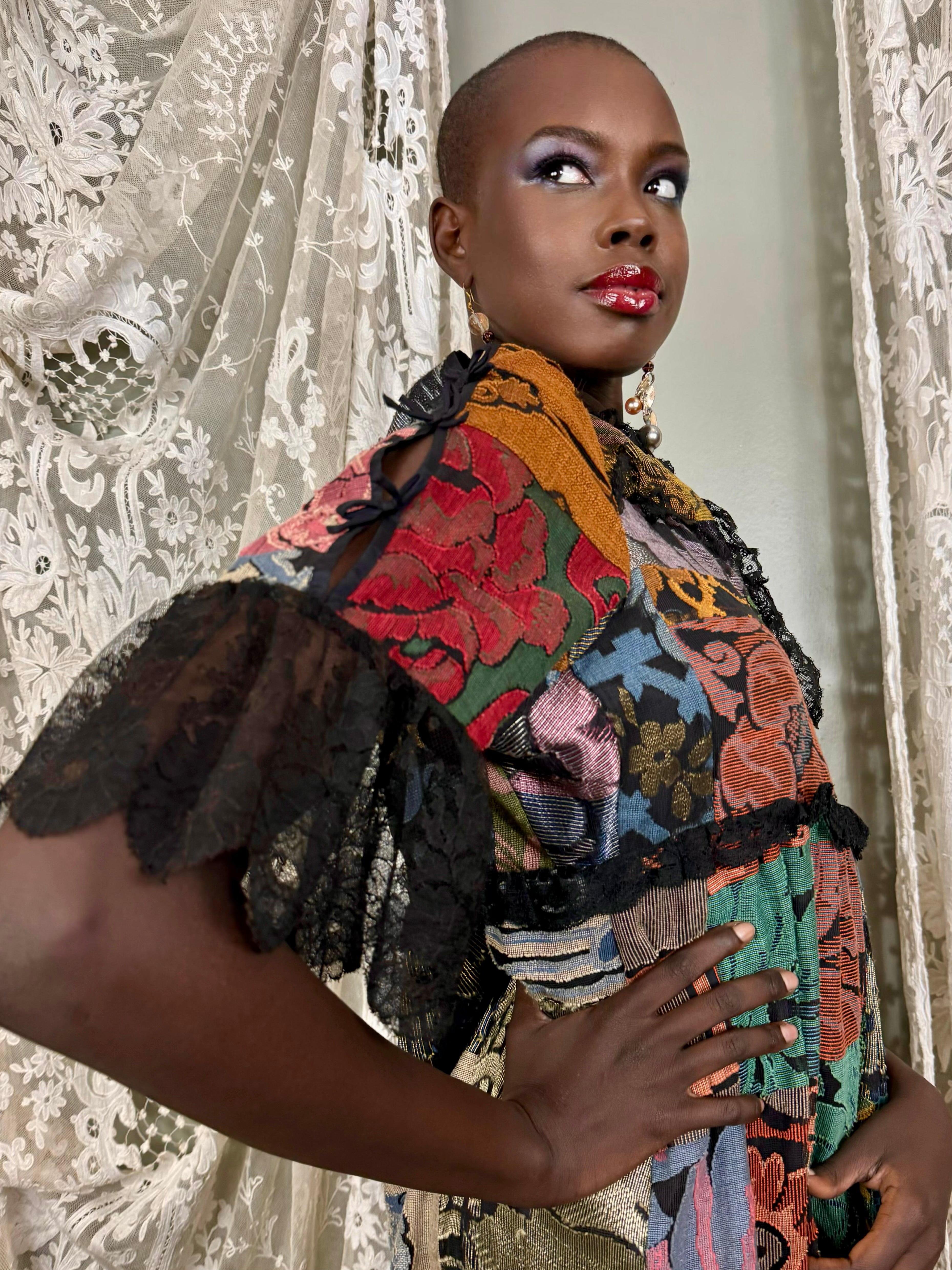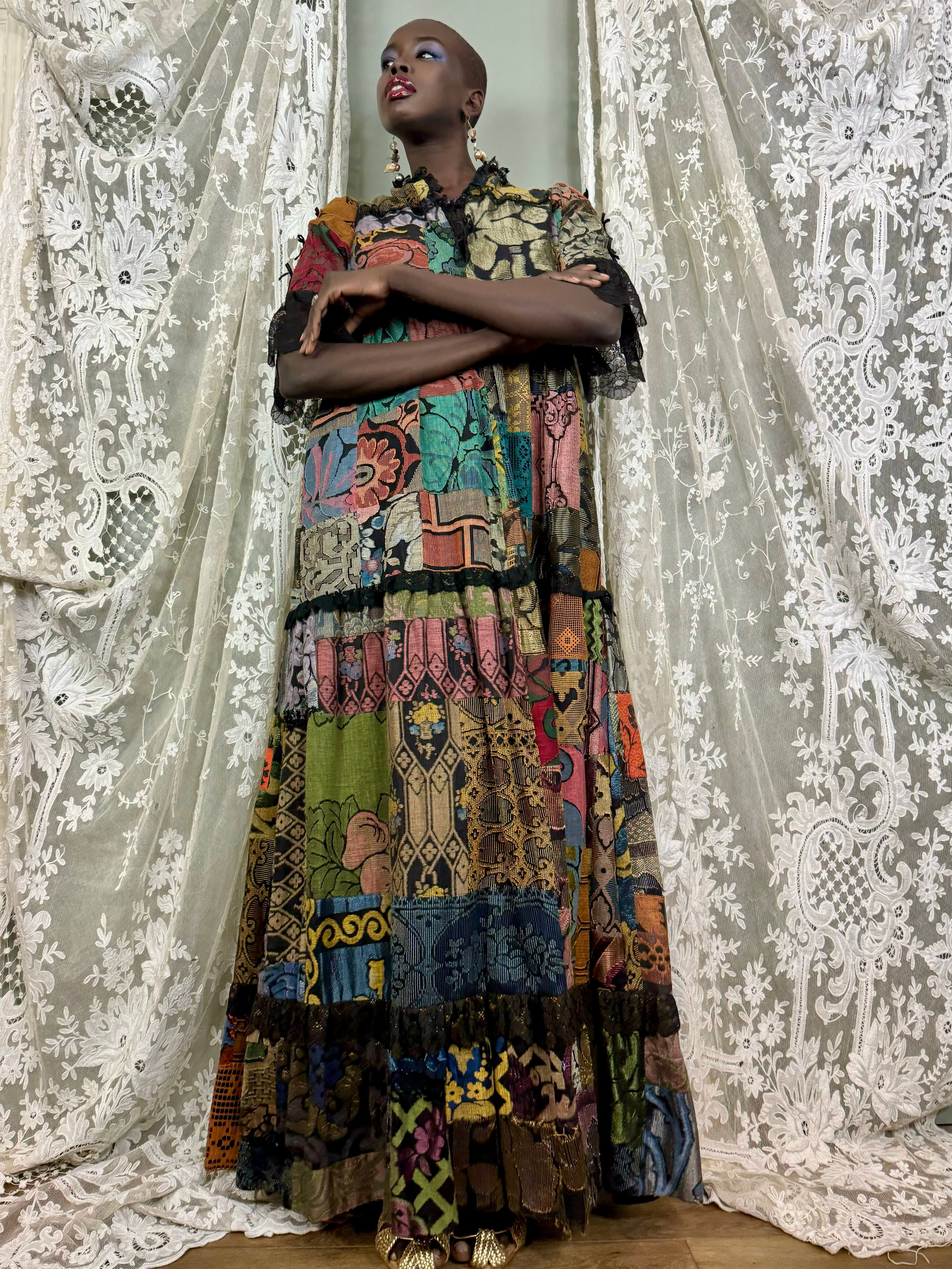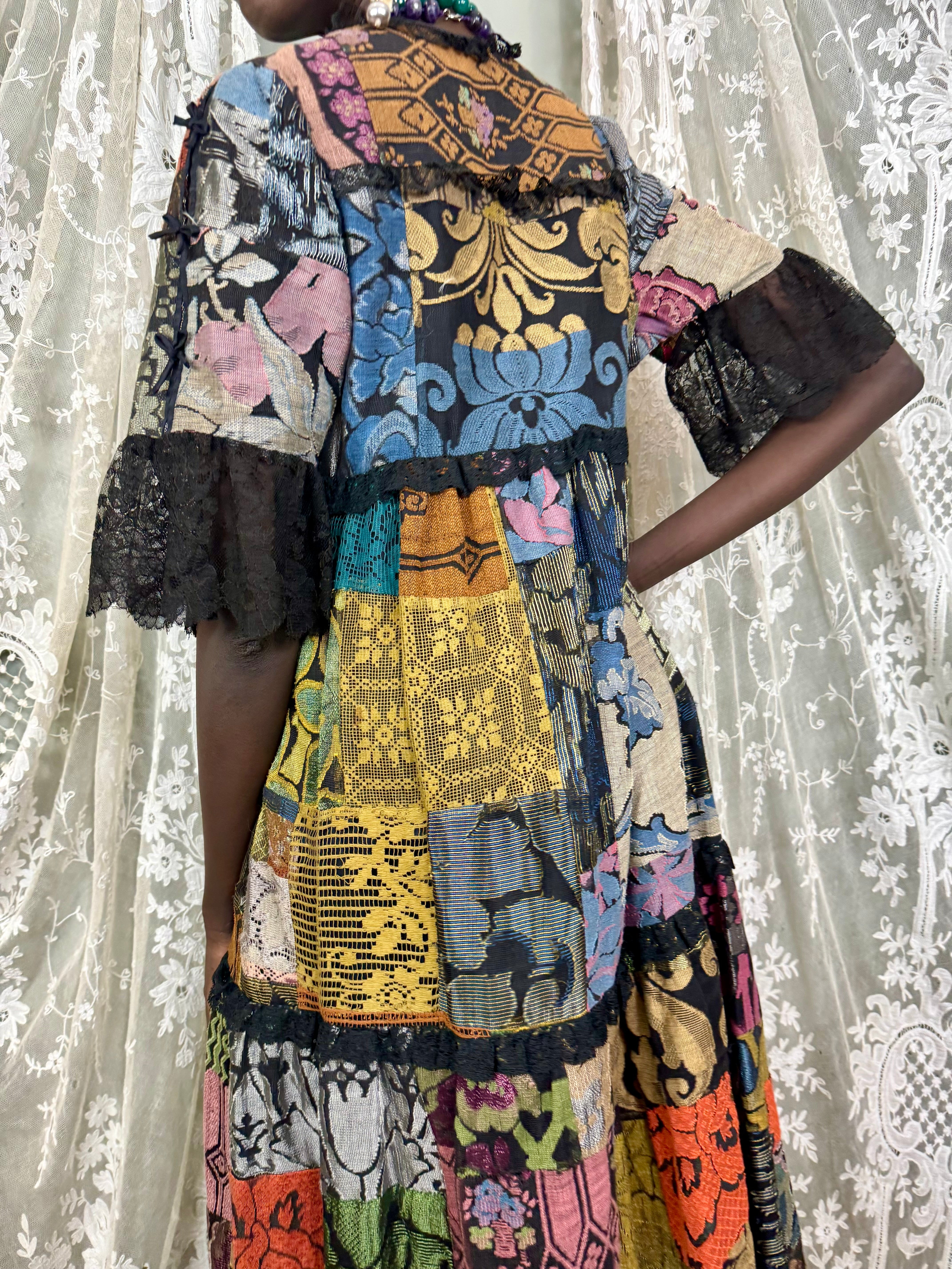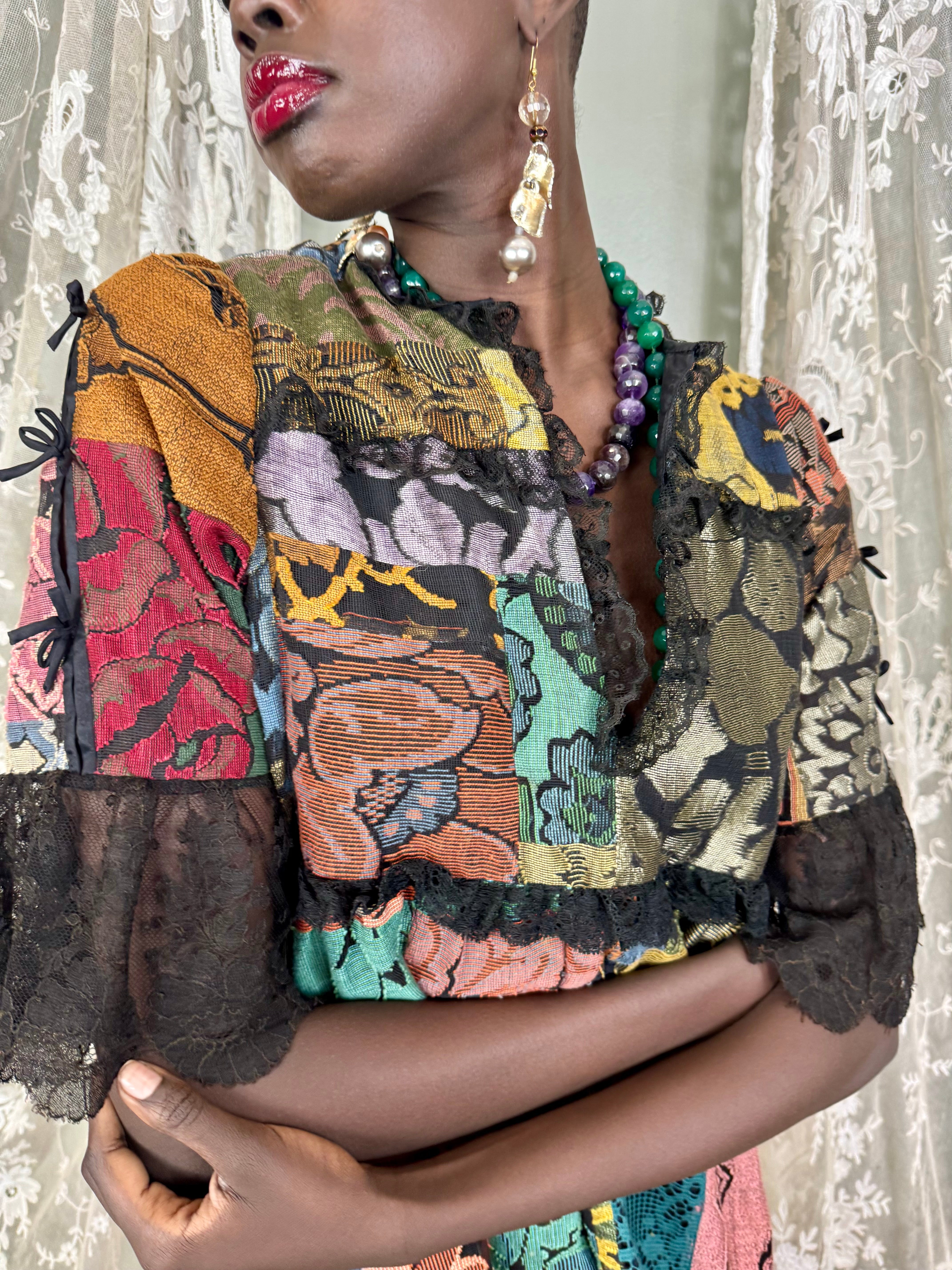 This rare and collectable dress, designed by iconic 70s designer Catherine Buckley, is a must-have for any fashion enthusiast. Its patchwork of gorgeous fabrics creates a unique and eye-catching look. The dress also features short lace-up sleeves with lace frill, a front V-neckline, and 3 tiers of A-line fabric for a flattering silhouette. Fully lined and in excellent condition.