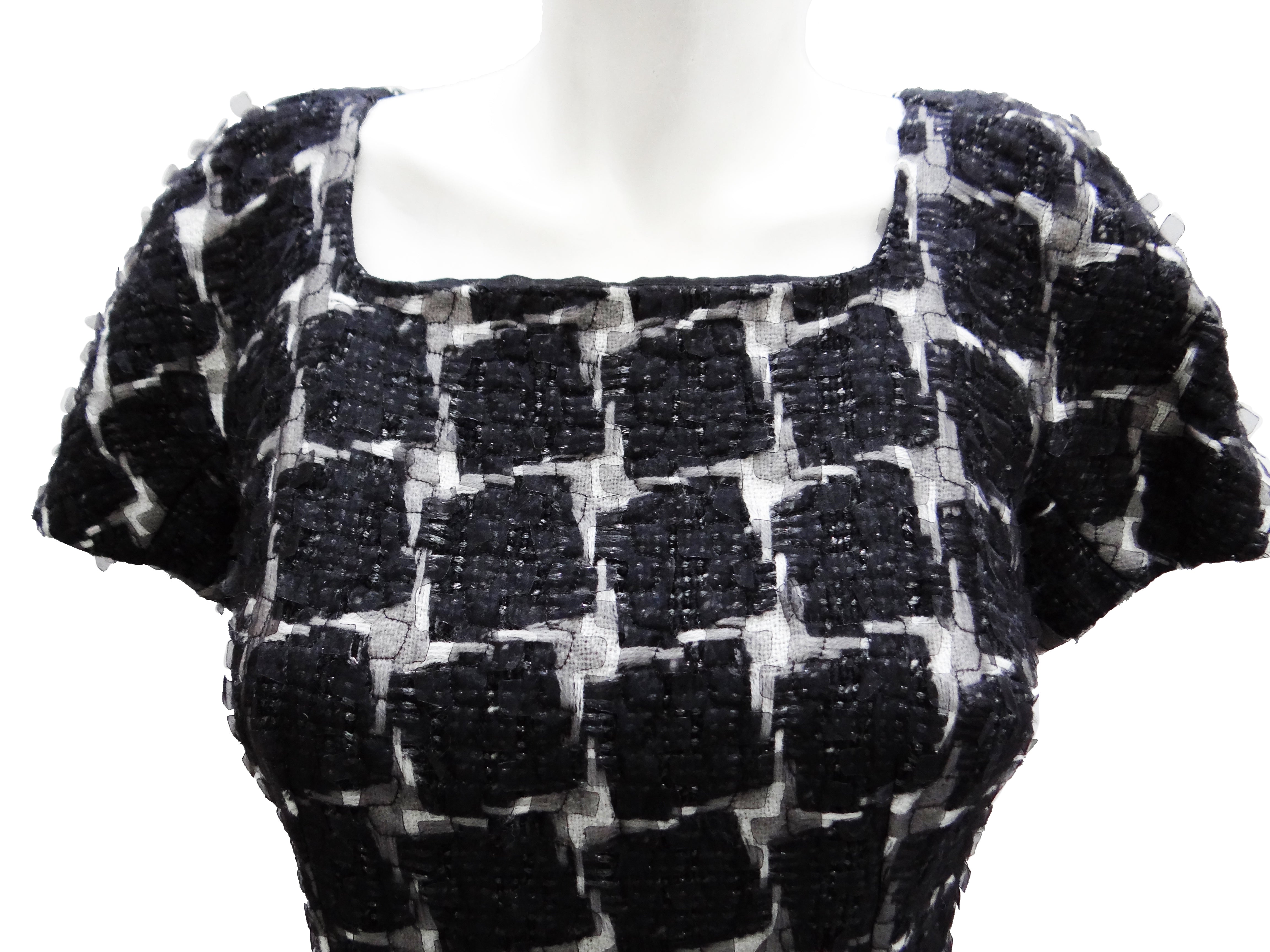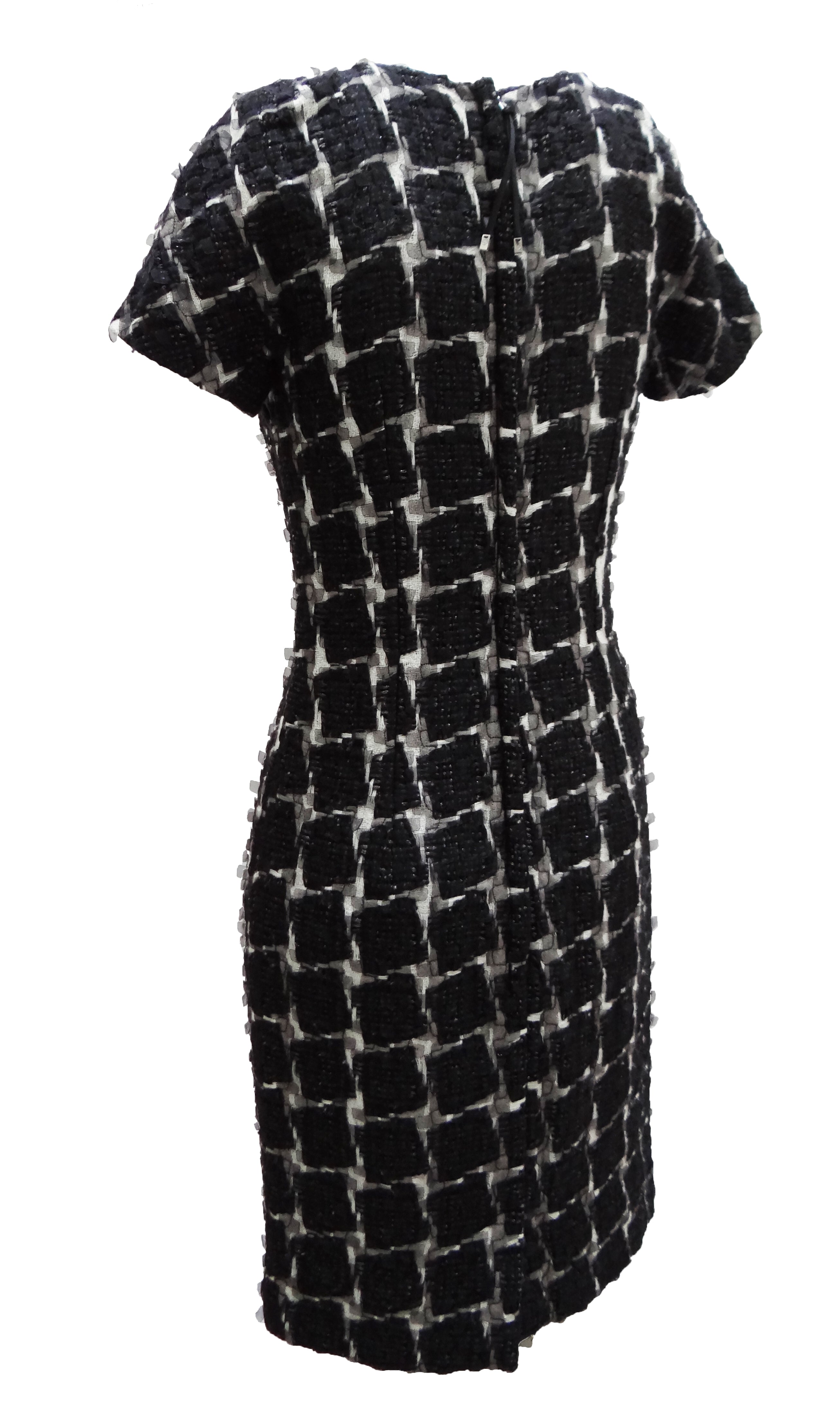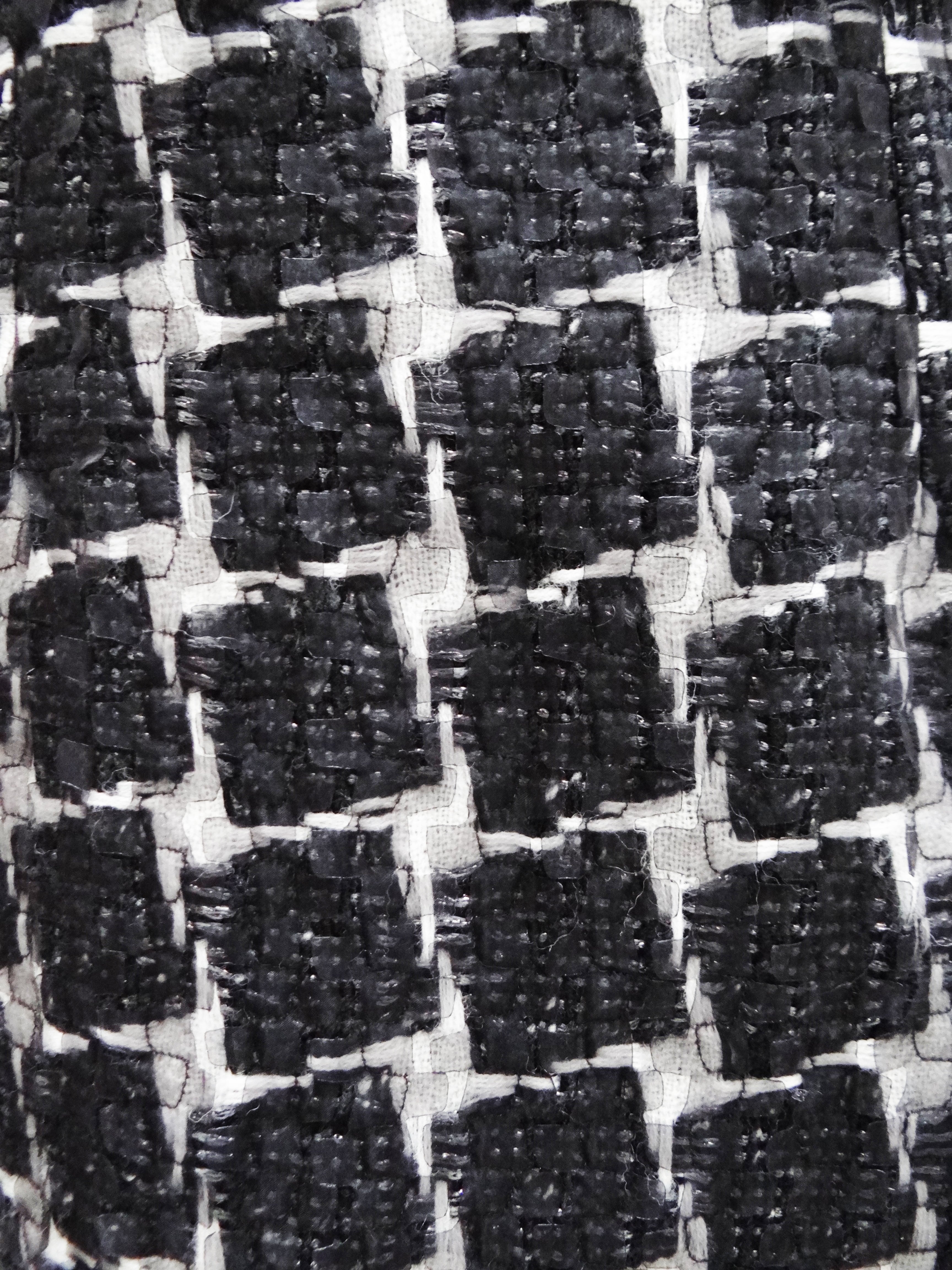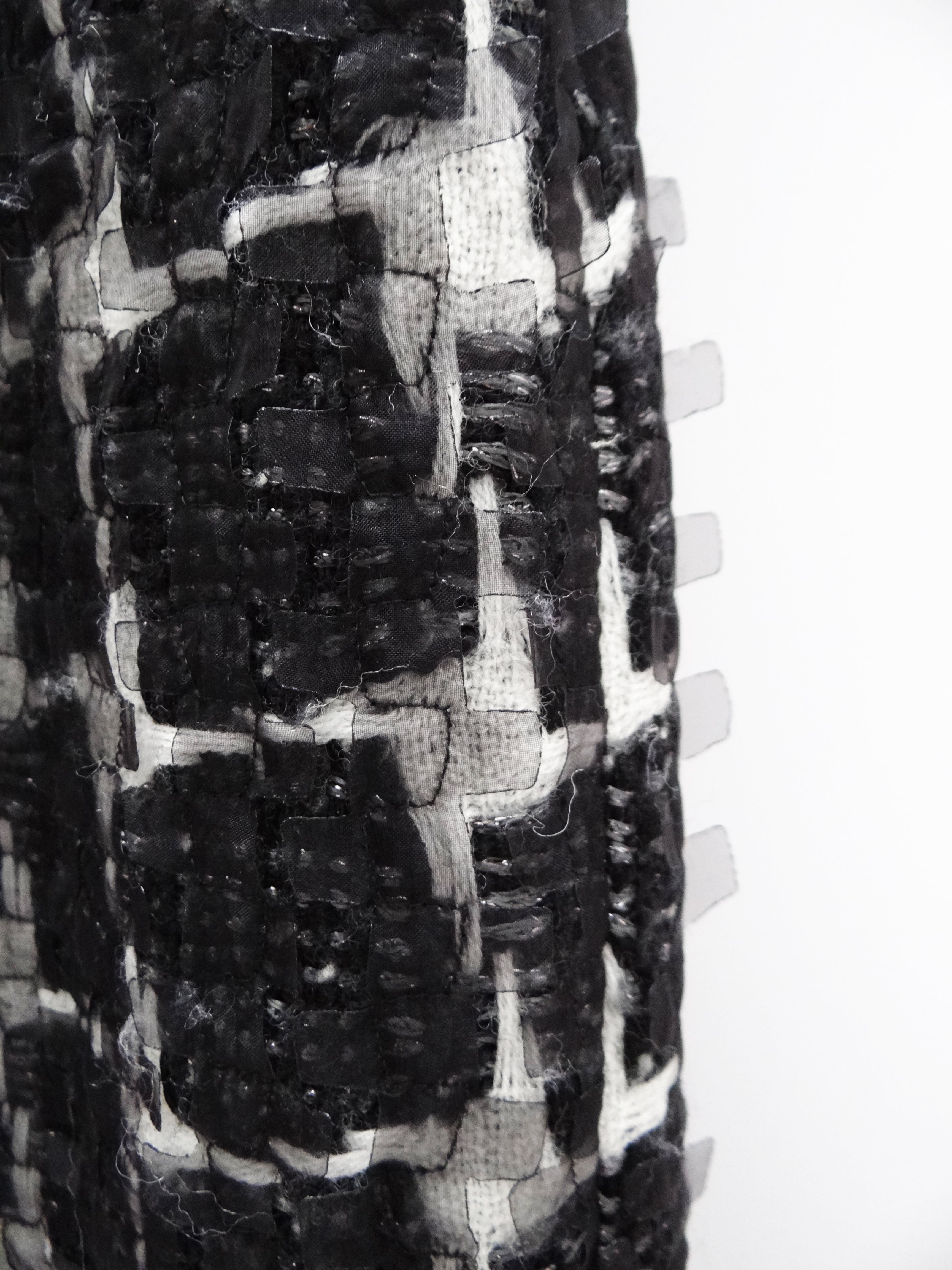 It is made of a gorgeous textured fabric, coarse woven white with black squares, with silver thread; overlaid with narrow geometric cutout strips of stiff black tulle which stick out from the surface of the garment.