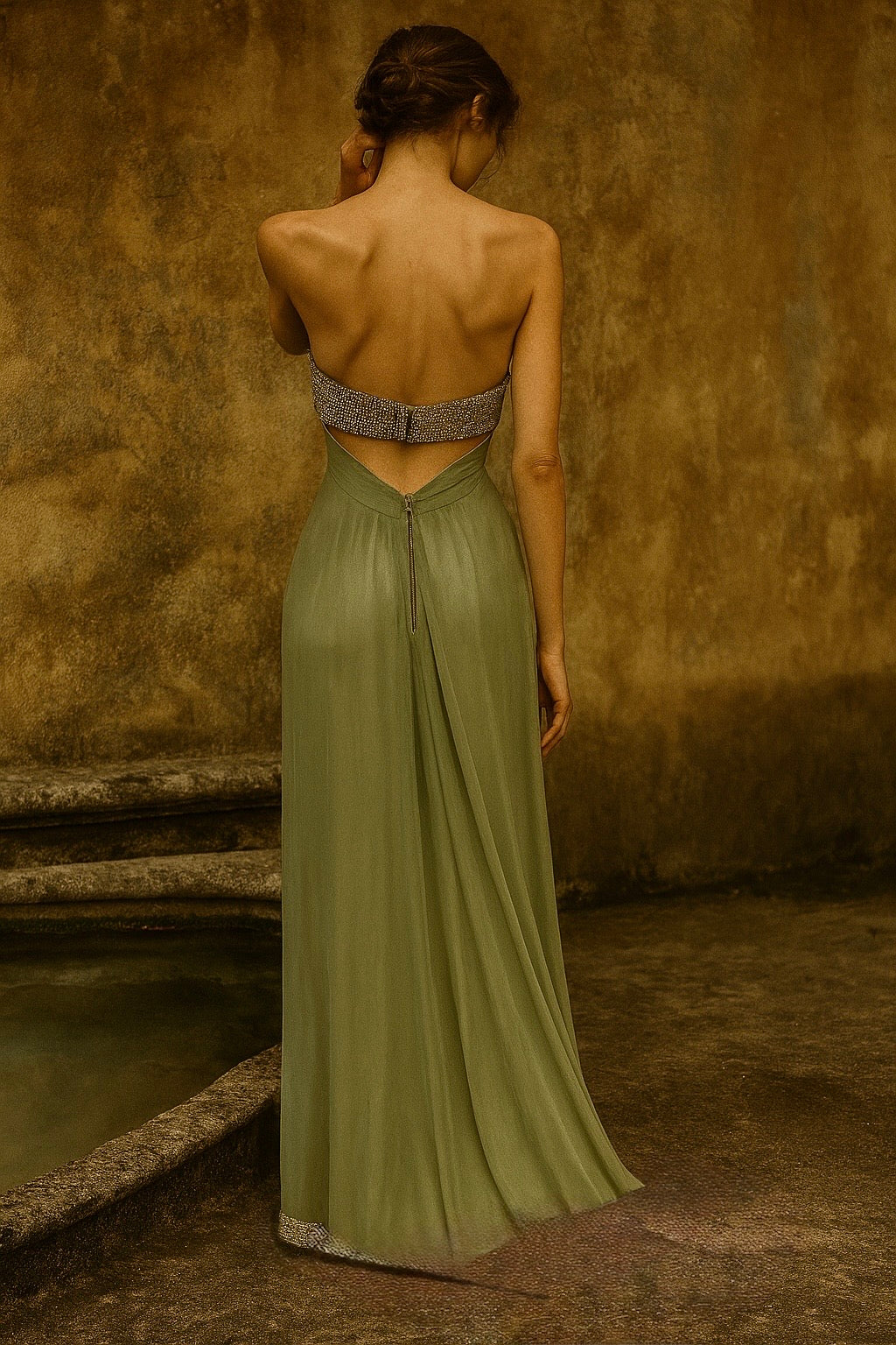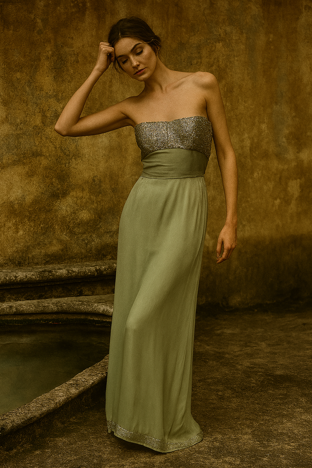 Introducing a an expertly Made fabulous and elegant set from the 1970s. This stunning dress features a Strapless beaded design and a hand-dyed chiffon long straight dress with a matching beaded hem. Comes with a fabulous sweeping matching chiffon and beaded robe and a beaded belt for a perfect fit. With hooks and a zip closure, this dress is sure to make a statement.