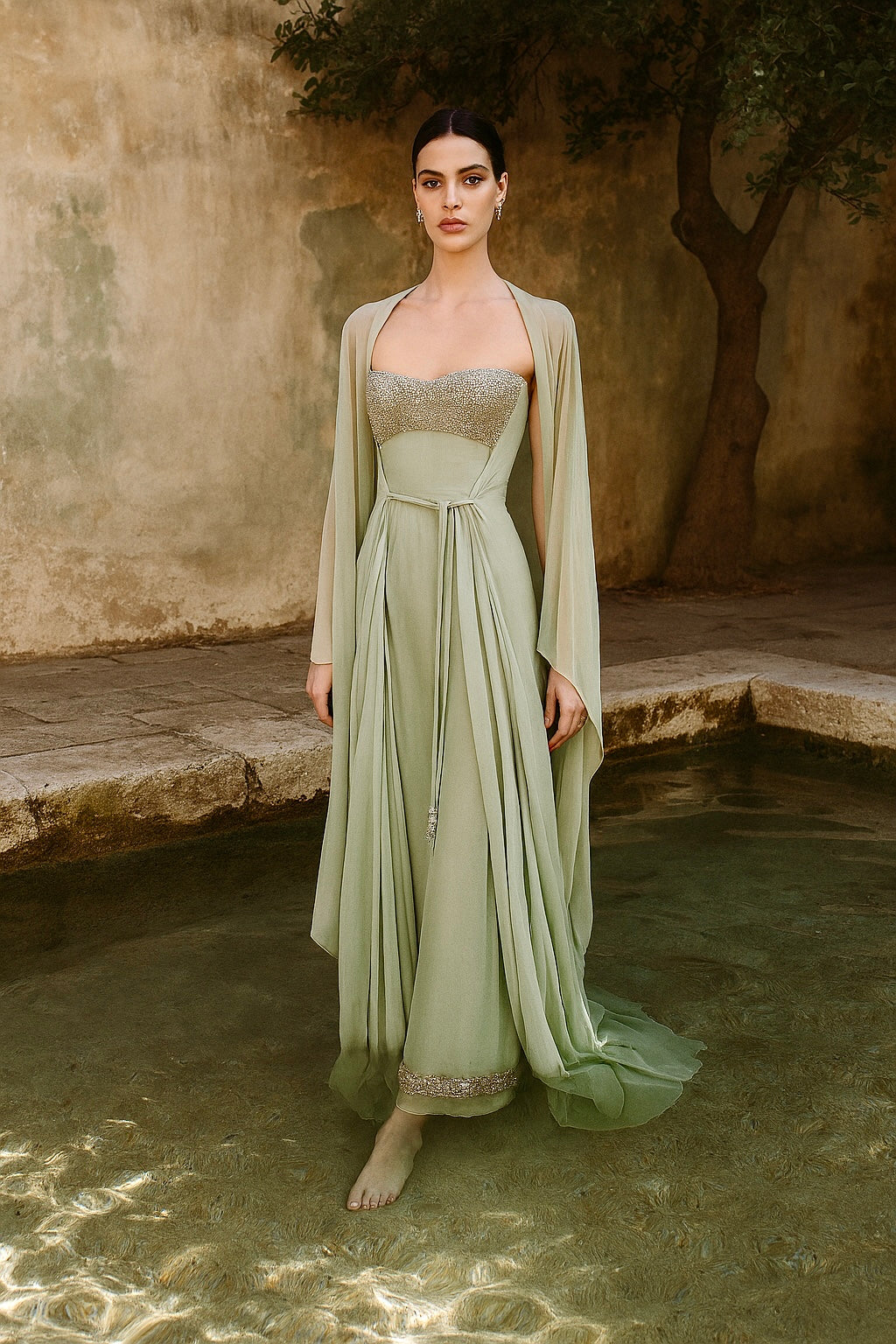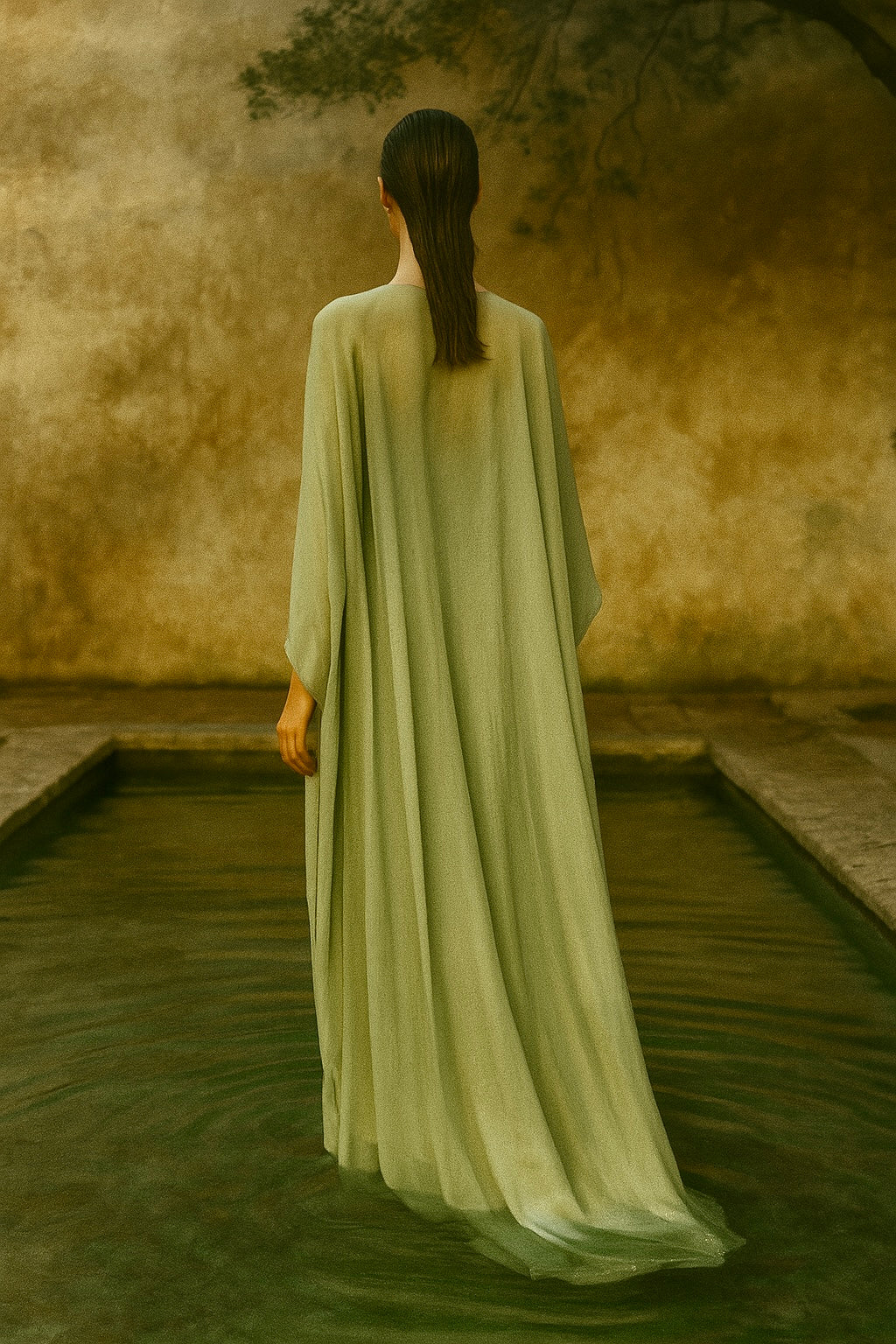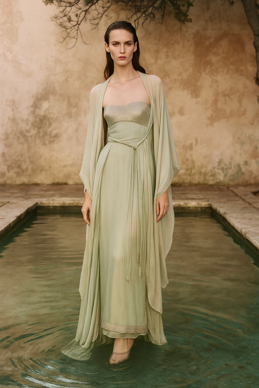 Emma, 1970s, silver beaded hand dyed chiffon dress and matching beaded robe and tie
