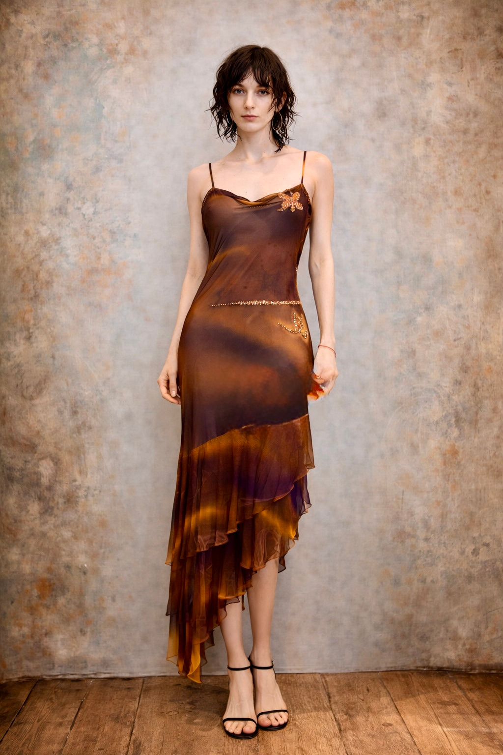 Indulge in timeless elegance with this 90s silk chiffon beaded dress in earthy yet vibrant tones. The thin shoulder straps and asymmetrical cascading frills add sophistication, while the intricate rhinestone beading adds a touch of sparkle. Hand-finished for a perfect fit, with a side zip for convenience. This makes the perfect party dress,