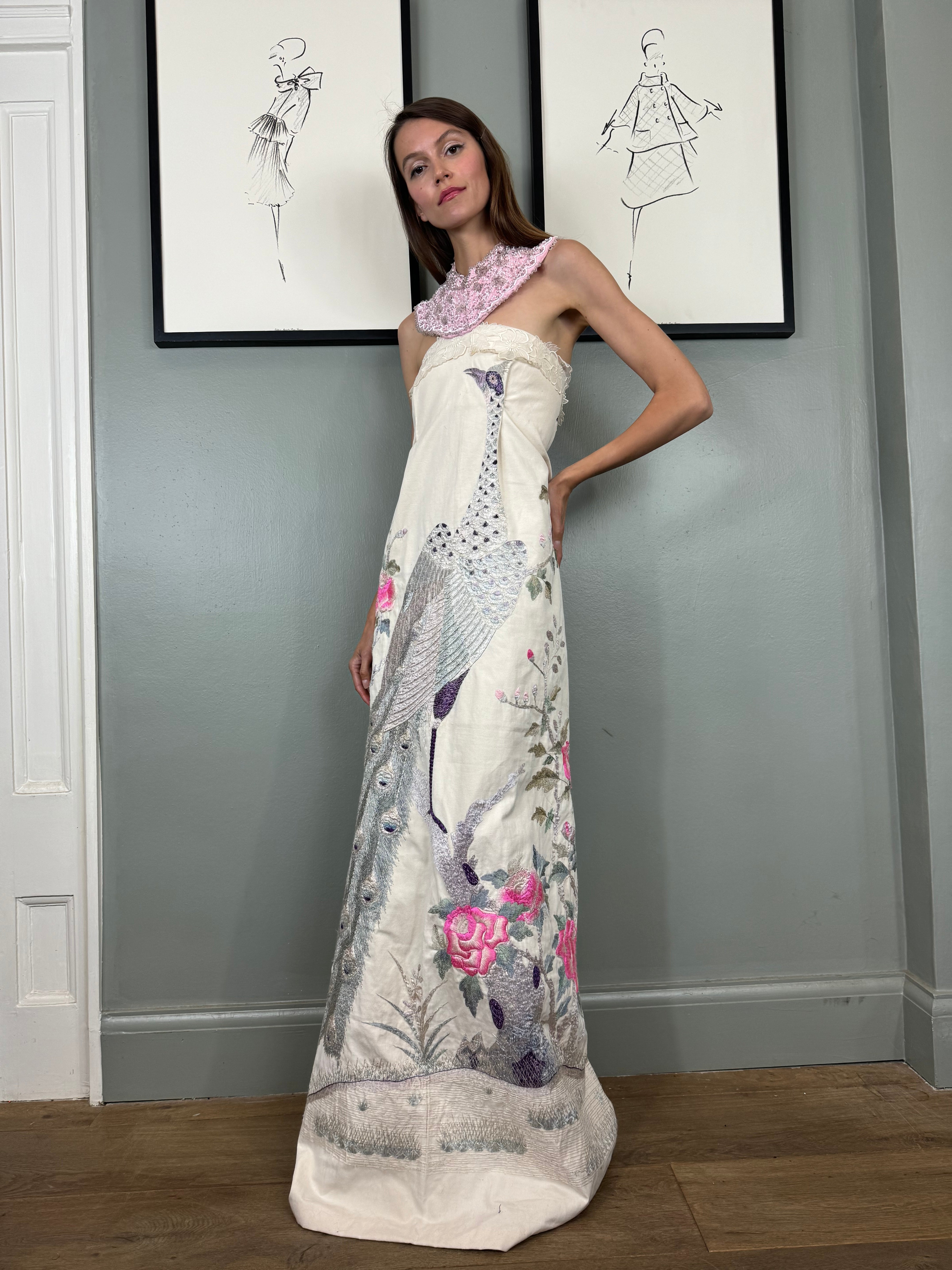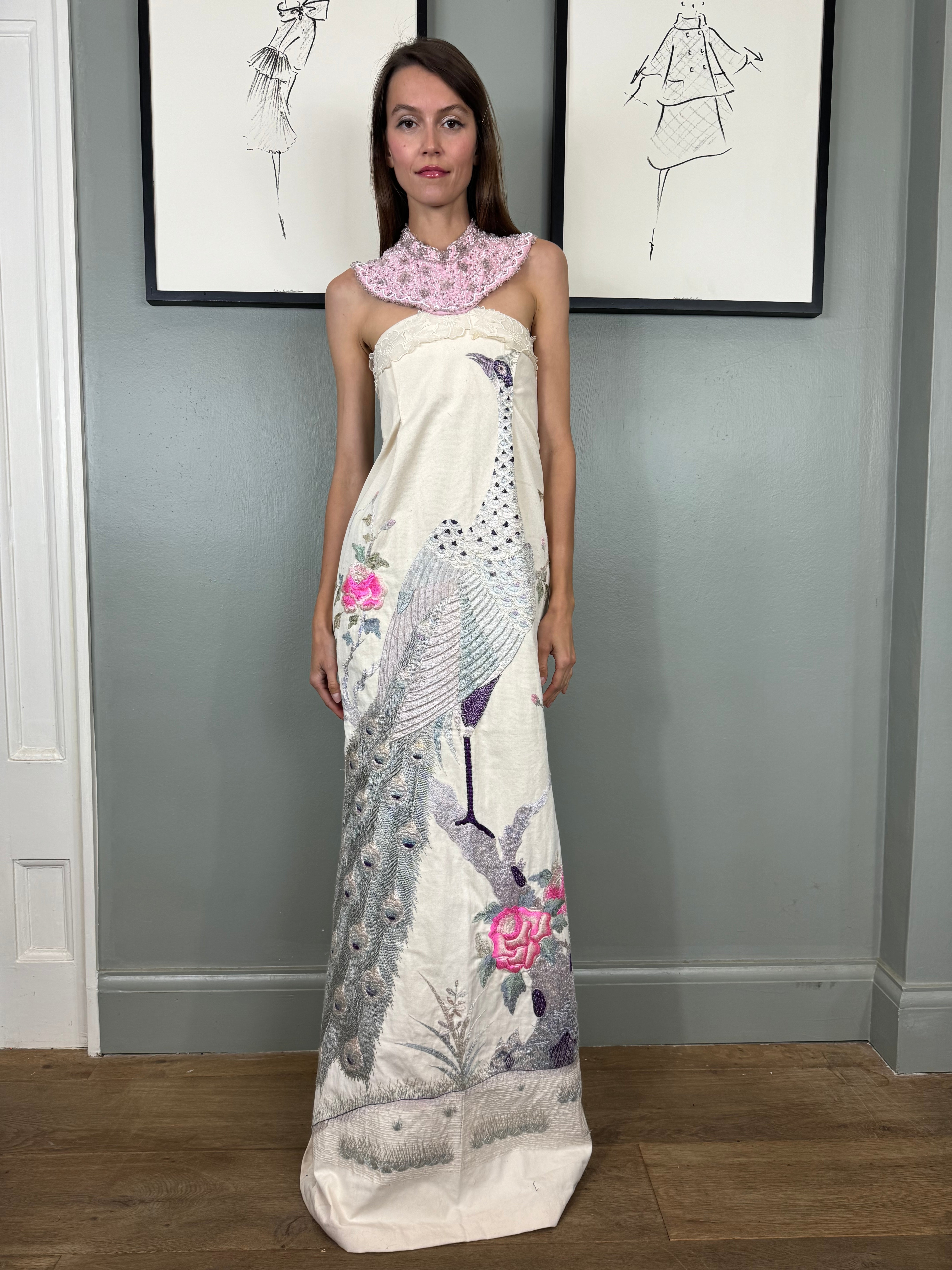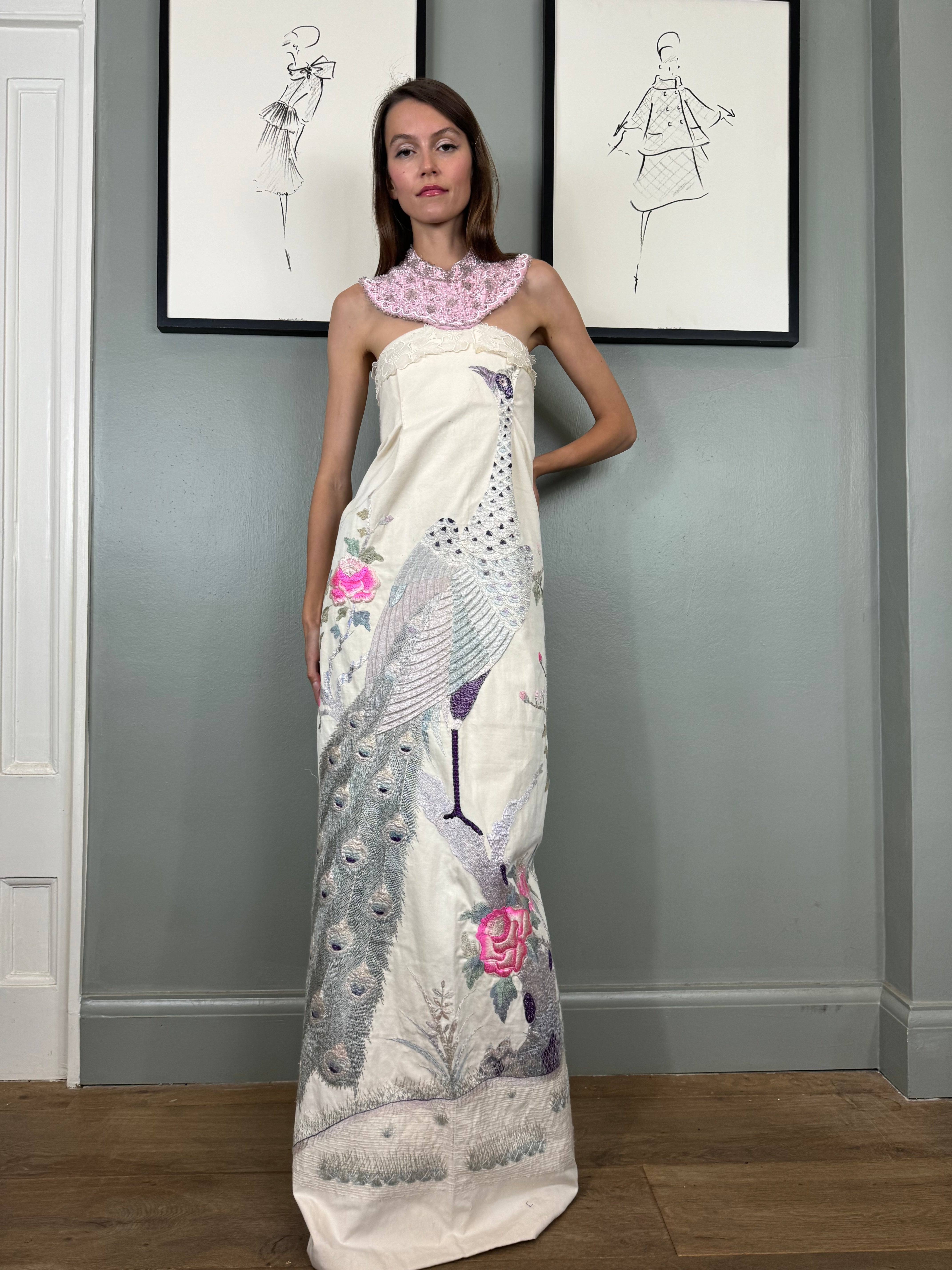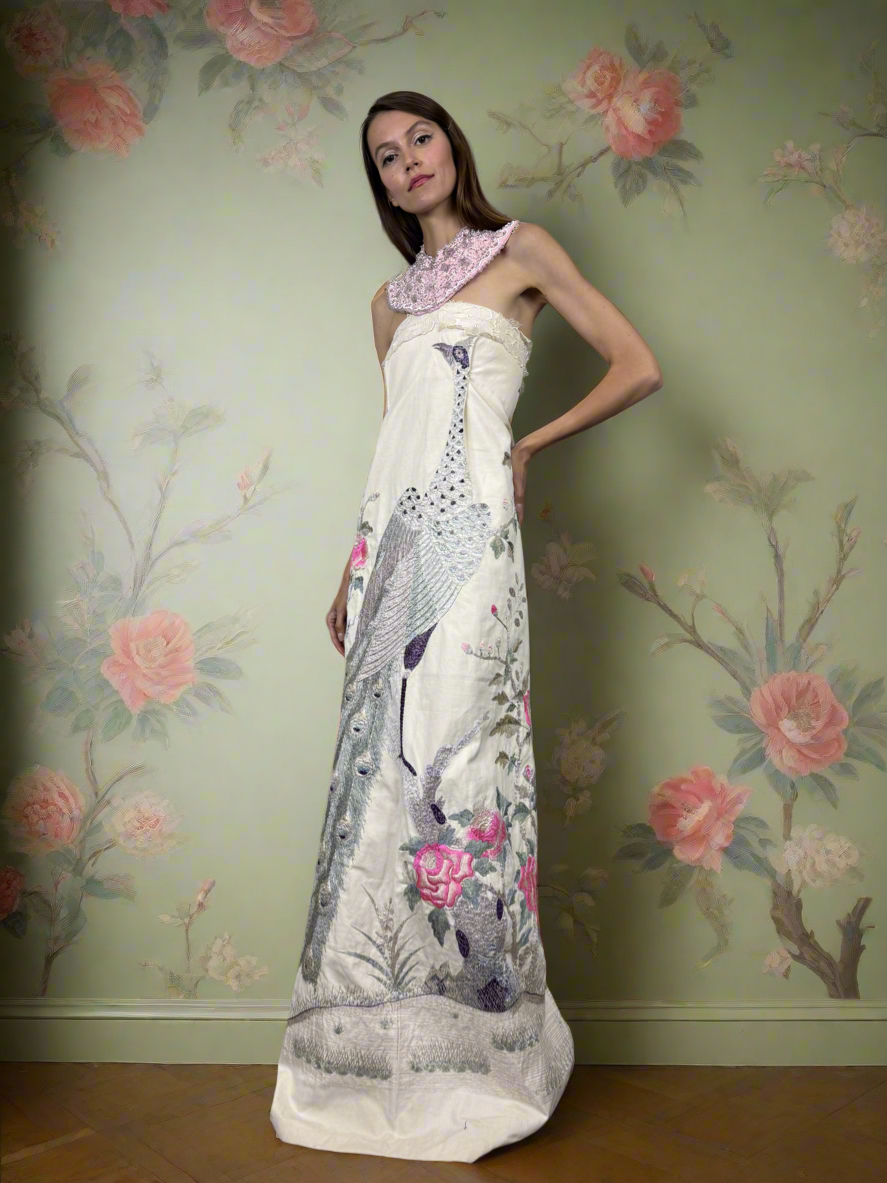 Expertly crafted from a rare 18th century embroidered Oriental fabric, the Follie dress is a true work of art. The mesmerizing column design features a densely beaded pink neckline that fastens on the back with hooks giving the illusion of a necklace, creating a flawless silhouette. A pretty floral organza trim elegantly outlines the pleated bustier. With a convenient back zipper, this dress seamlessly blends elegance and functionality.