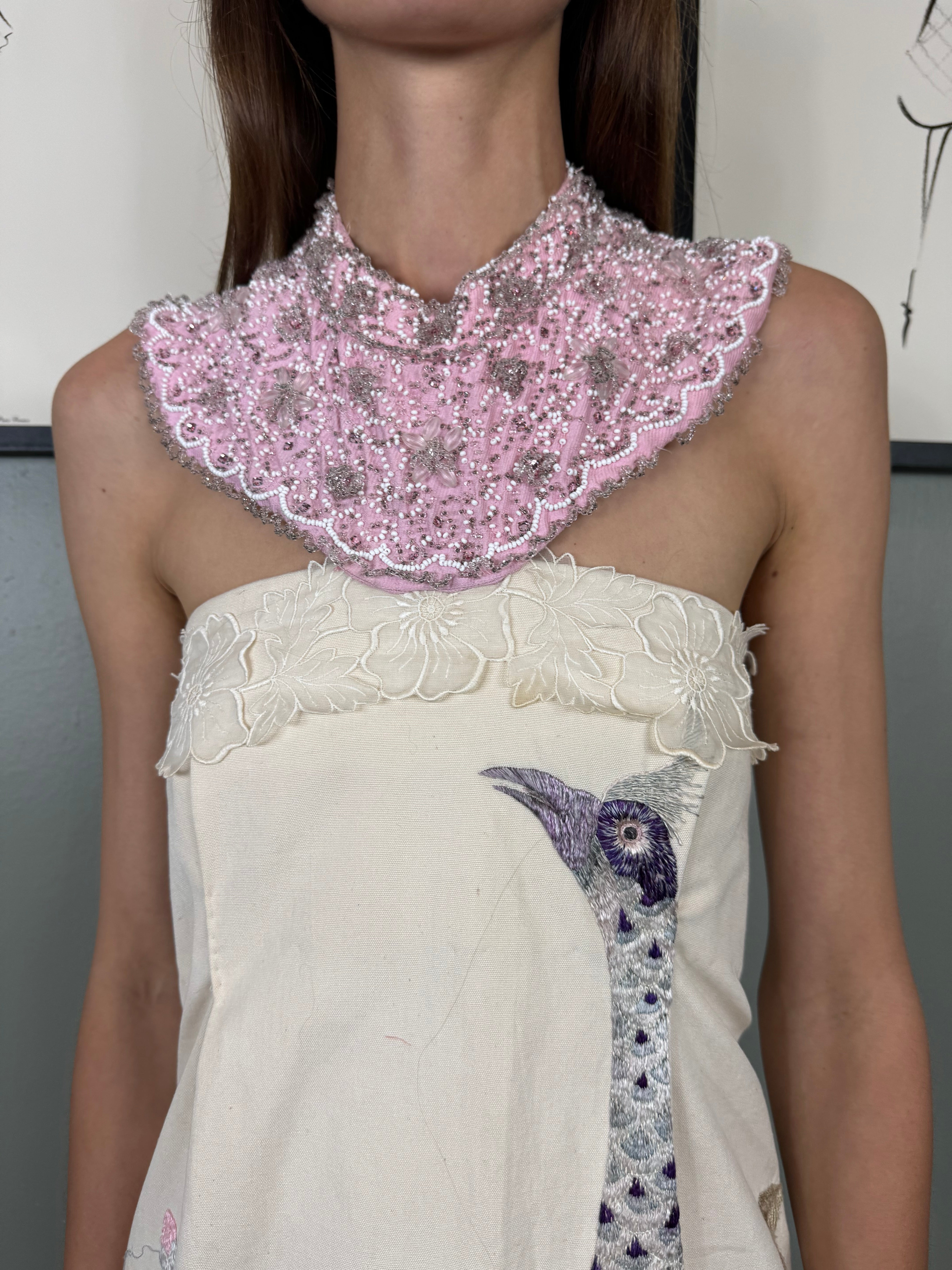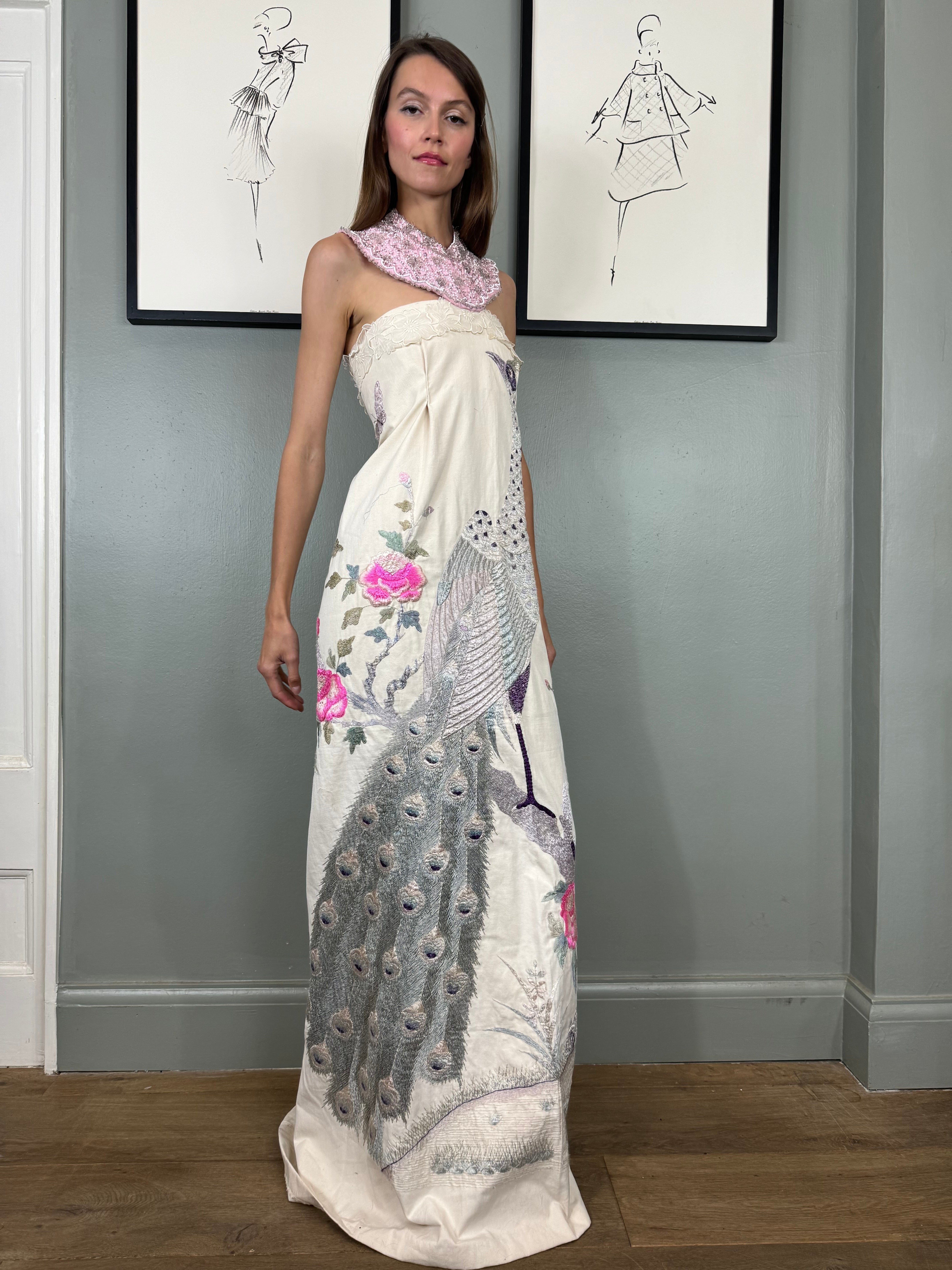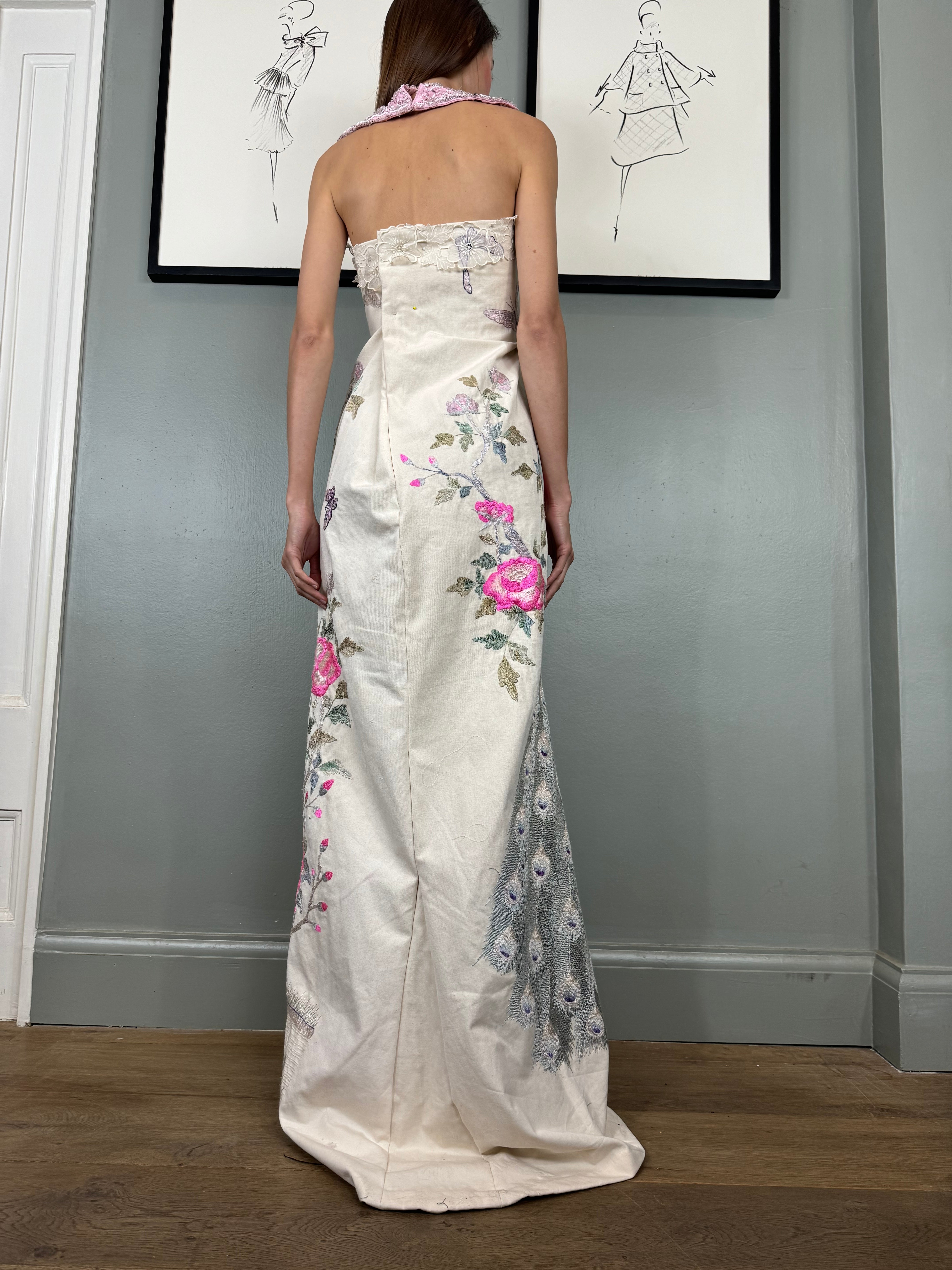 Expertly crafted from a rare 18th century embroidered Oriental fabric, the Follie dress is a true work of art. The mesmerizing column design features a densely beaded pink neckline that fastens on the back with hooks giving the illusion of a necklace, creating a flawless silhouette. A pretty floral organza trim elegantly outlines the pleated bustier. With a convenient back zipper, this dress seamlessly blends elegance and functionality.
