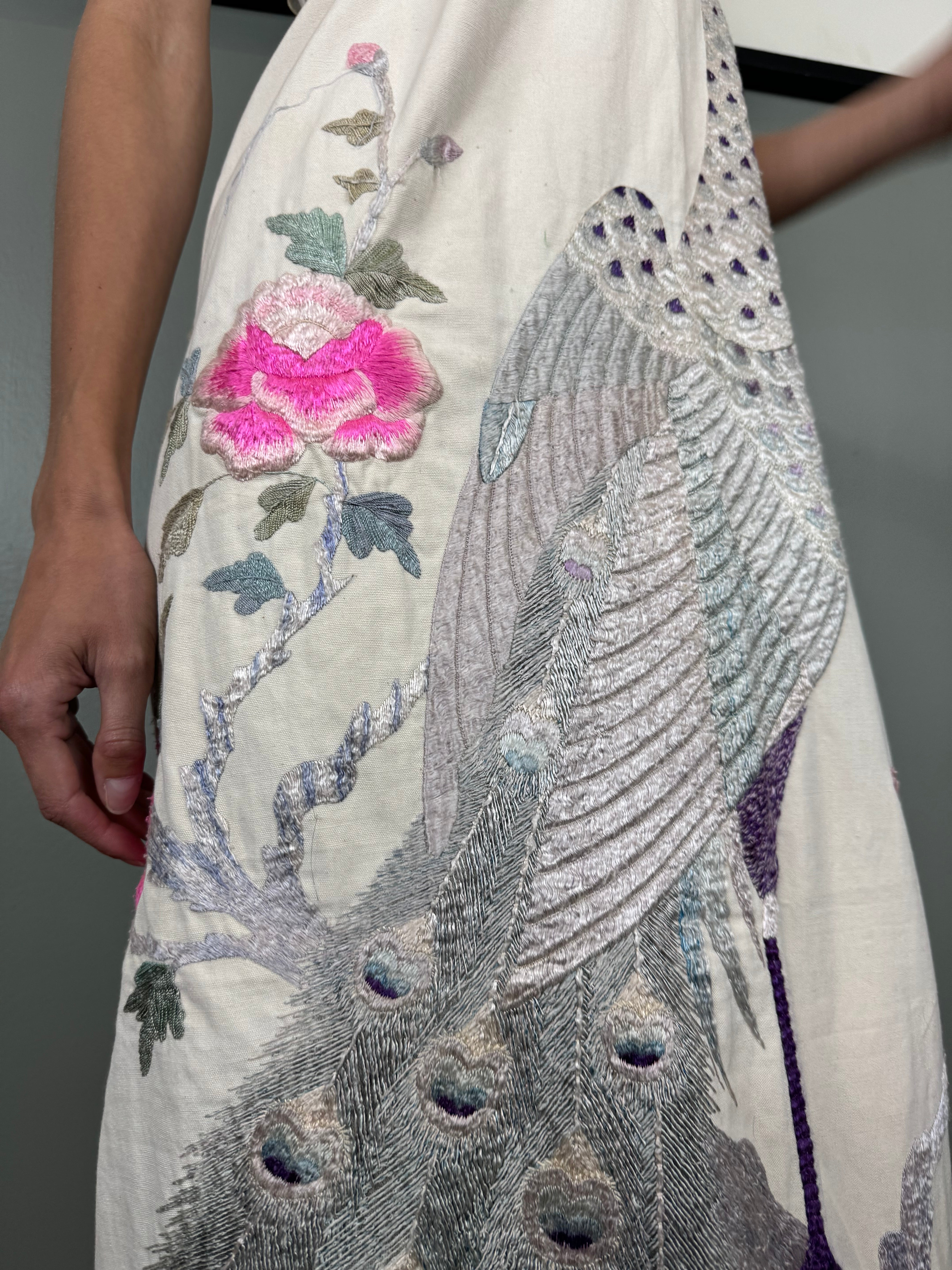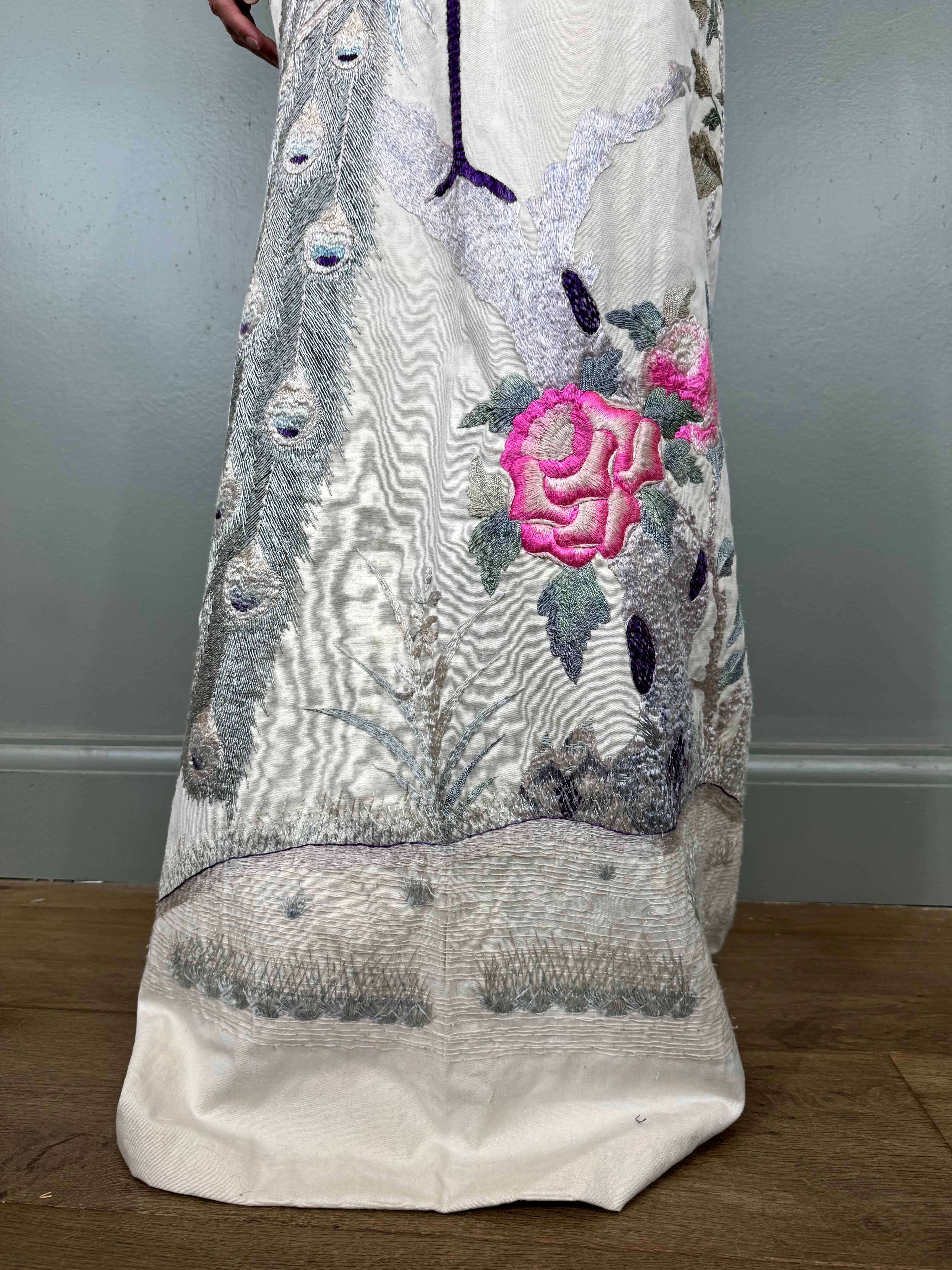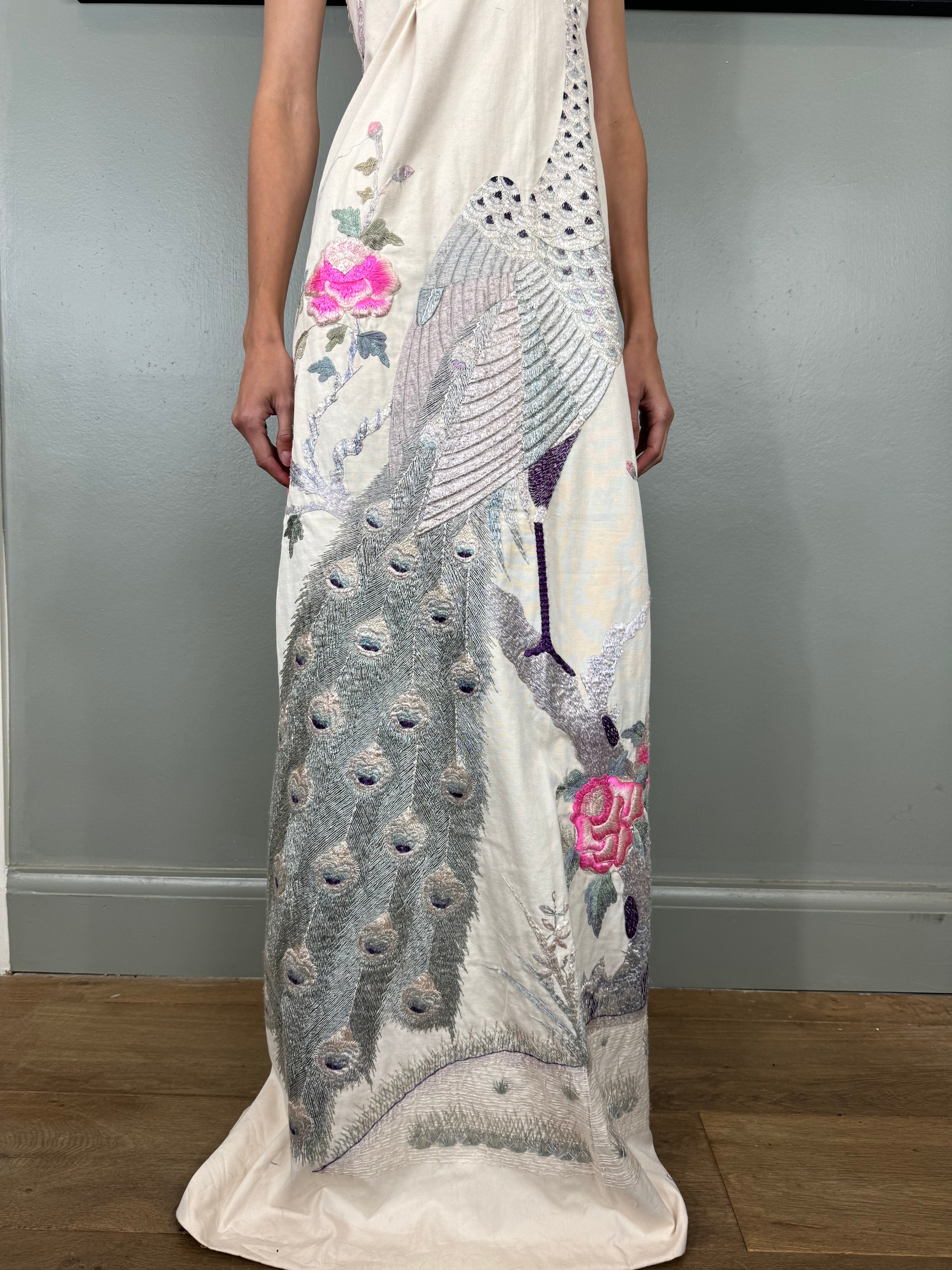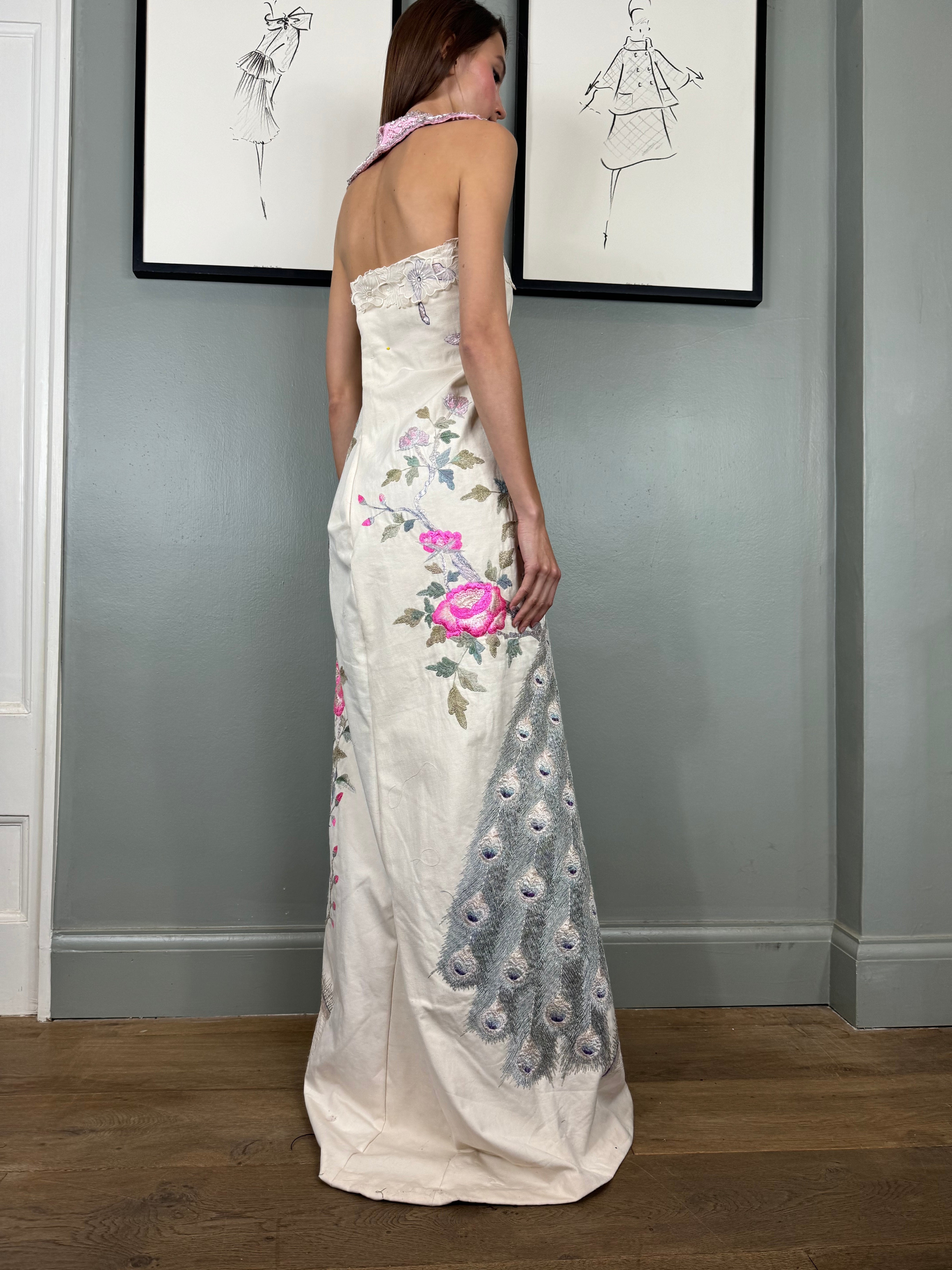 Expertly crafted from a rare 18th century embroidered Oriental fabric, the Follie dress is a true work of art. The mesmerizing column design features a densely beaded pink neckline that fastens on the back with hooks giving the illusion of a necklace, creating a flawless silhouette. A pretty floral organza trim elegantly outlines the pleated bustier. With a convenient back zipper, this dress seamlessly blends elegance and functionality.