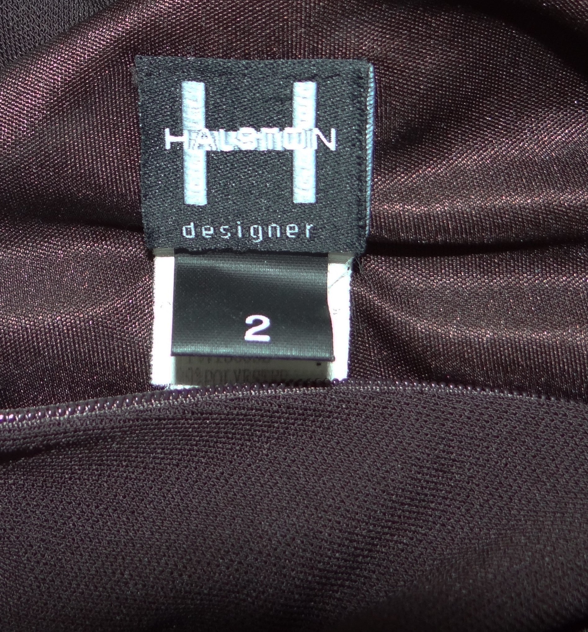 A glamorous, backless halter dress in heavy brown jersey by Halston. The dress hangs off a gold leather collar and plunges deeply to the waist, ending at calf length. It is extremely flattering and hugs the body with all the glamour of the legendary Studio 54. Fully lined with back zip and soft boning at the sides for exceptional shape.