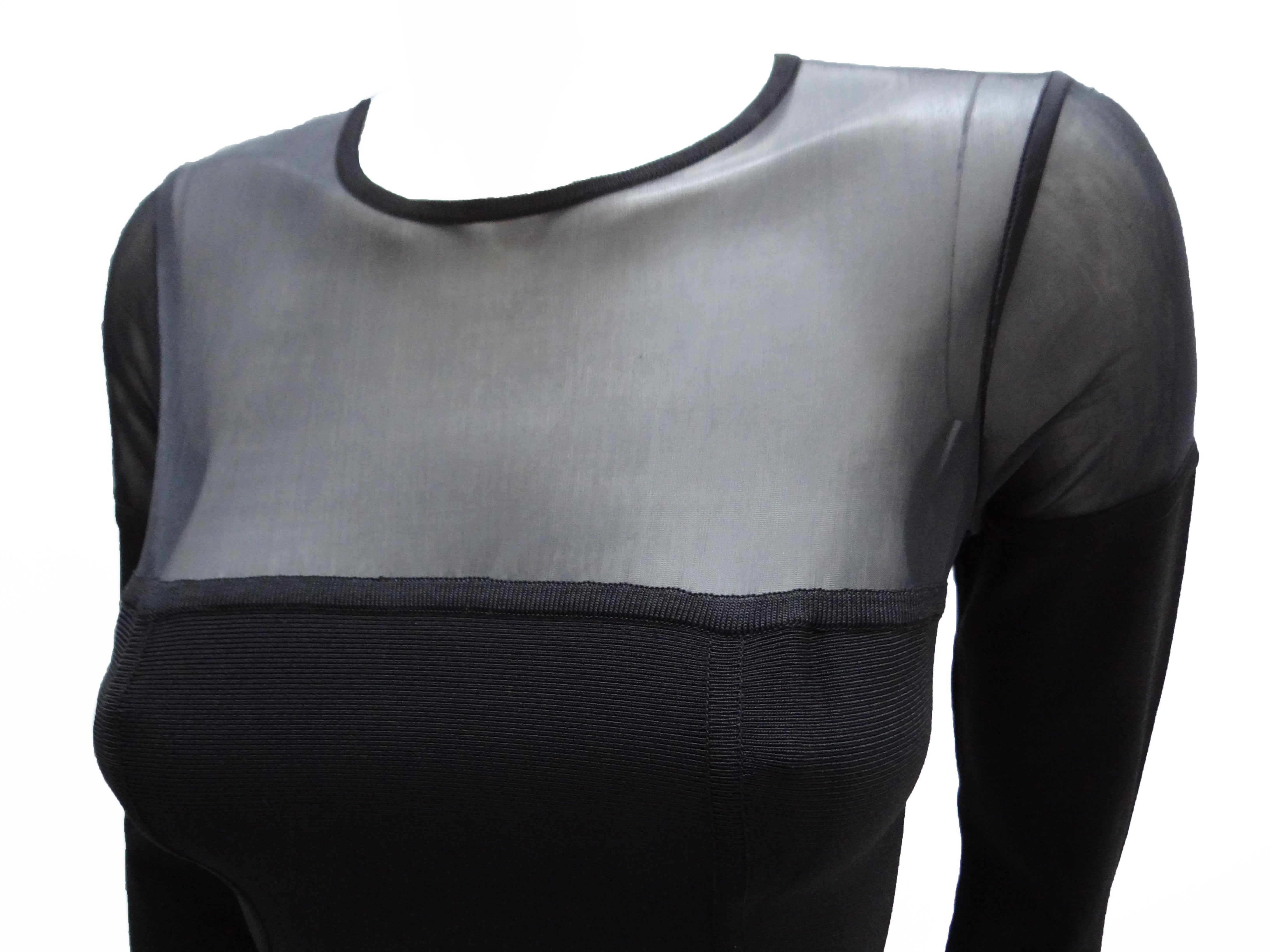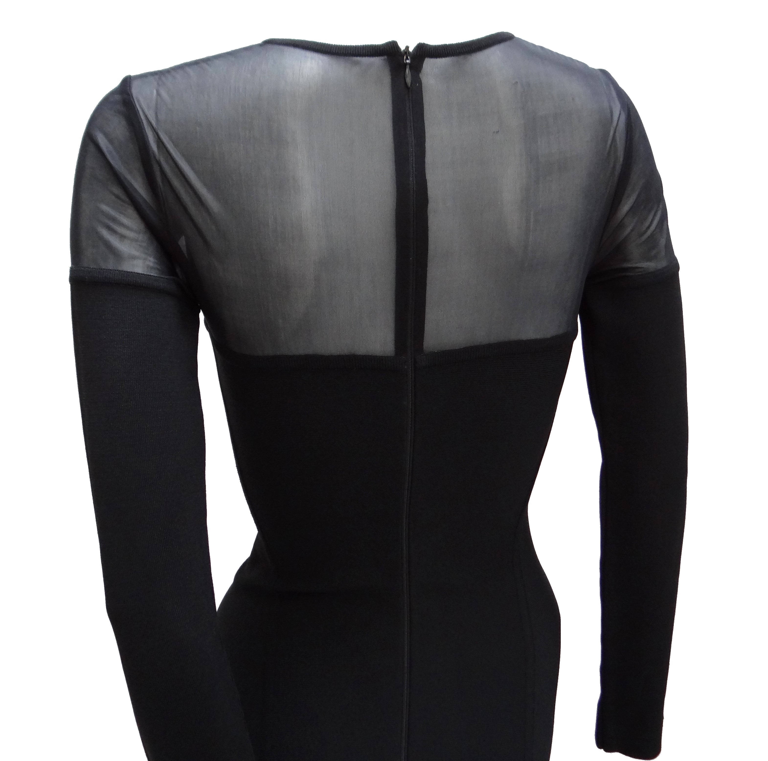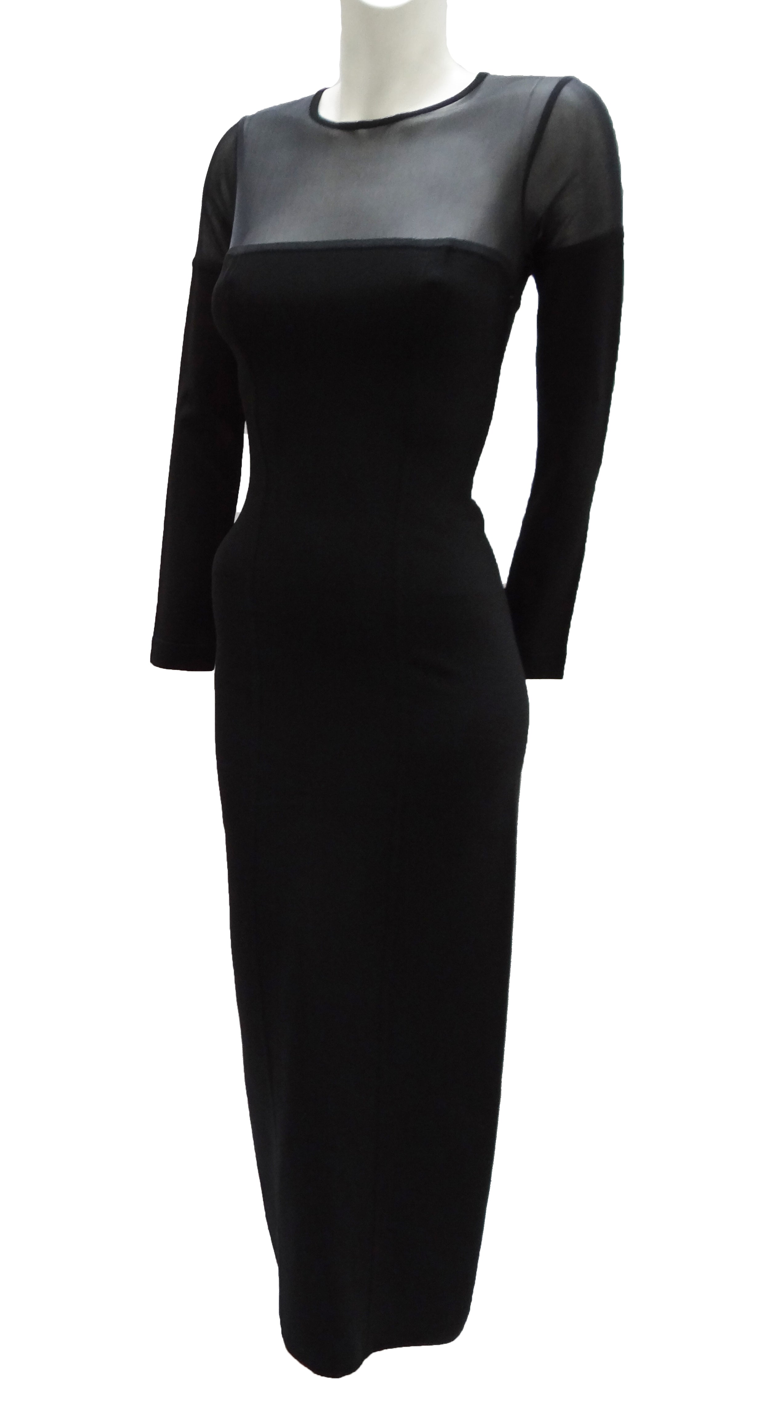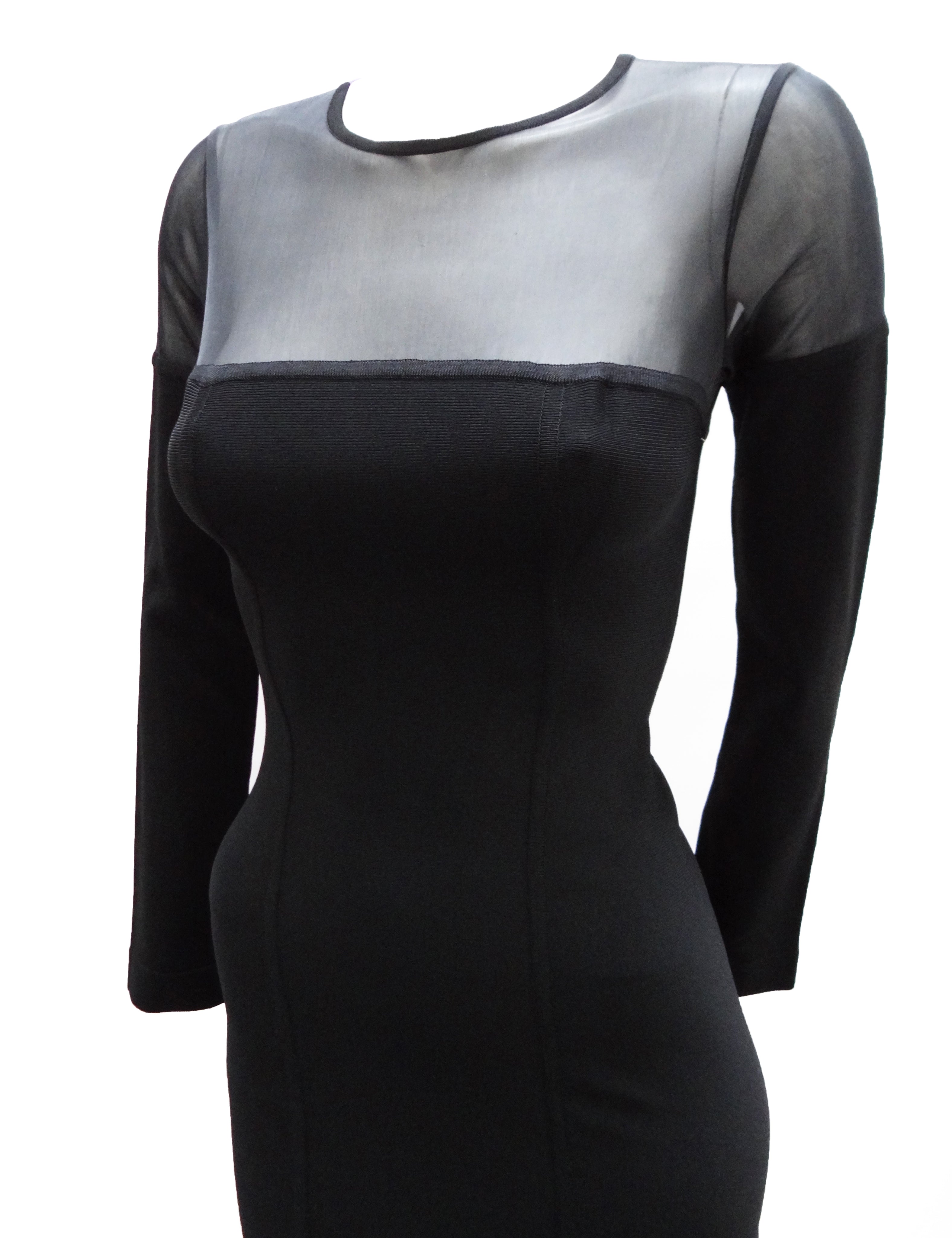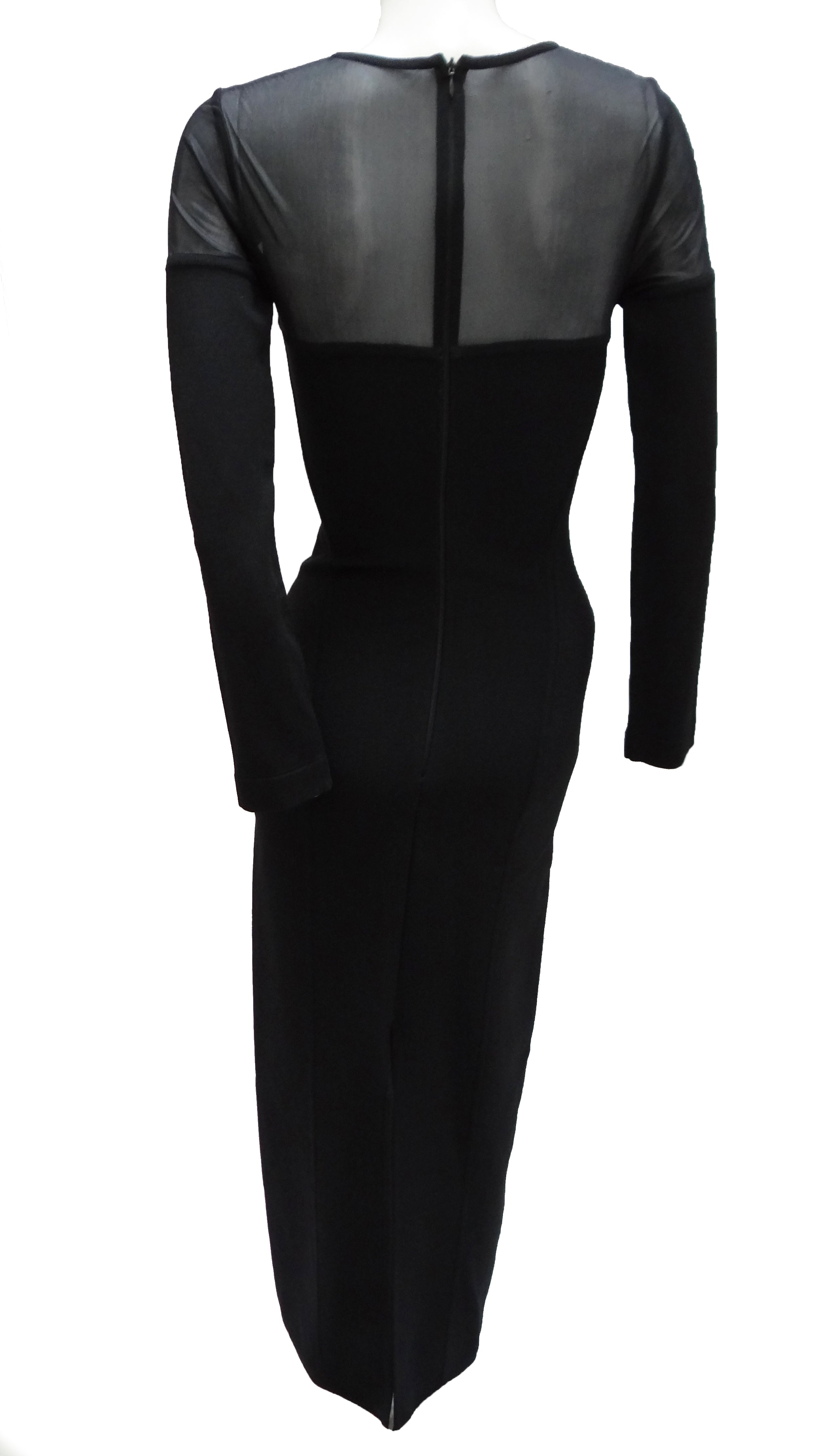 The shoulders and top of the bodice are made from transparent black fabric with a round neck and long sleeves. Back zip fastening.