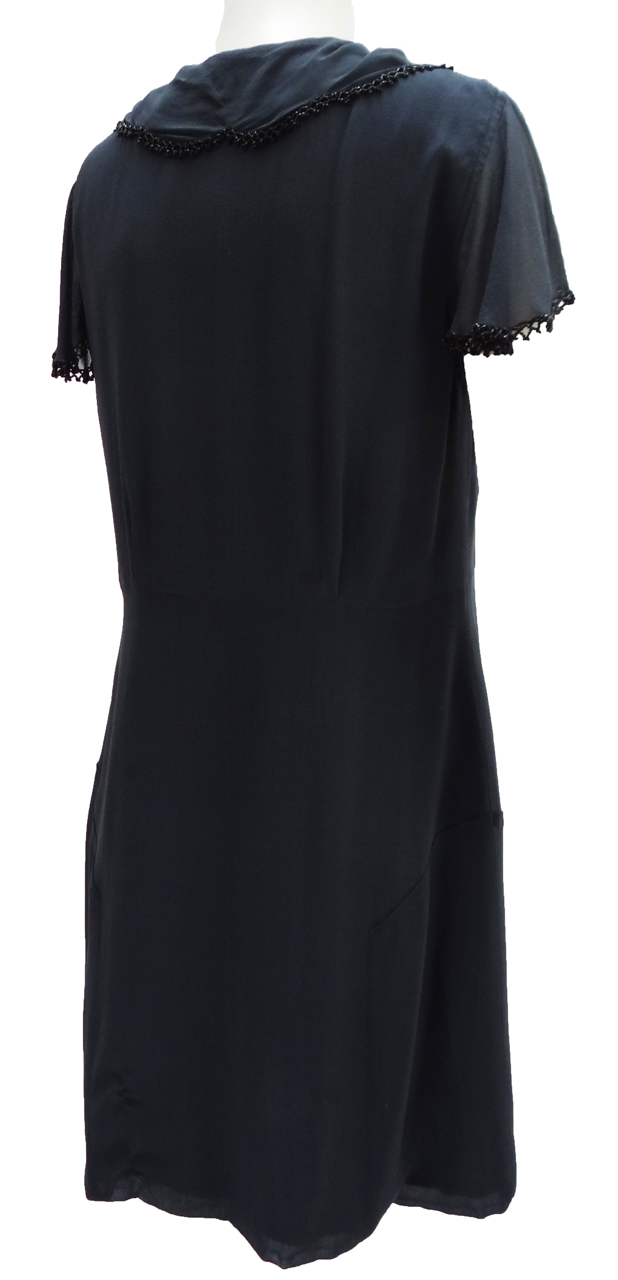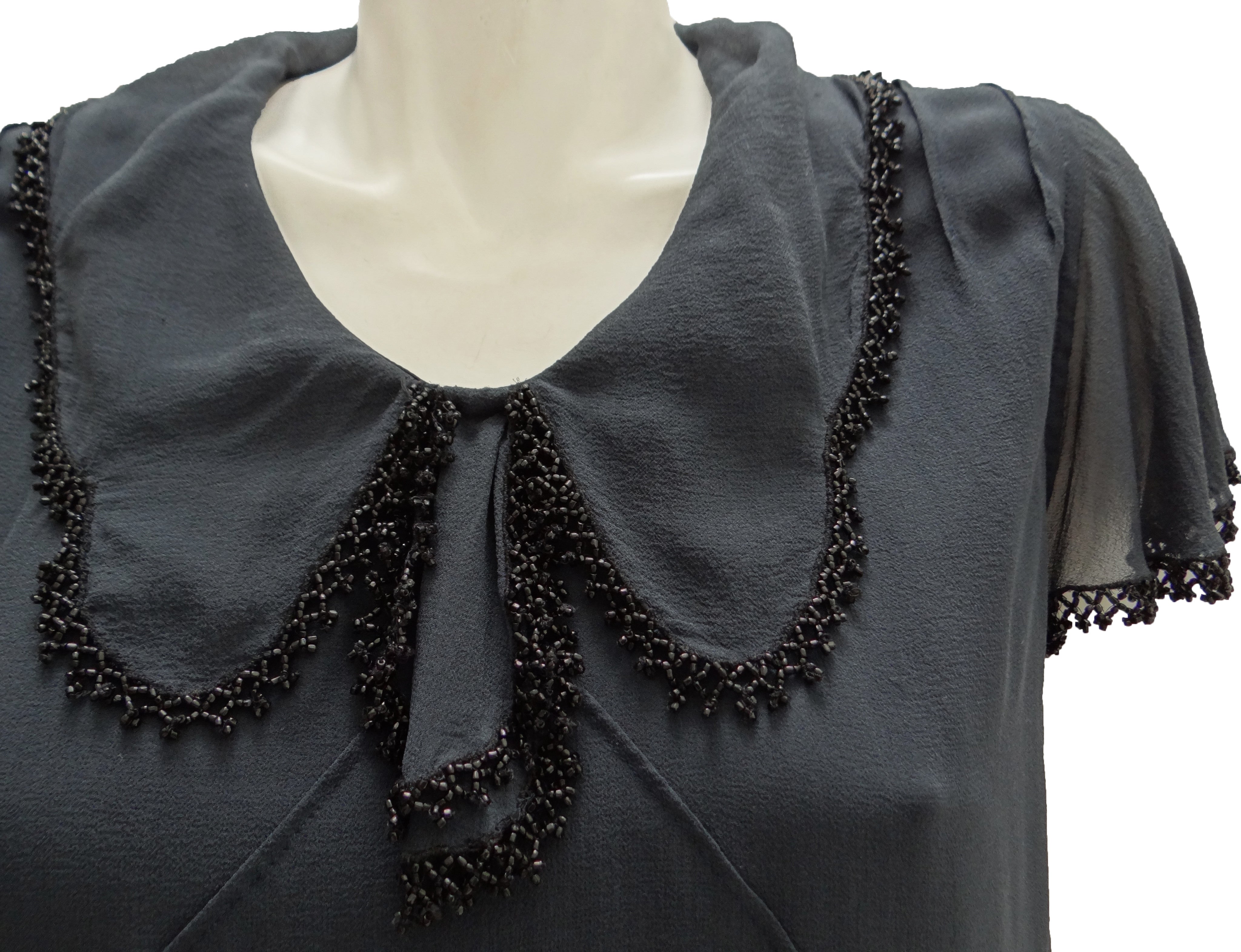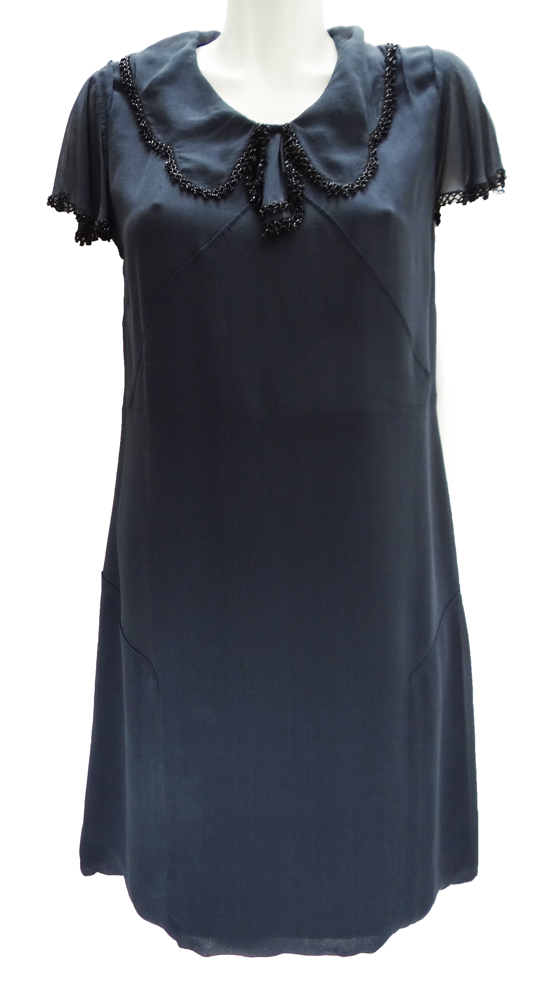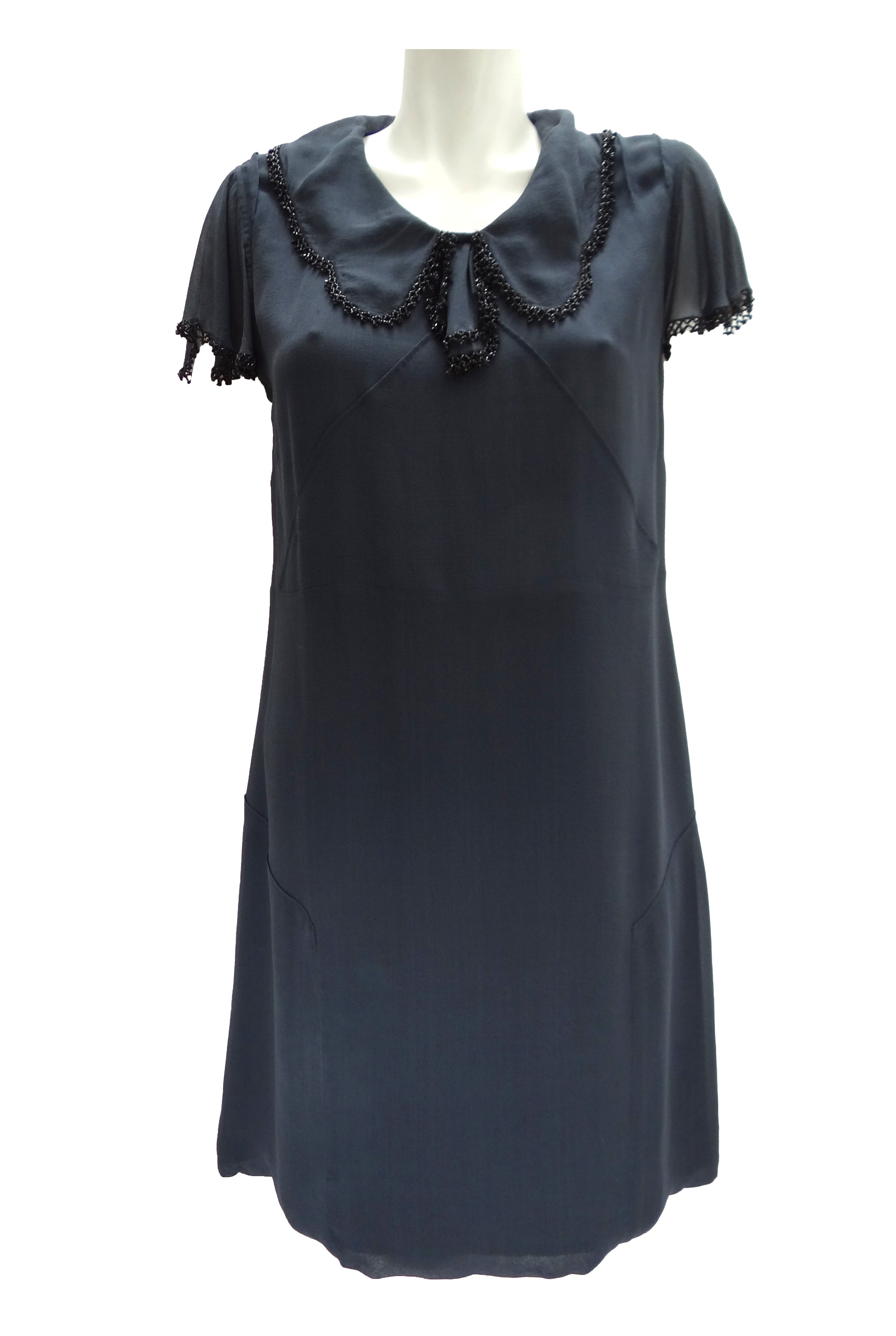A lovely shift dress in charcoal grey silk chiffon by Nicole Farhi.  The dress has short fluted sleeves and a wide floppy collar, both with delicate beaded trim in black. It has a hidden side zip, is fully lined and just above knee length.